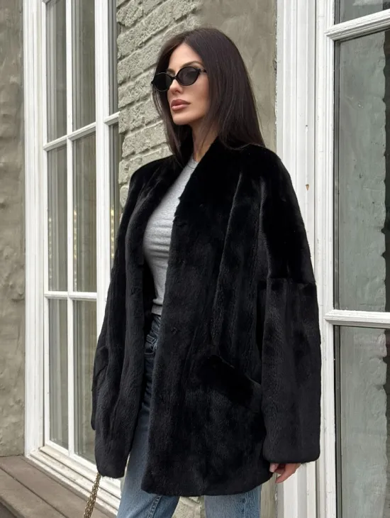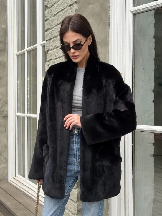 Жакет - шуба из норки BLACKGLAMA с V-образным воротником, косыми карманами