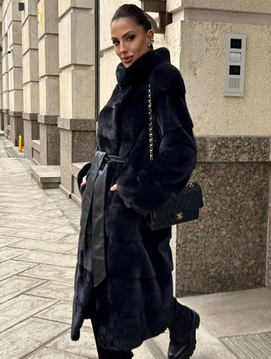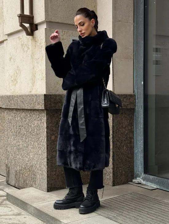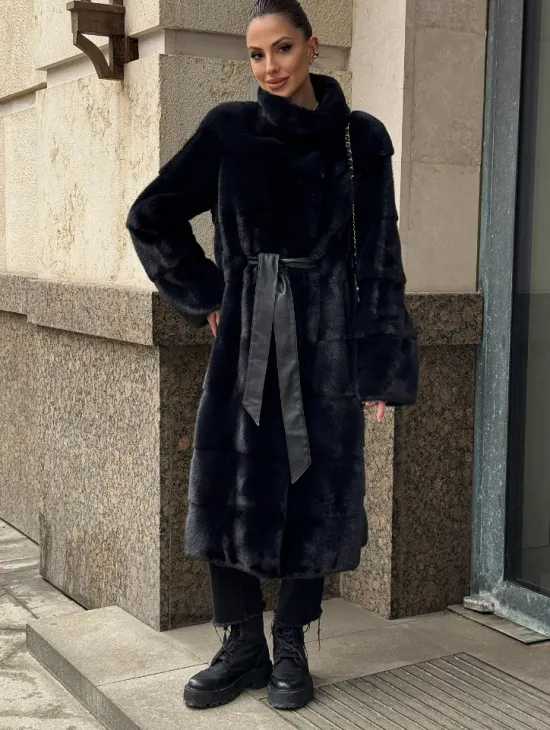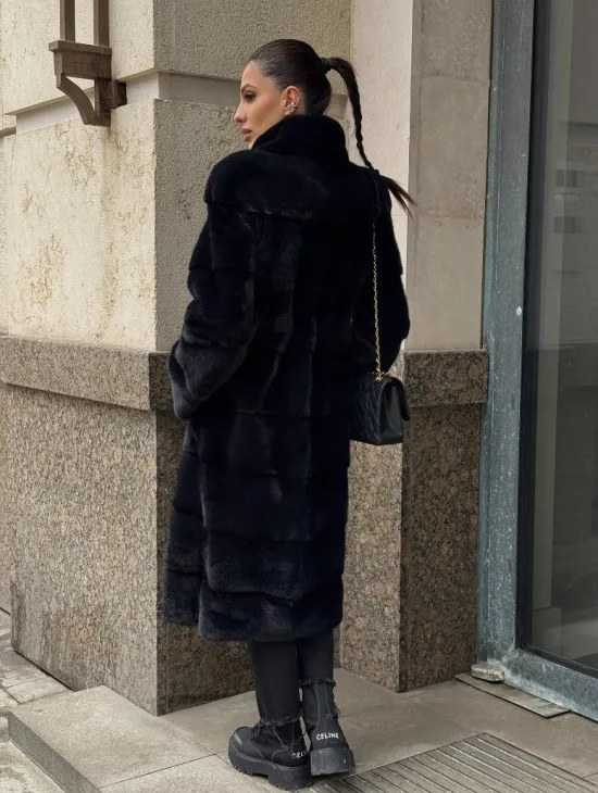 Шуба из плюшевой скандинавской норки в сине-черном цвете - стойка воротник
