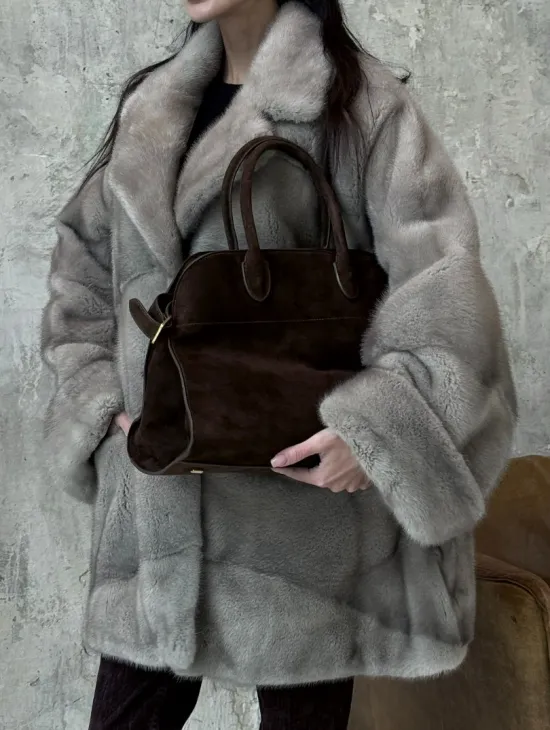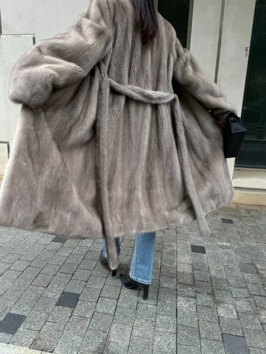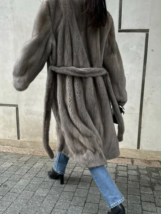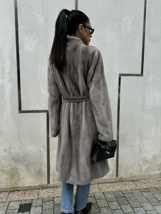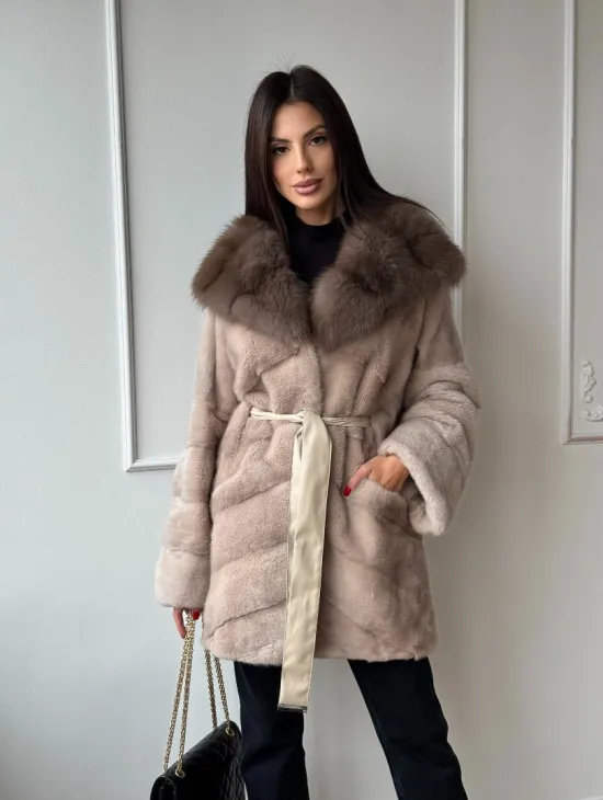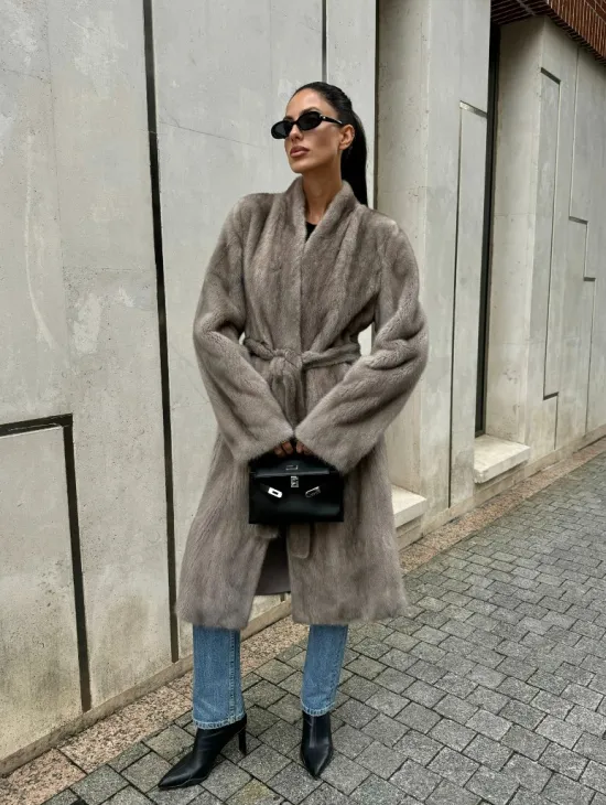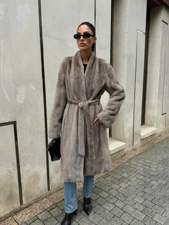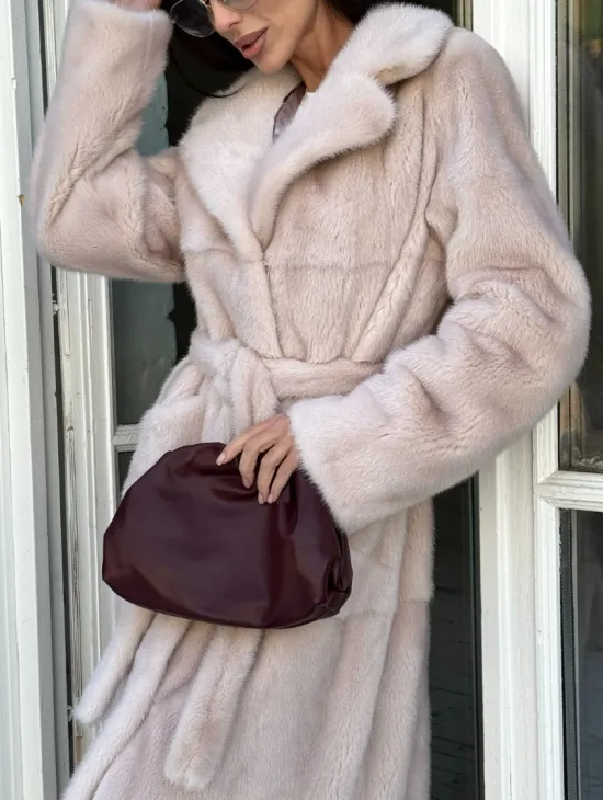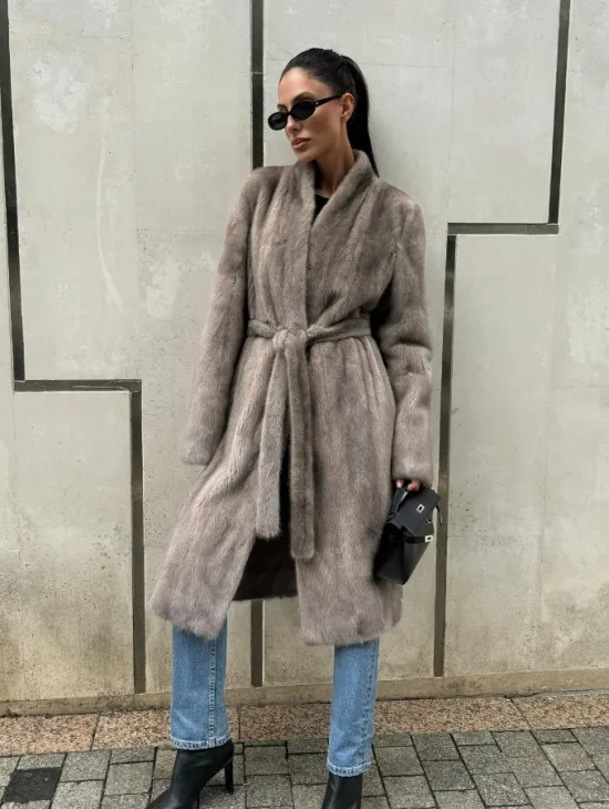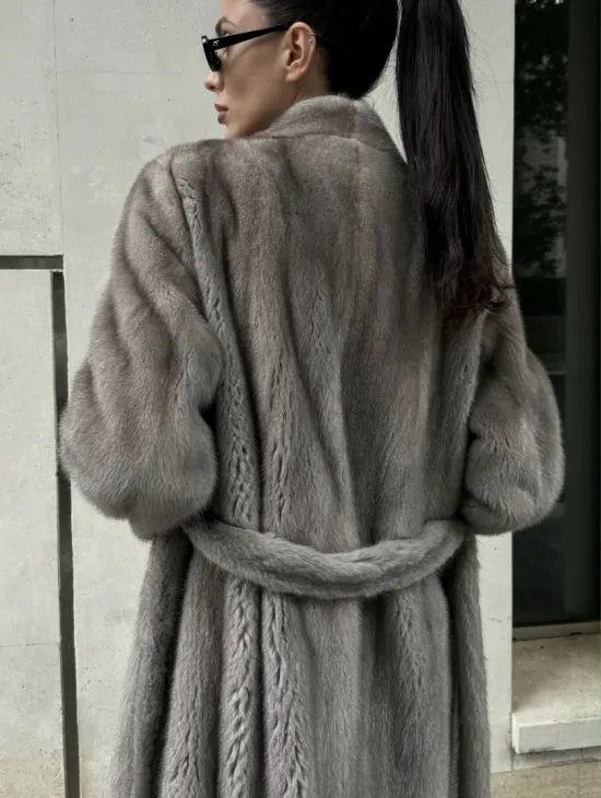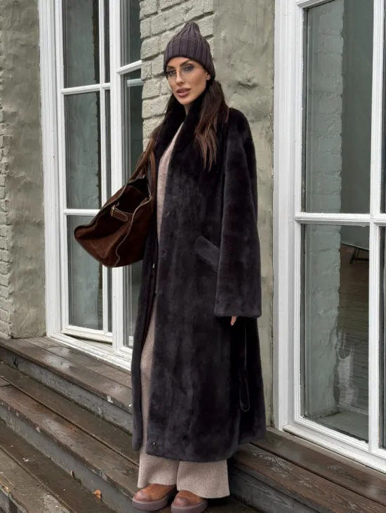Роскошная шуба из аукционной норки Premium Velvet с V-образным воротником и меховым поясом - горький шоколад