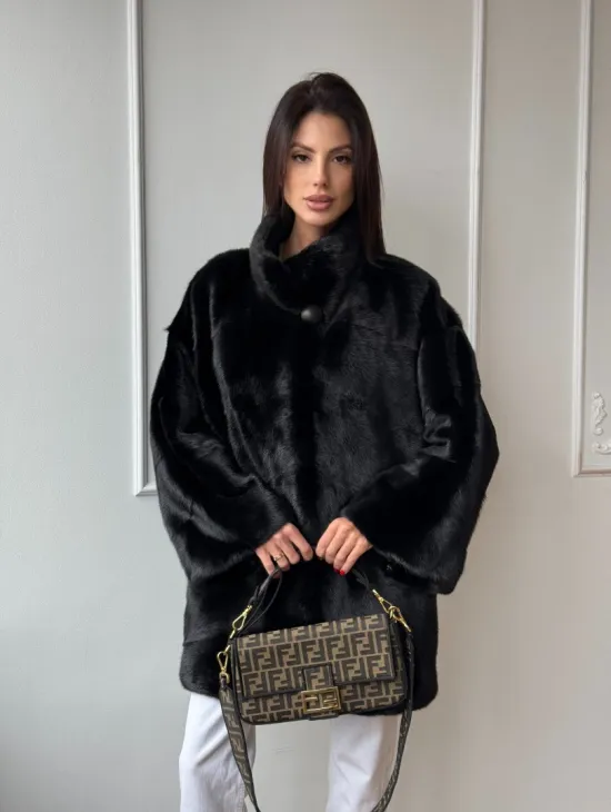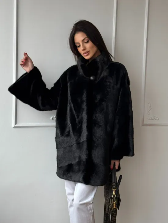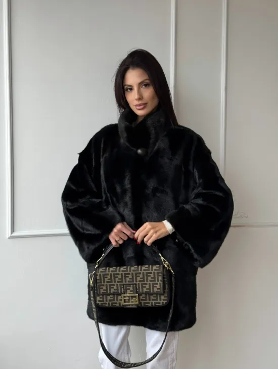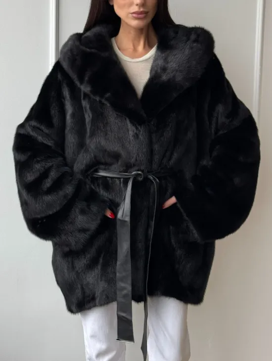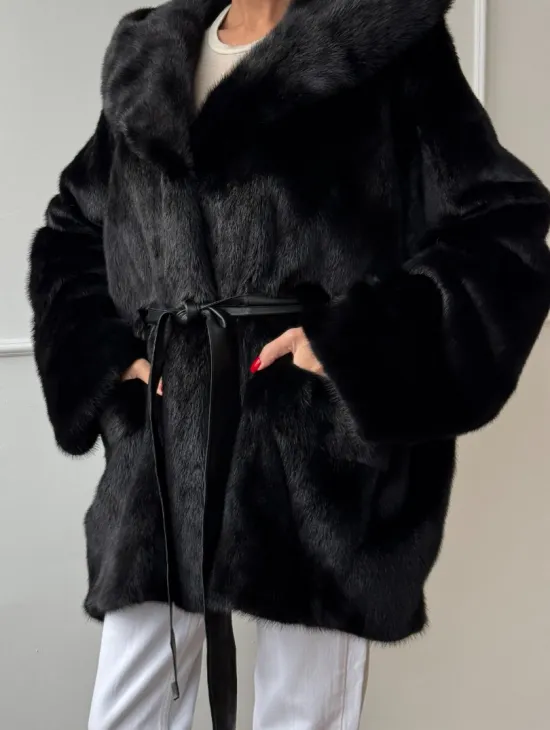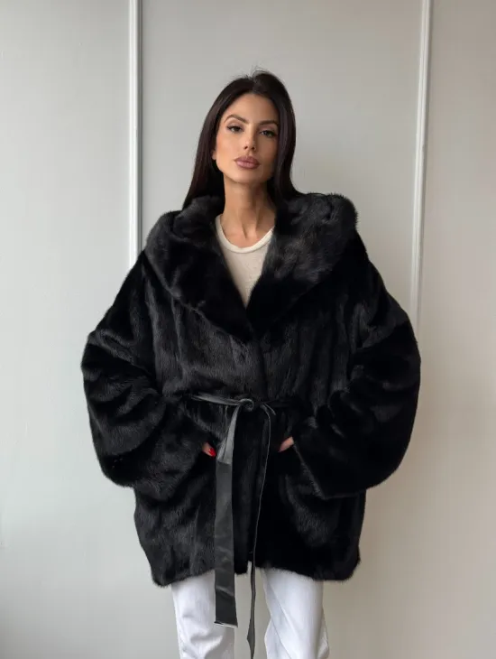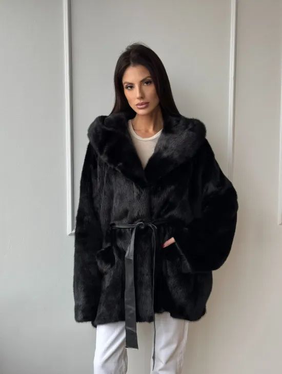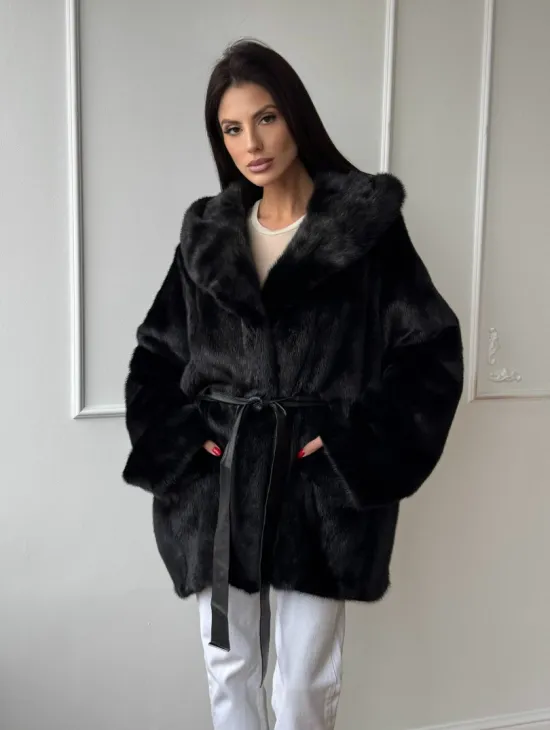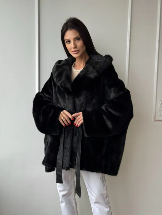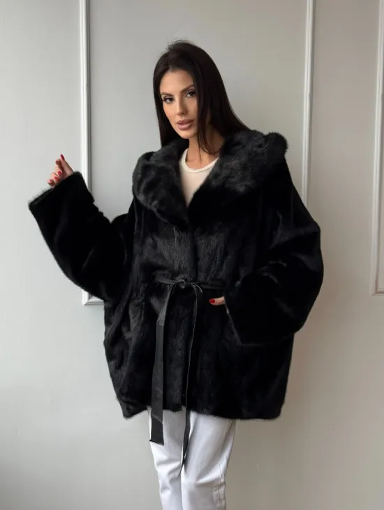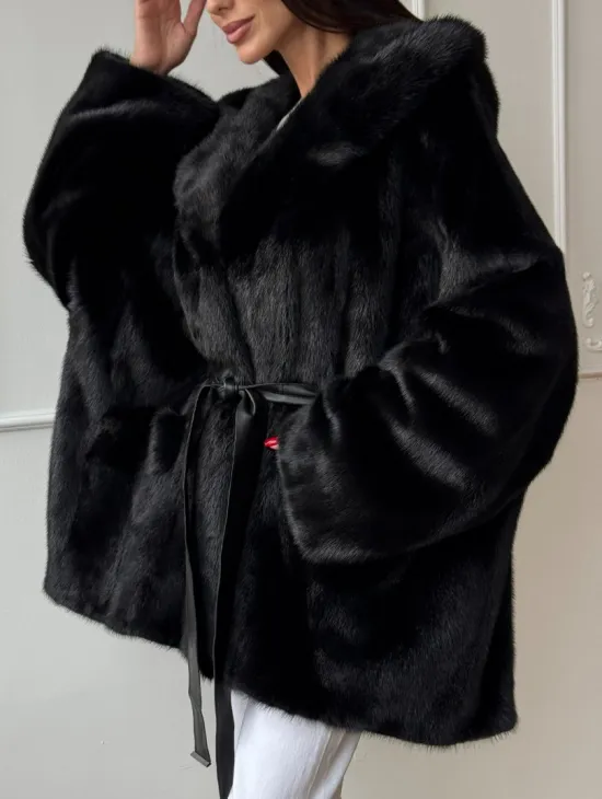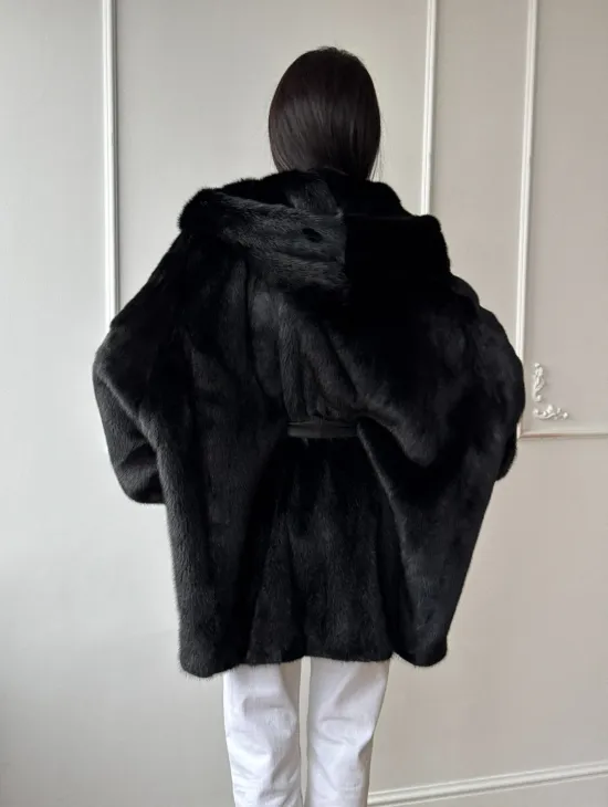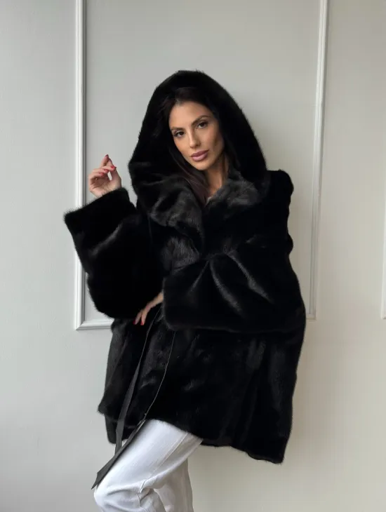 Летучая мышь шуба из черной норки с меховым капюшоном - оверсайз