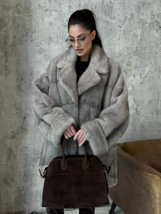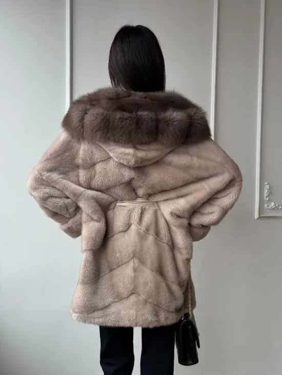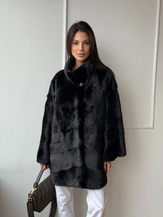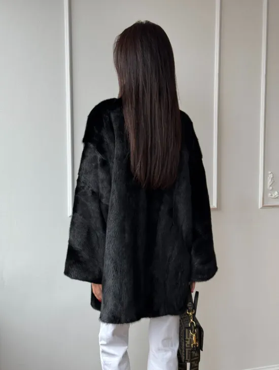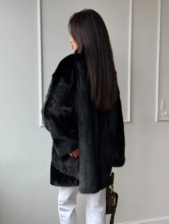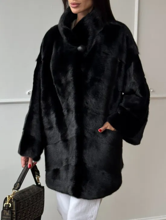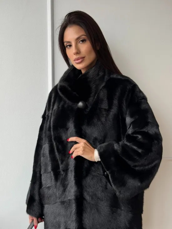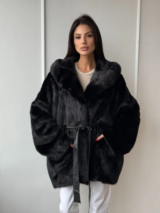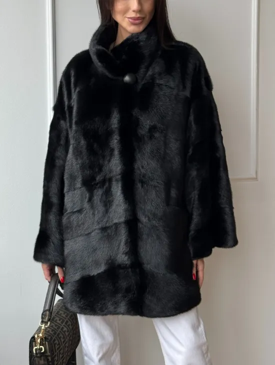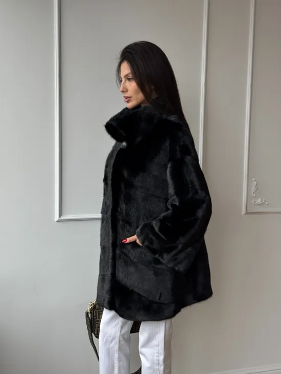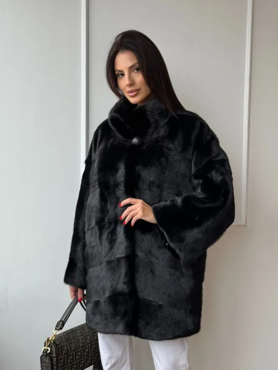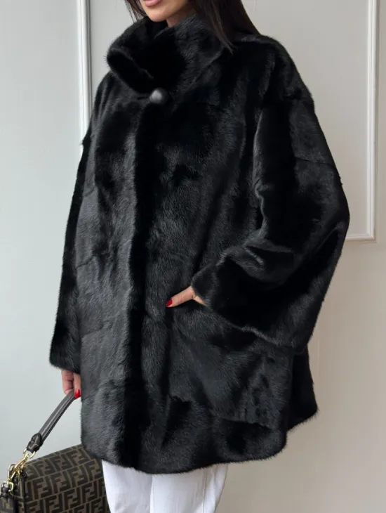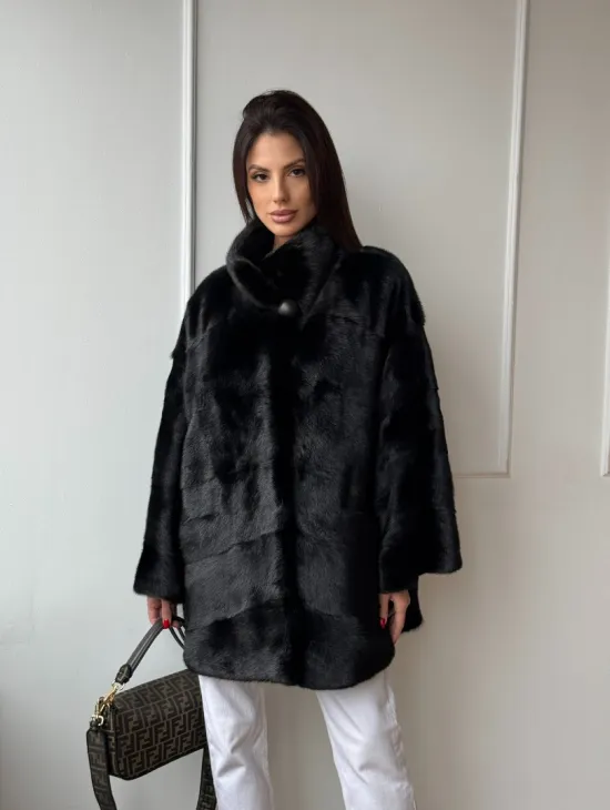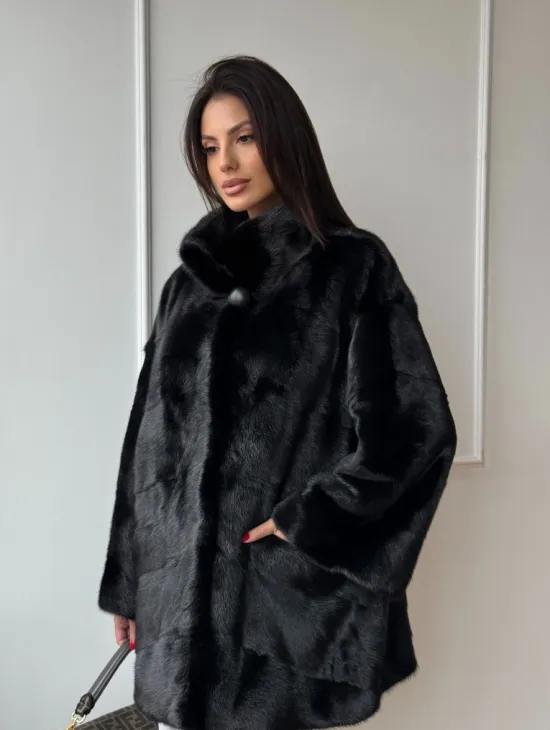 Летучая мышь шуба из черной норки с меховым капюшоном - оверсайз