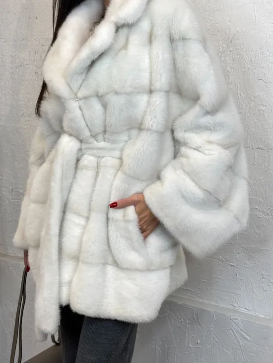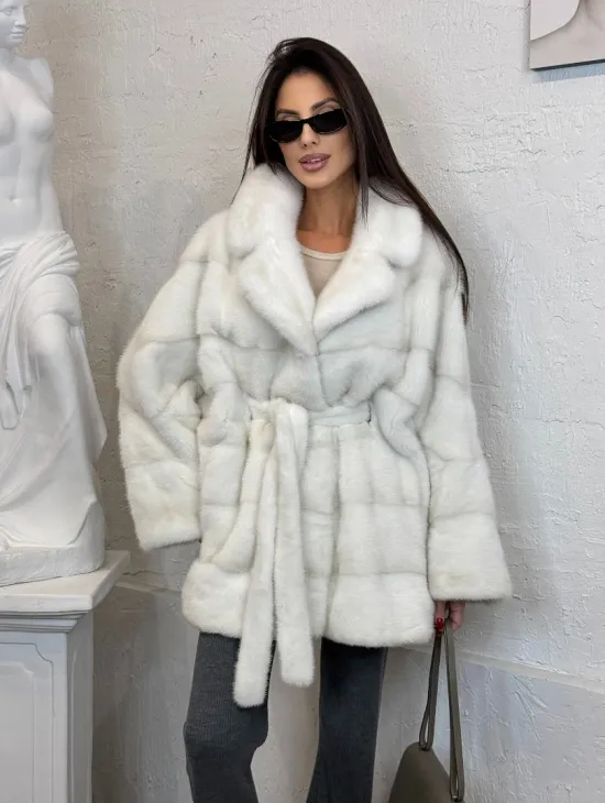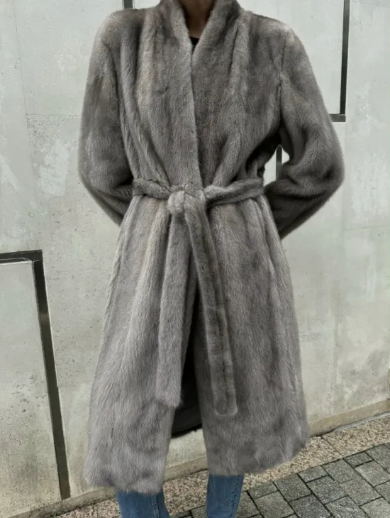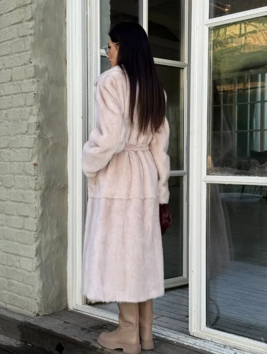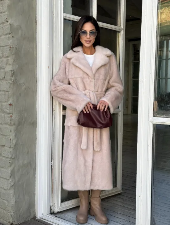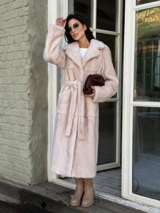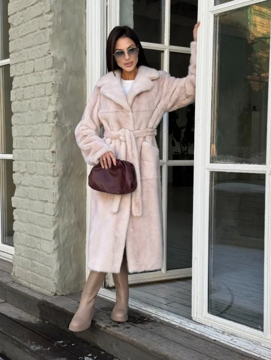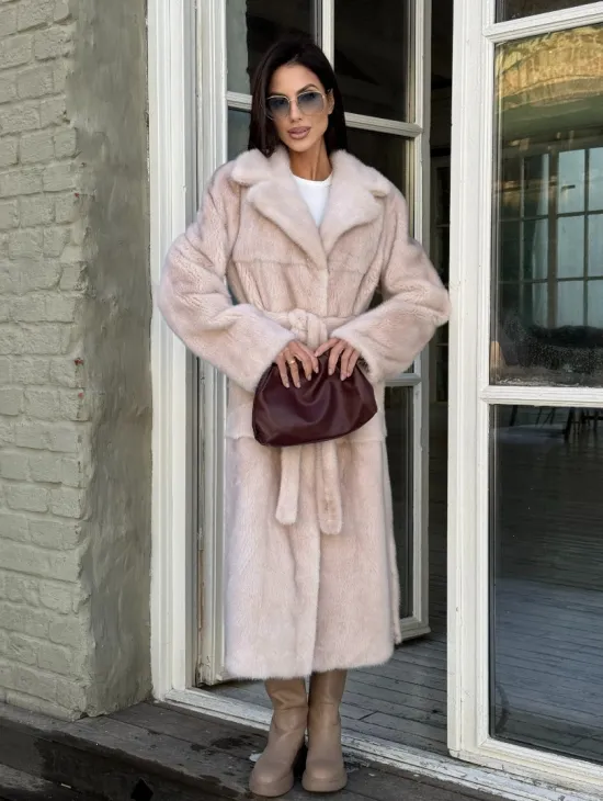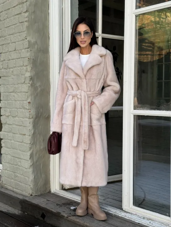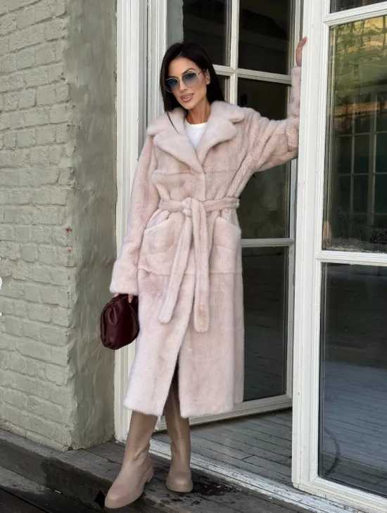 Женская норковая шуба прямого кроя с разрезами по бокам, пояс