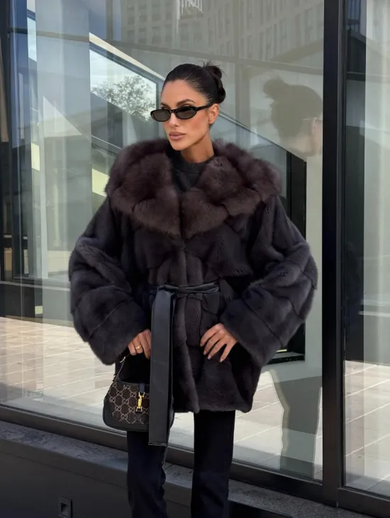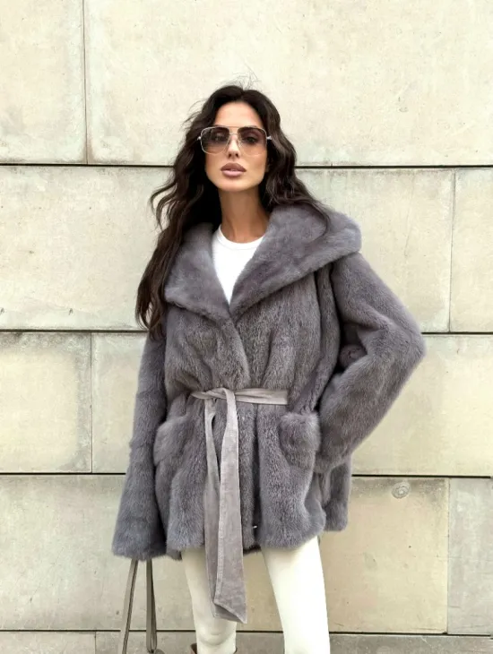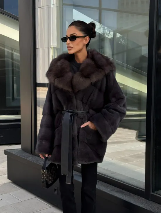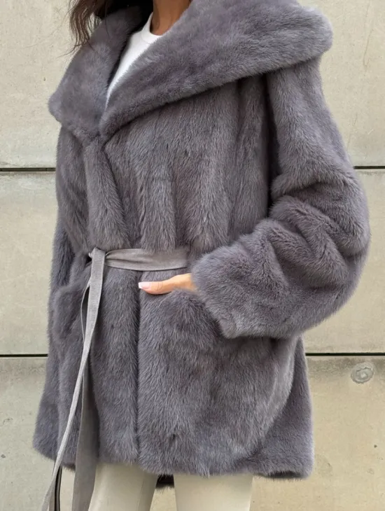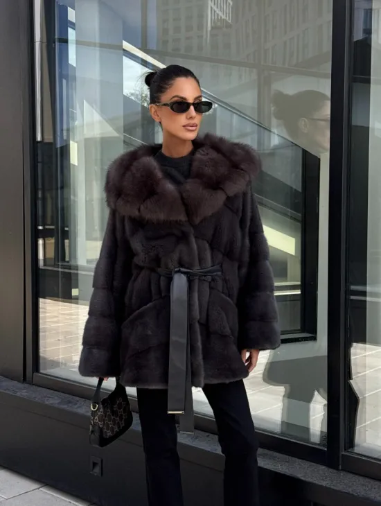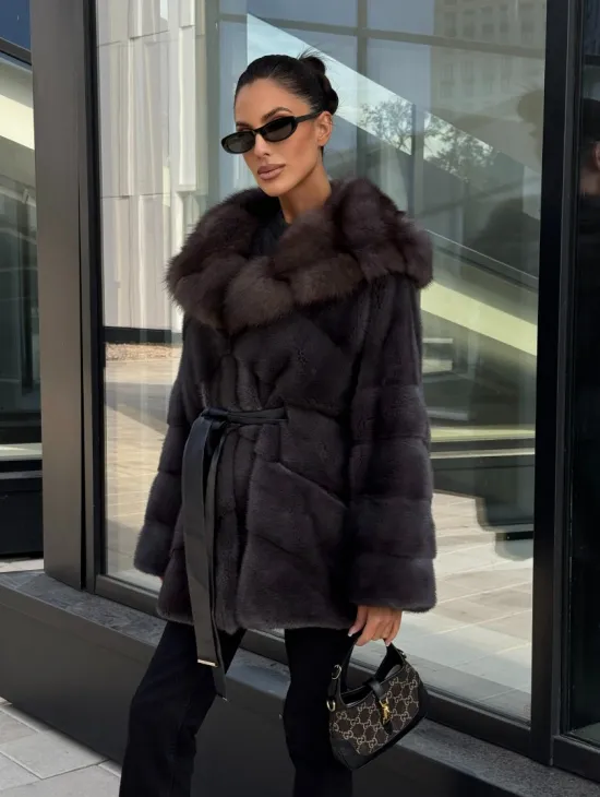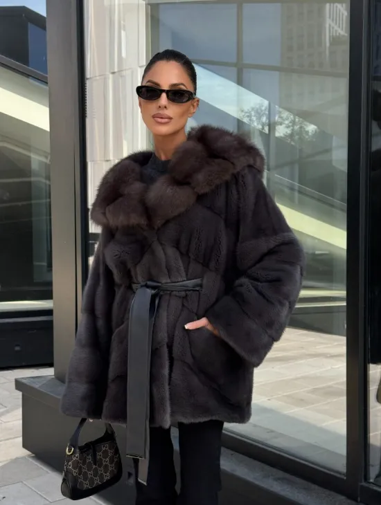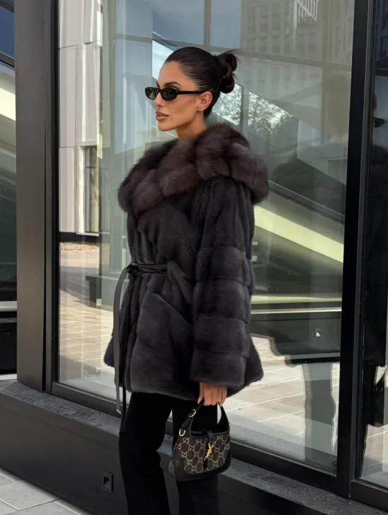 Норковый полушубок с меховым капюшоном из куницы, цвет графит