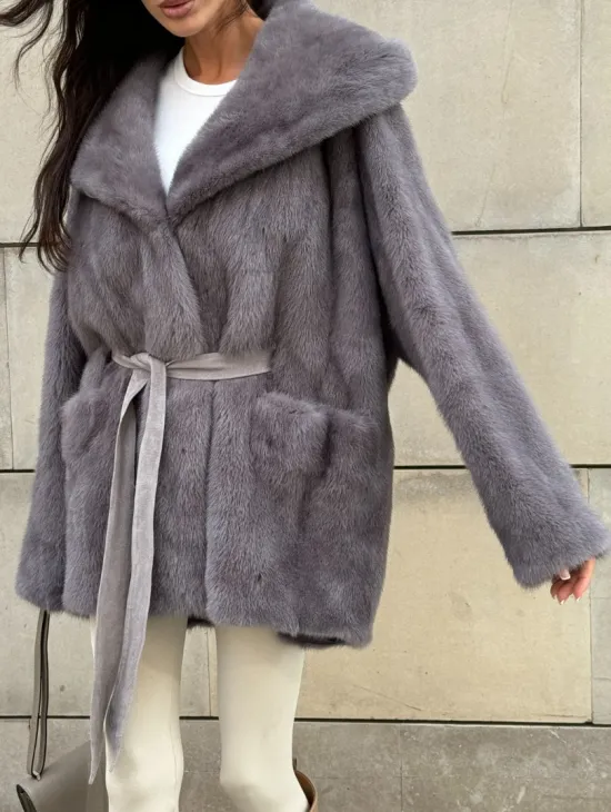 Шуба Летучая мышь из меха норки в технологии роспуск с капюшоном - цвет дымчато-серый