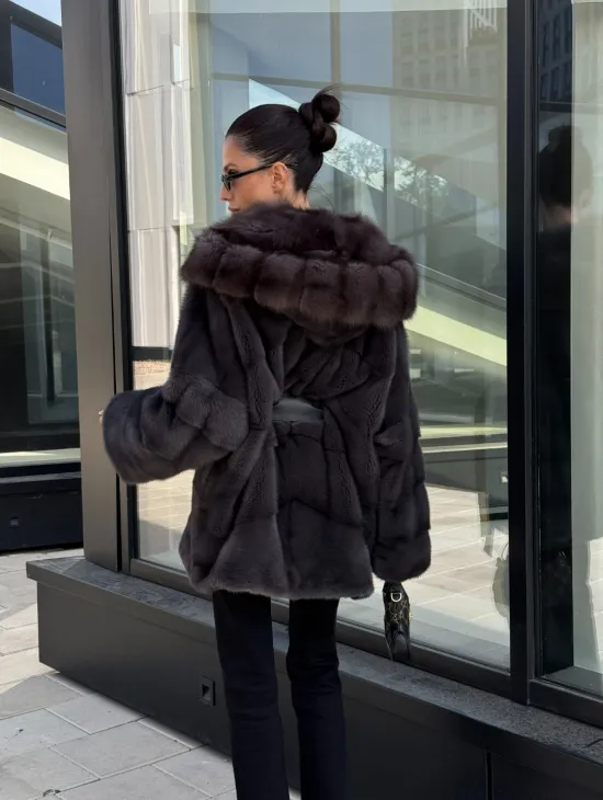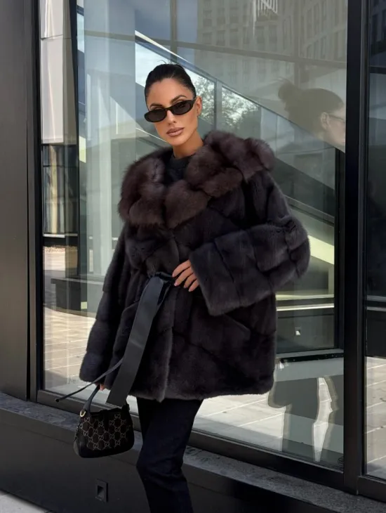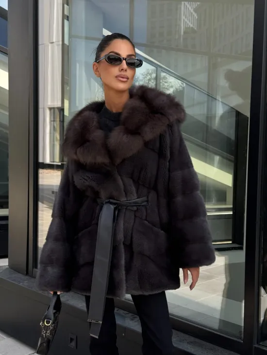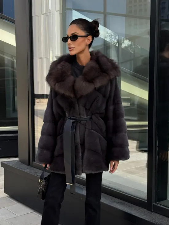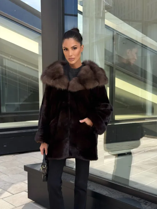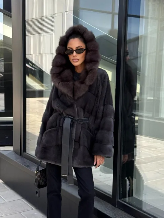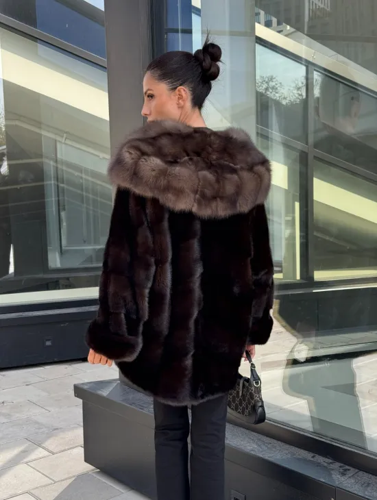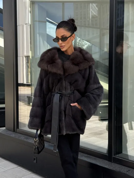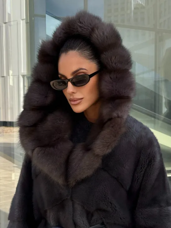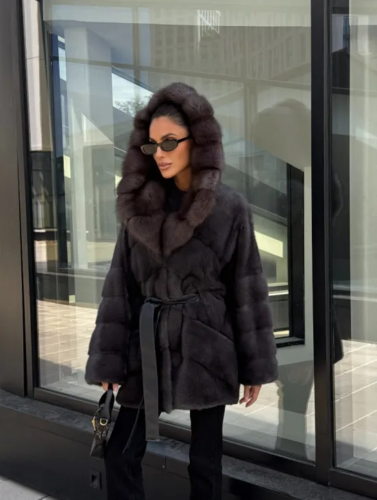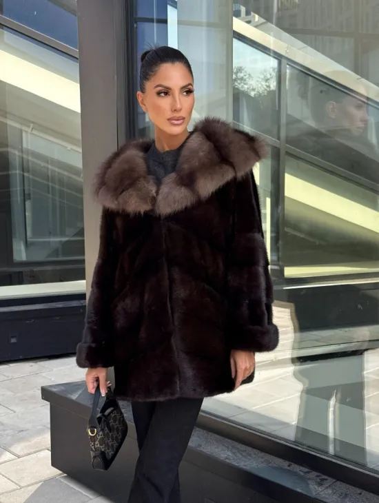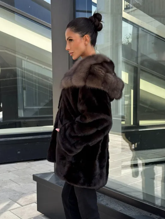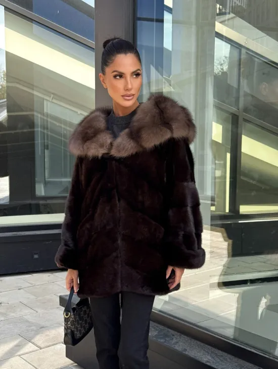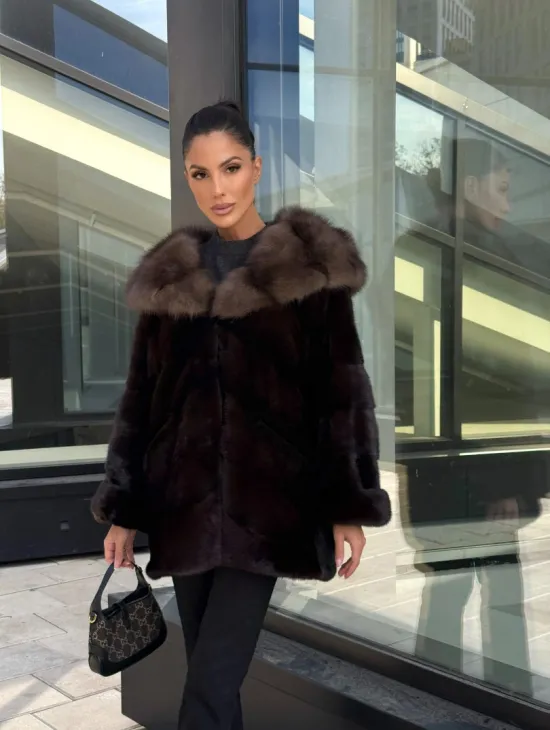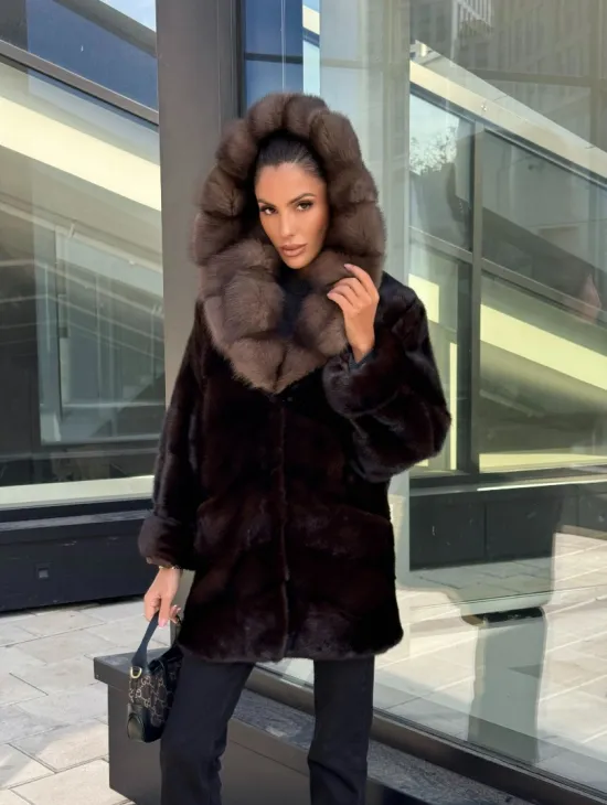 Шуба автоледи из меха норки с капюшоном из куницы - цвет шоколад