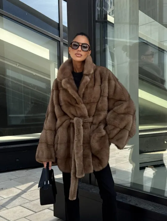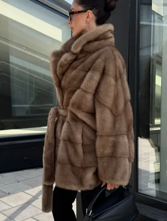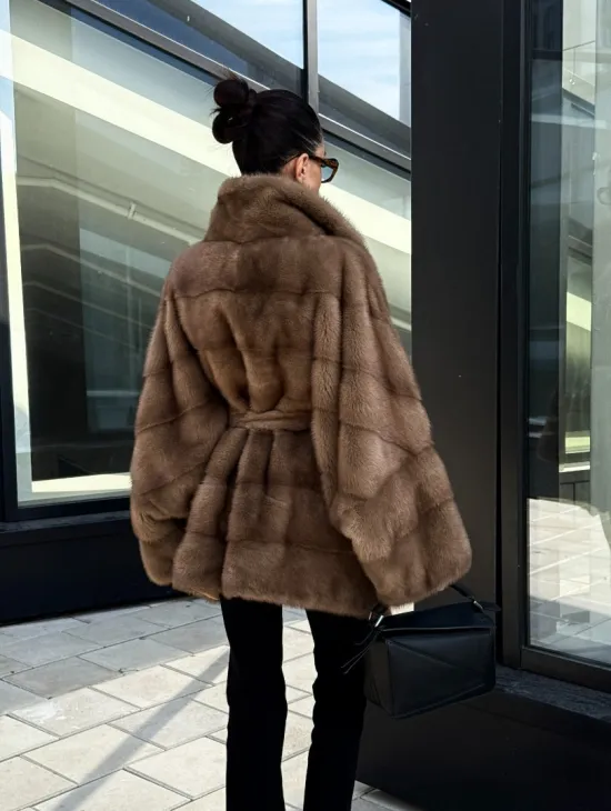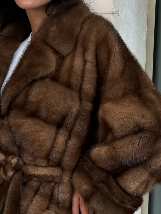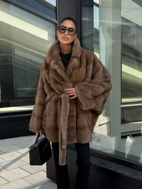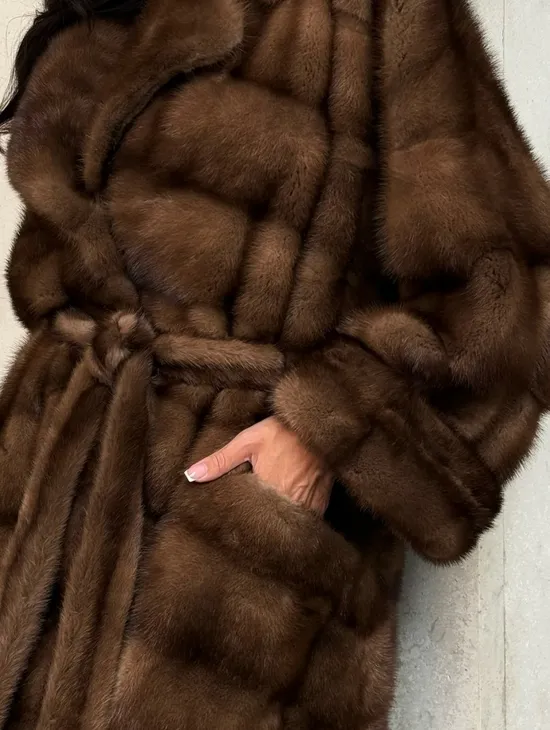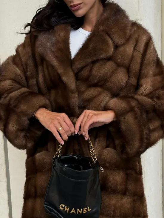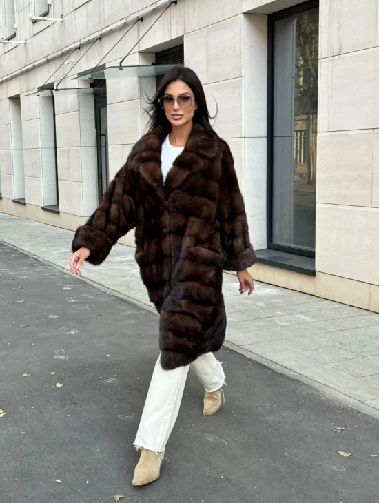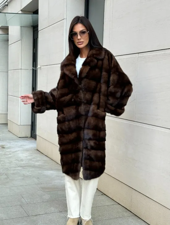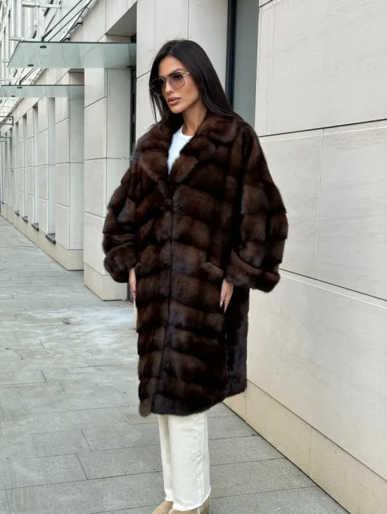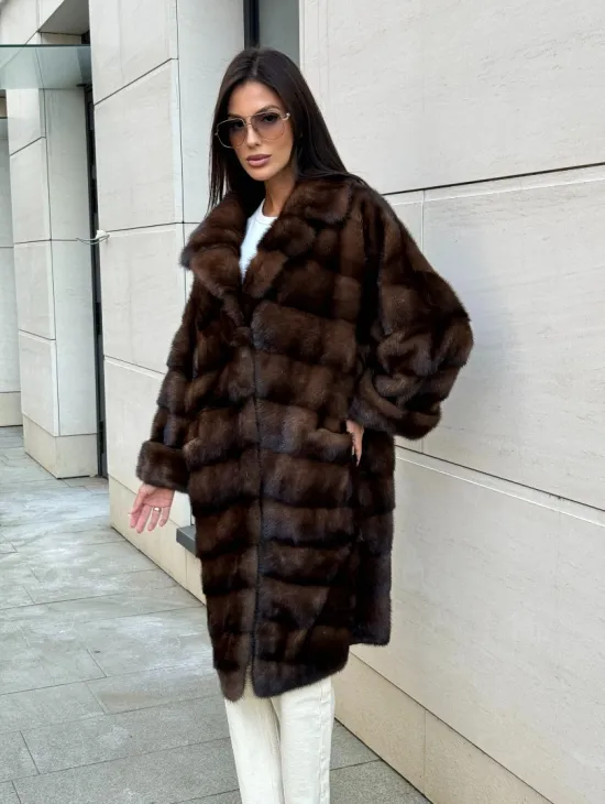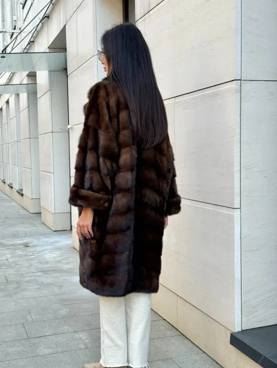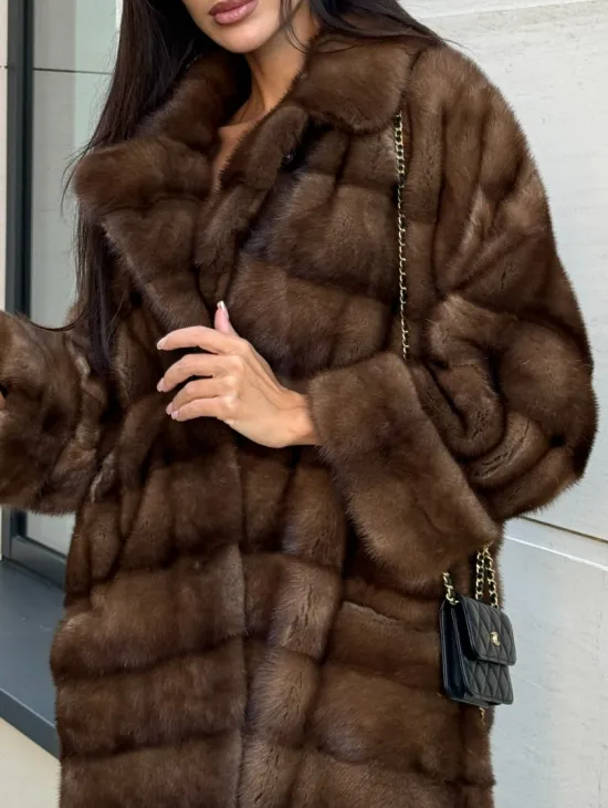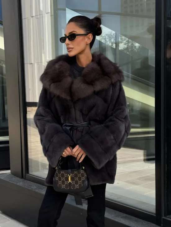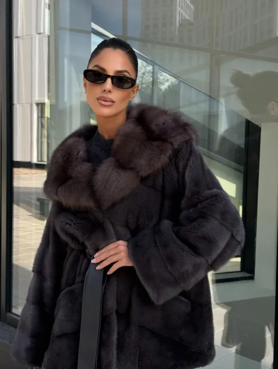 Шуба автоледи из меха норки с капюшоном из куницы - цвет шоколад