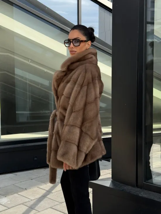 Шуба натуральная из меха норки английский воротник - цвет соболь