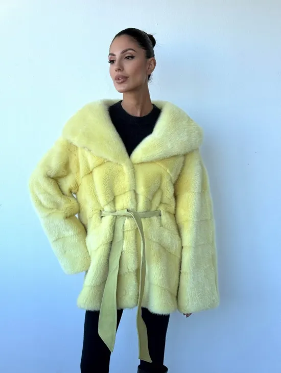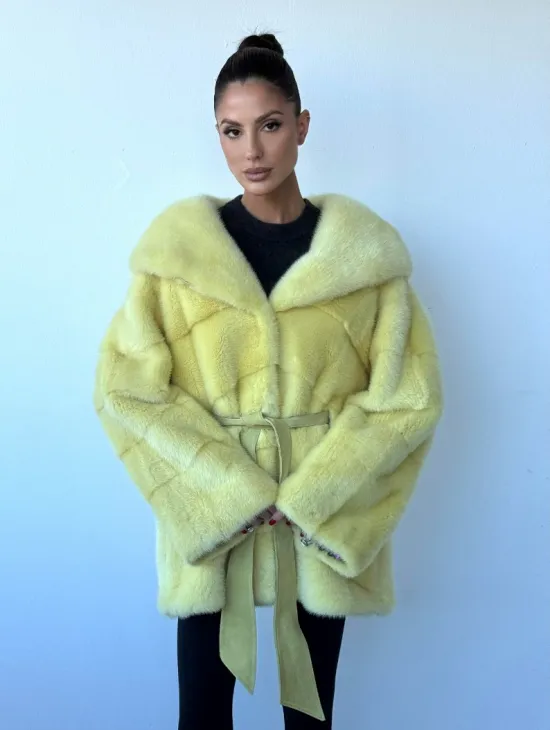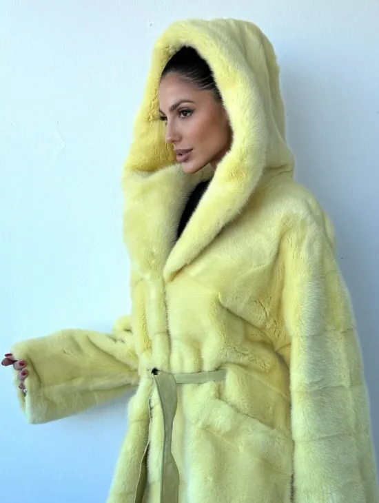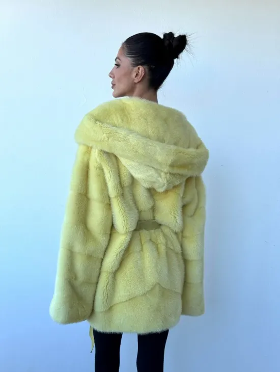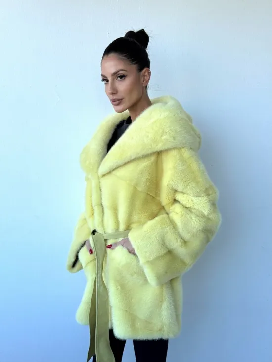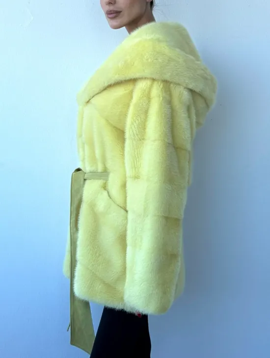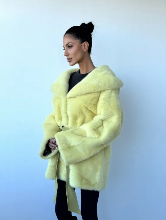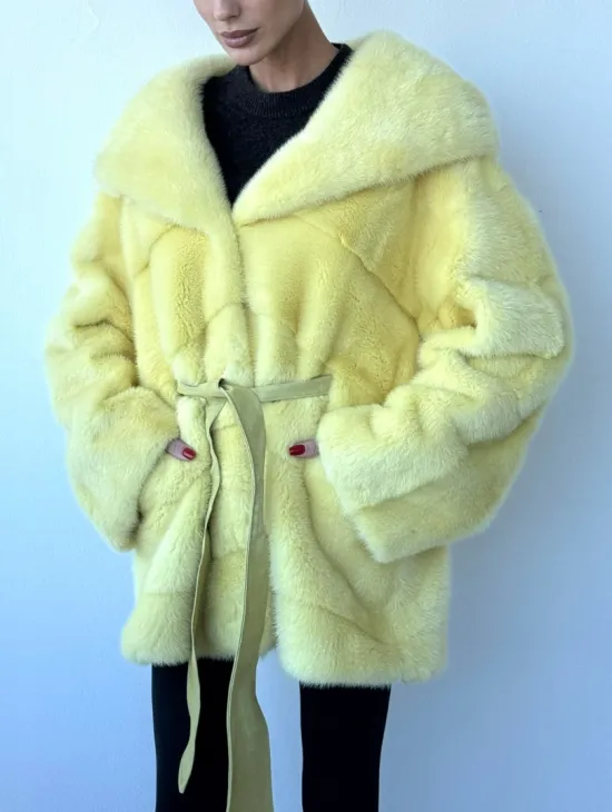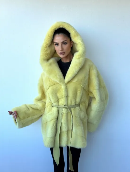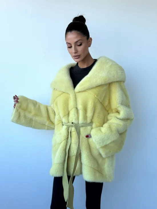 Полушубок кимоно из аукционной норки с капюшоном в нежно-желтом цвете