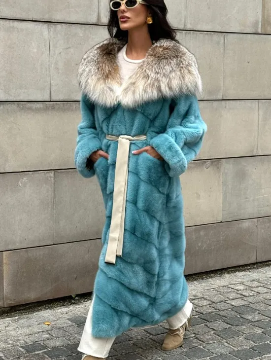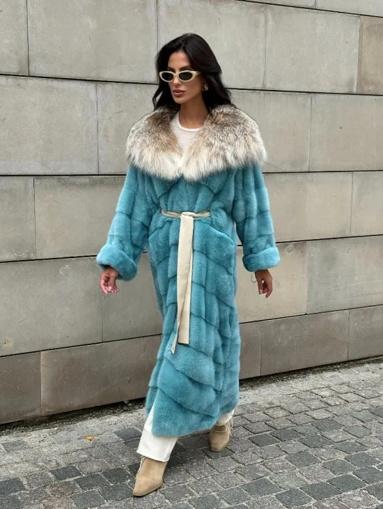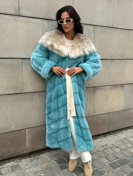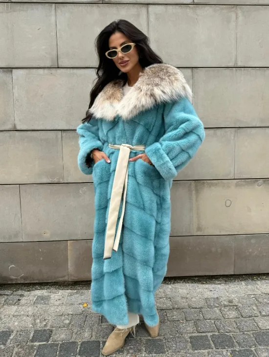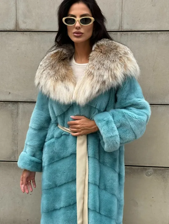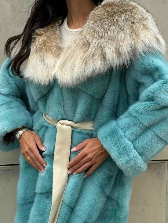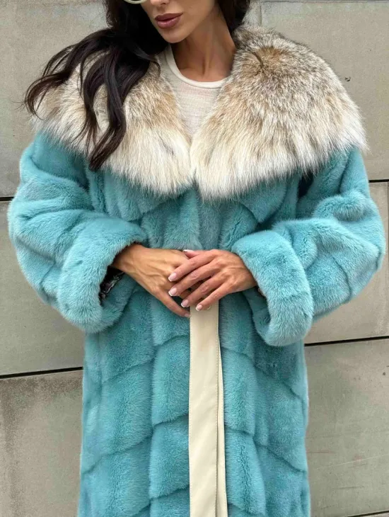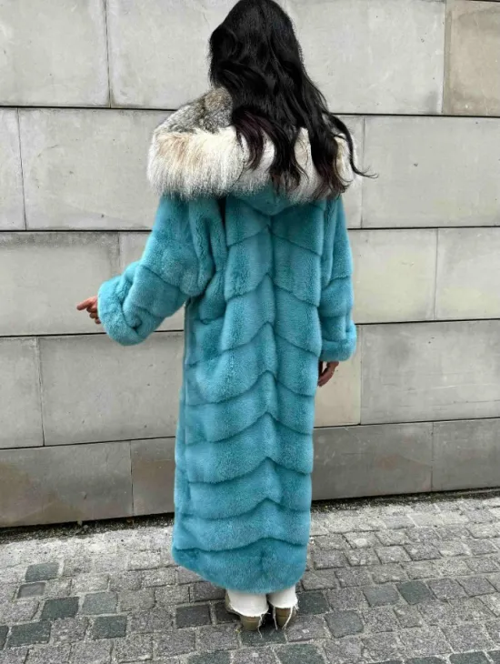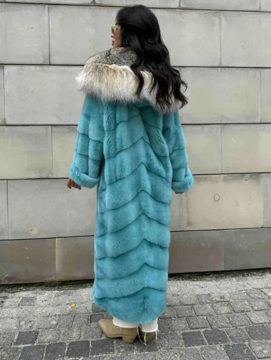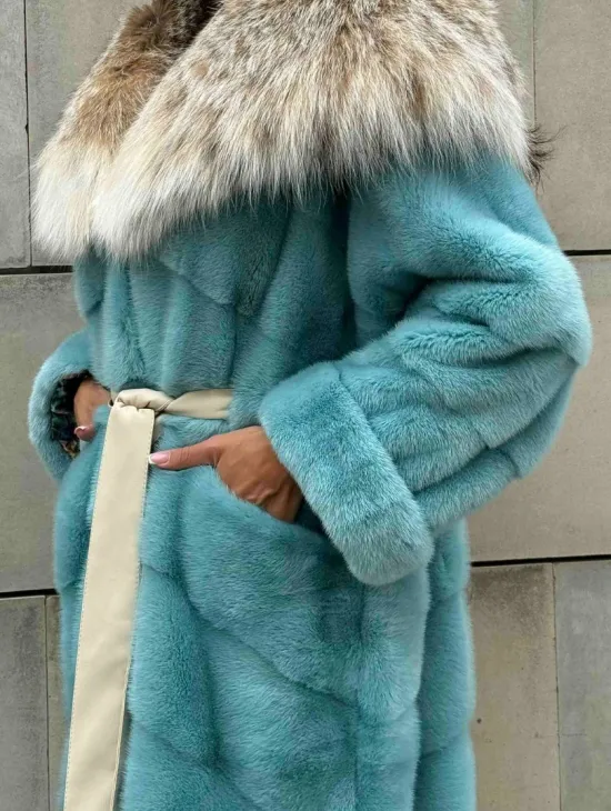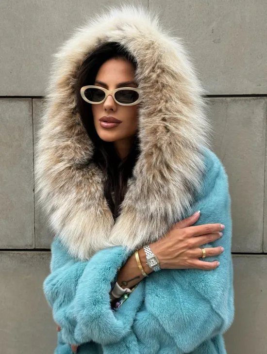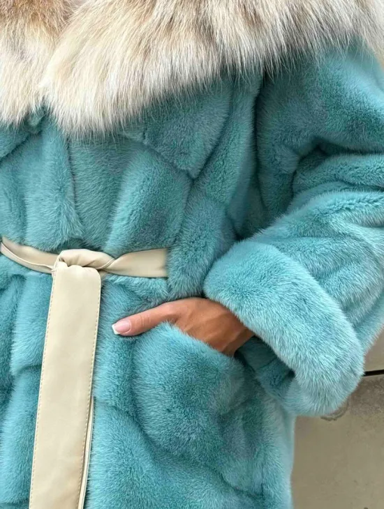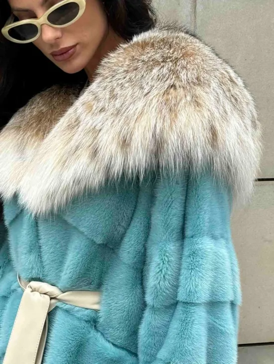 Шуба норковая с капюшоном из меха рыси - цвет Тиффани