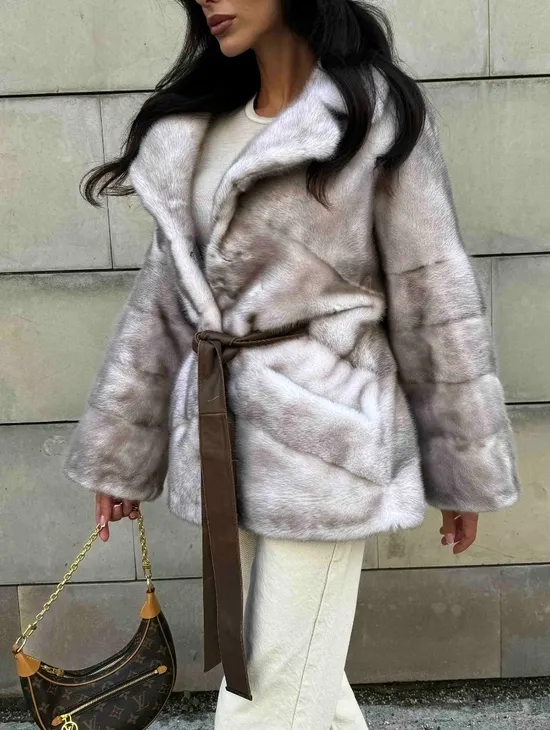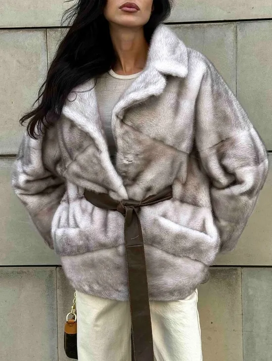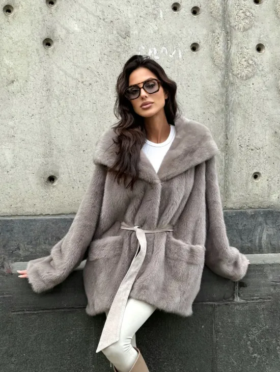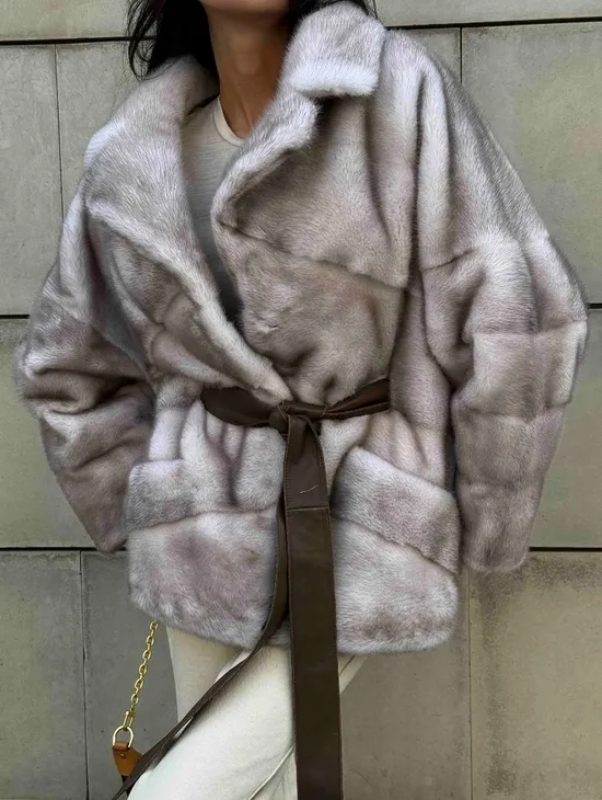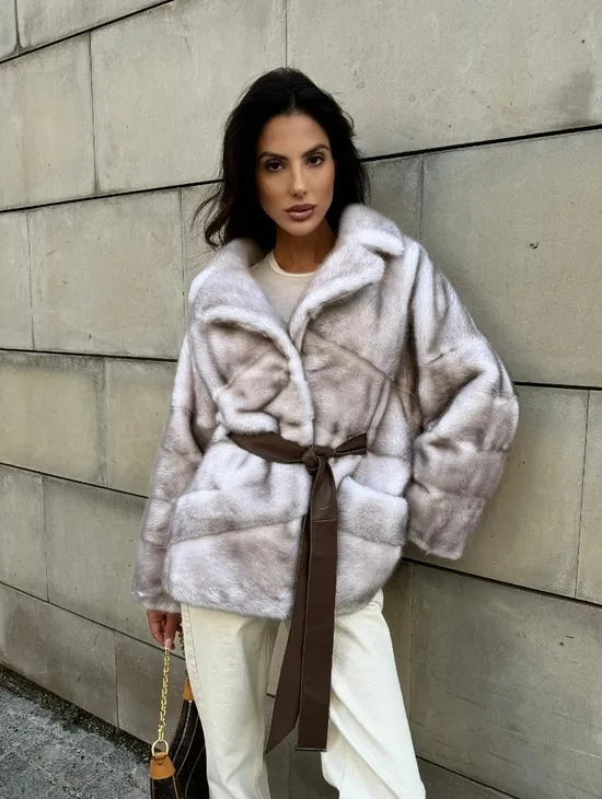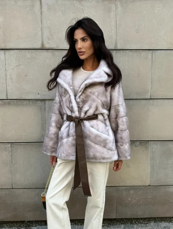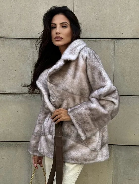 Укороченная шуба из меха норки модель кимоно - цвет колотый лед
