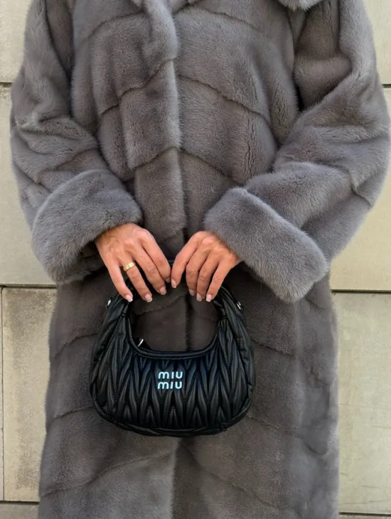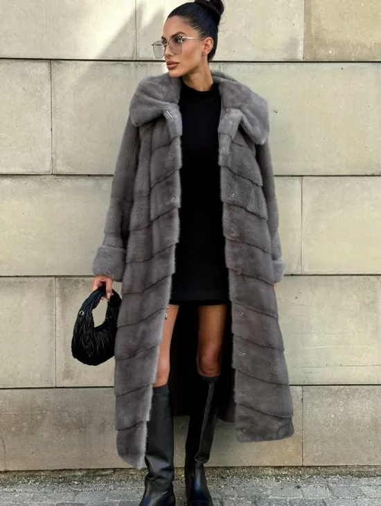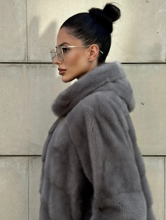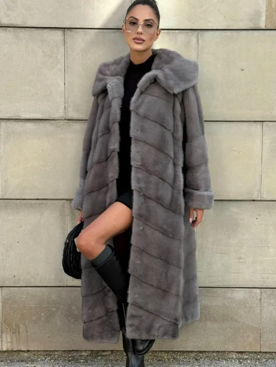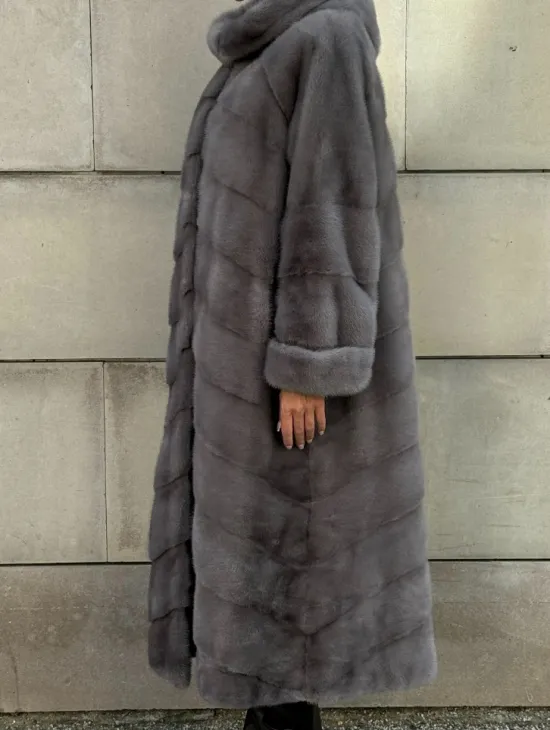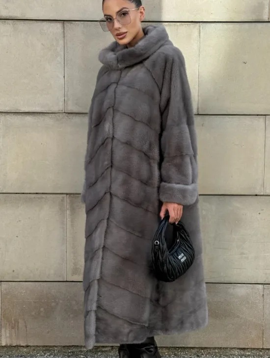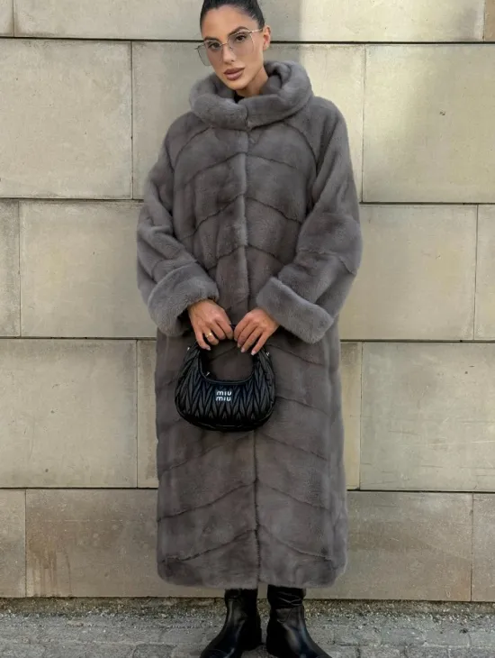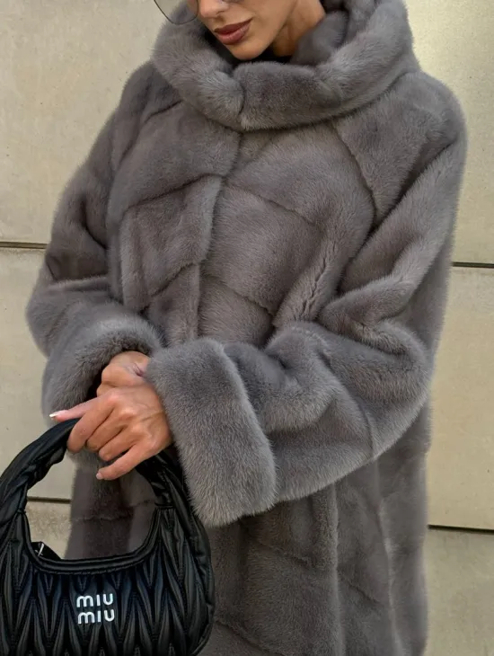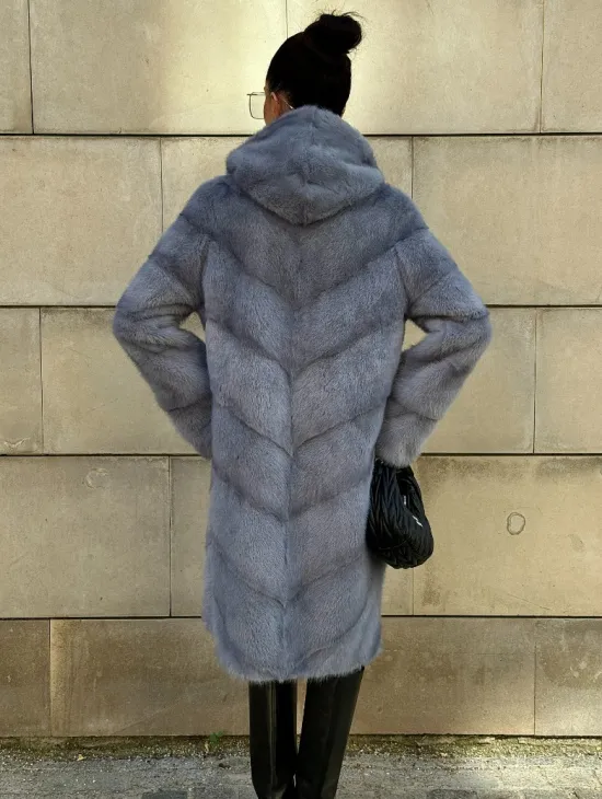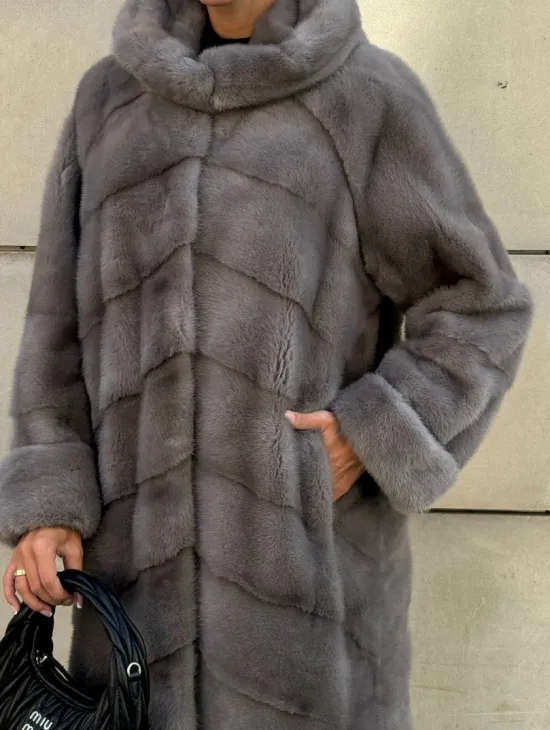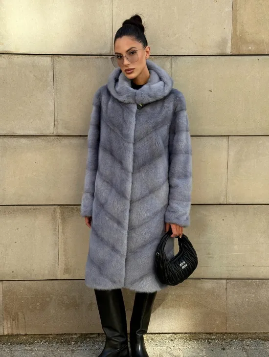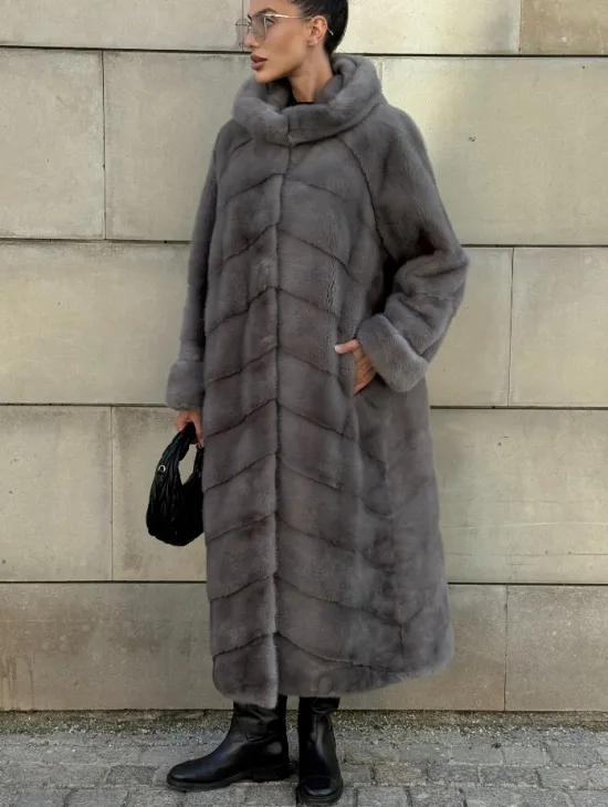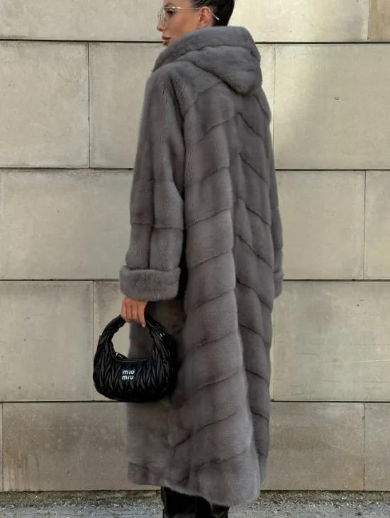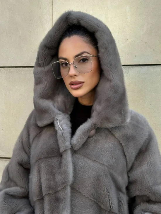 Шуба в диагональной выкладке меха норки, графит грей с капюшоном
