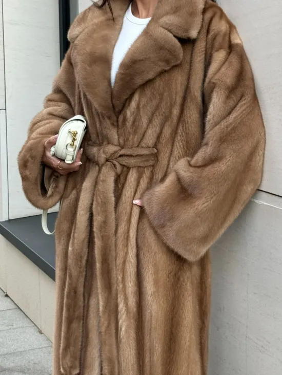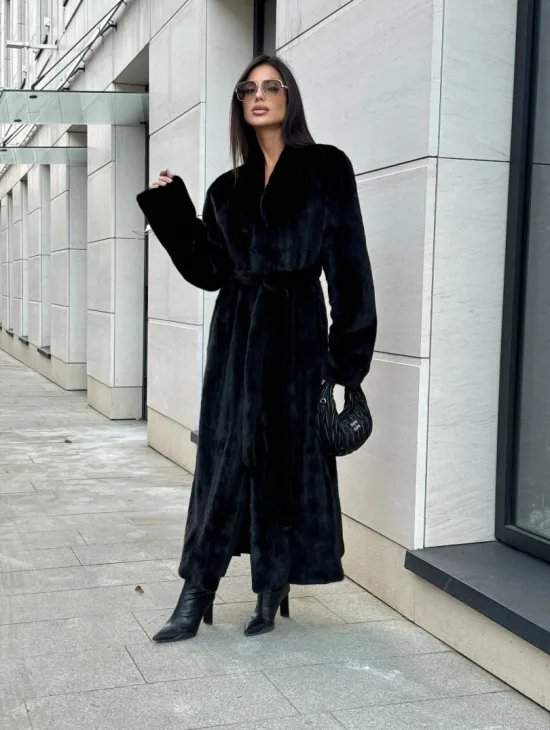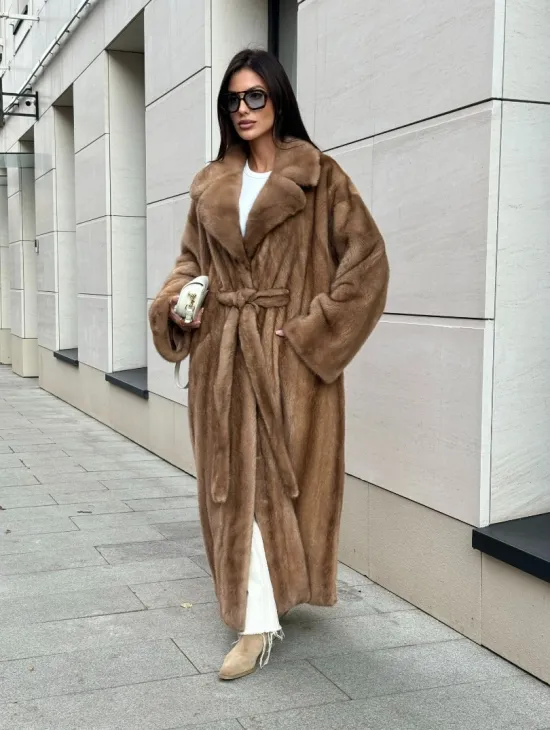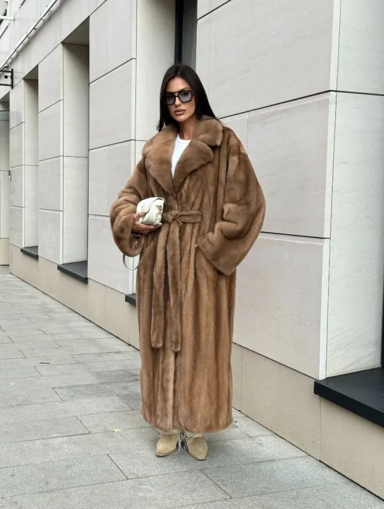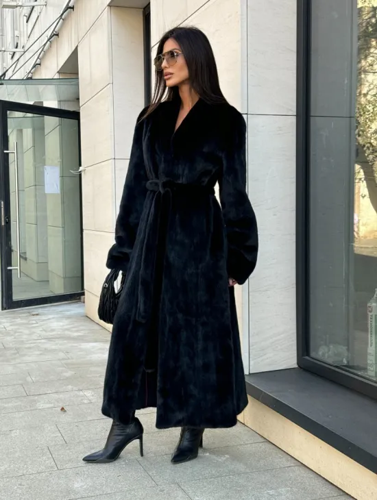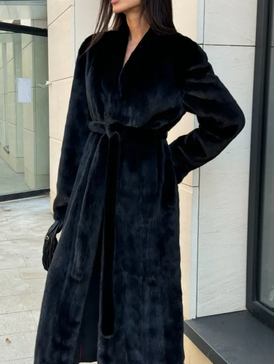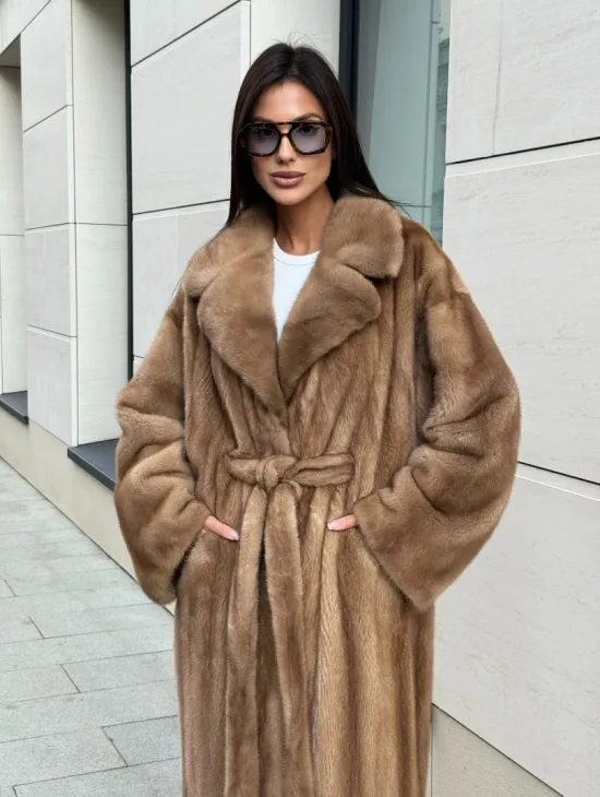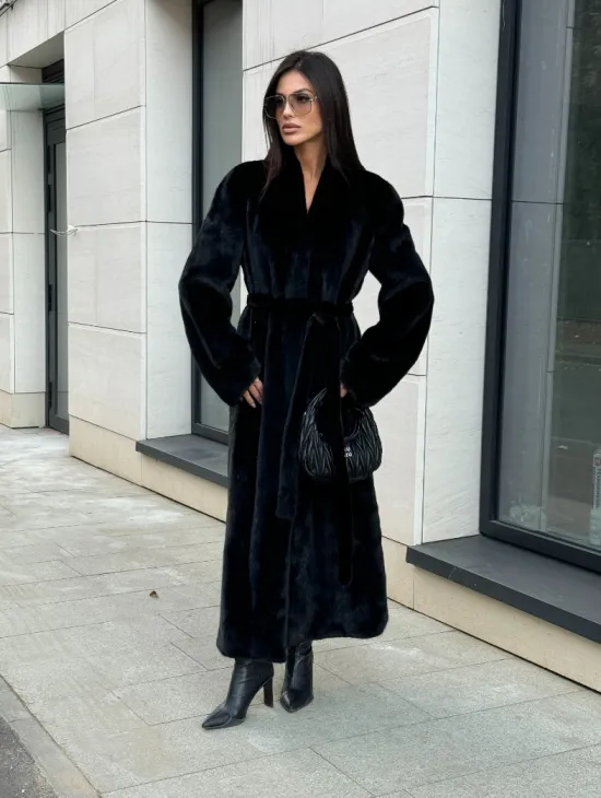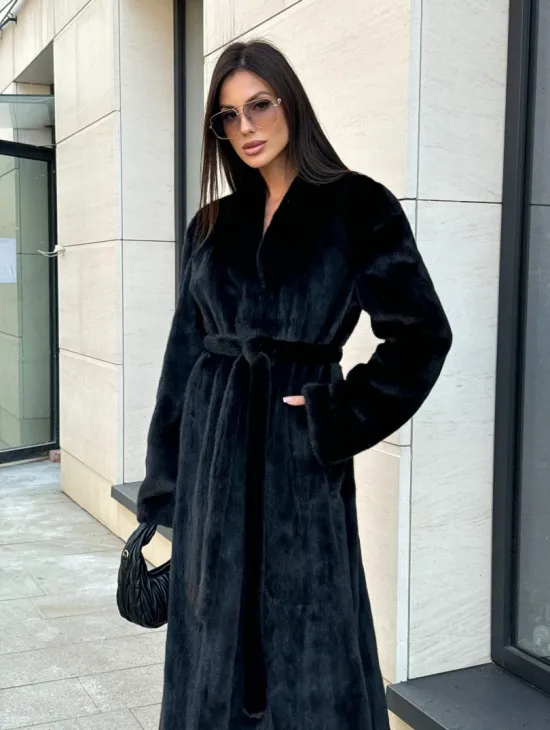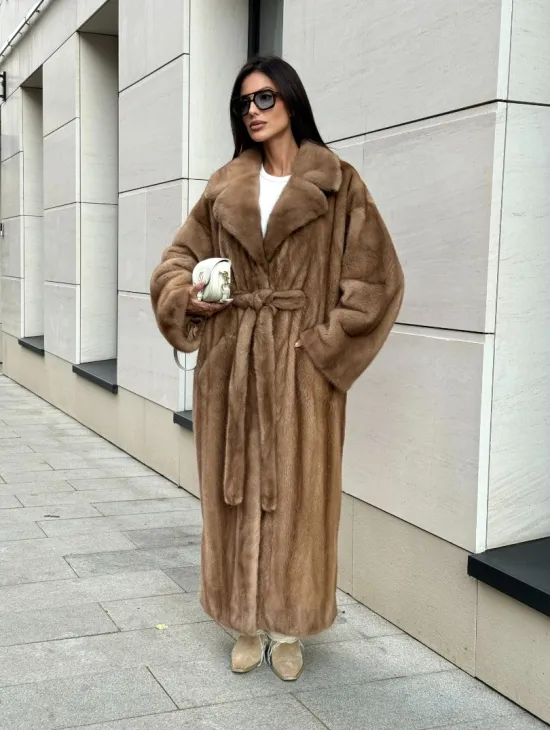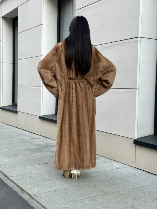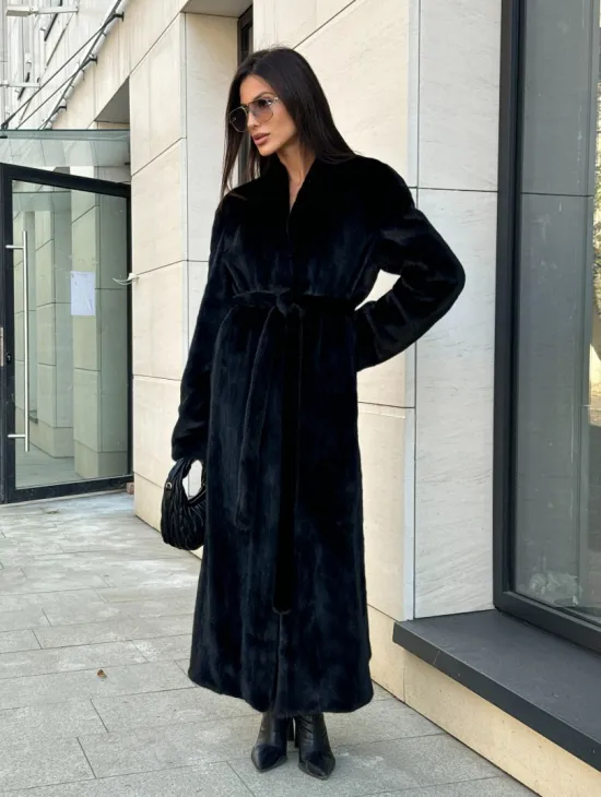 Шуба халат из аукционного меха норки, V-образный воротник с поясом