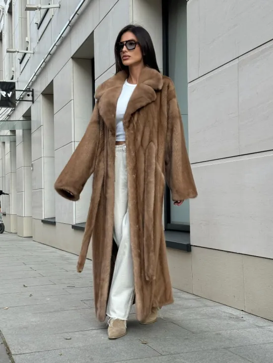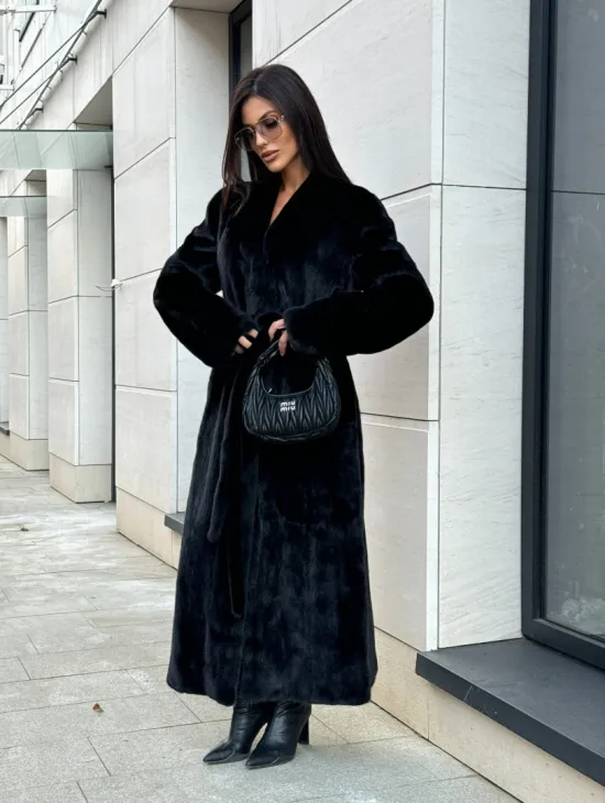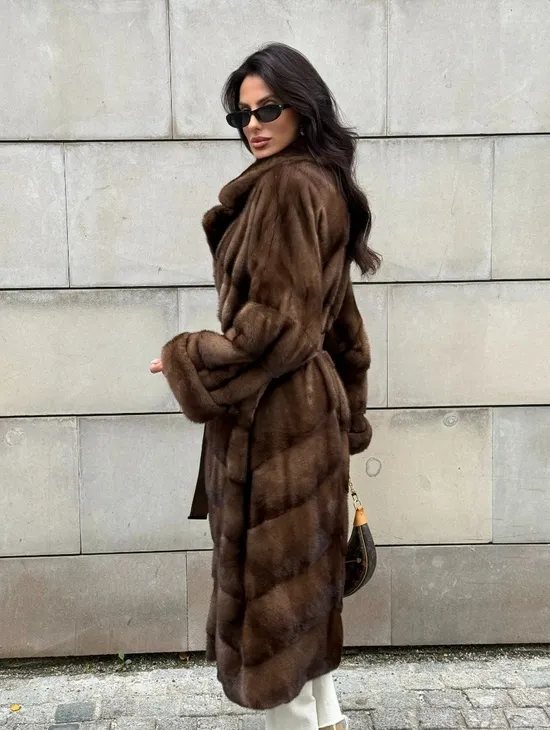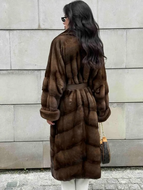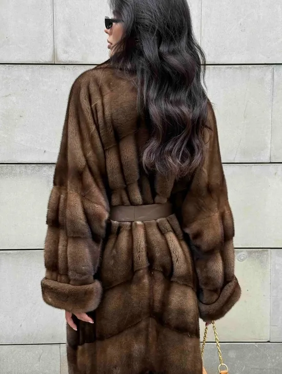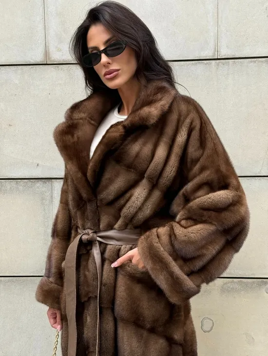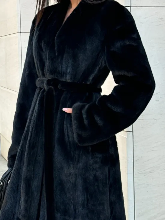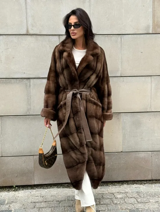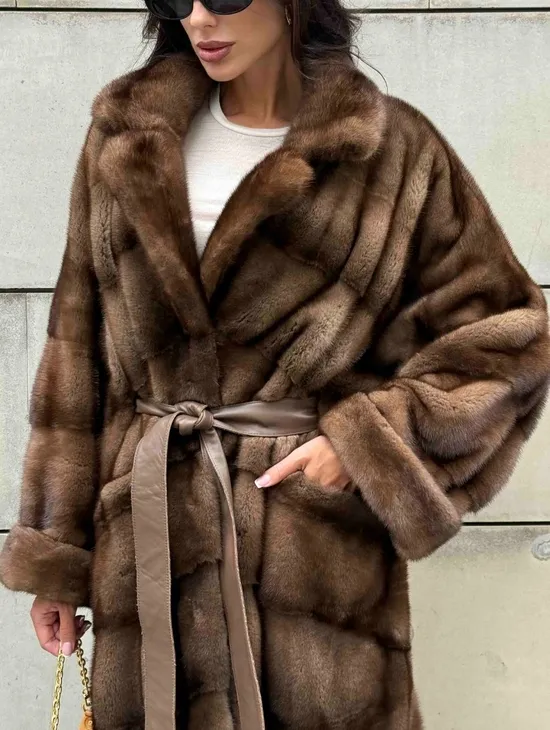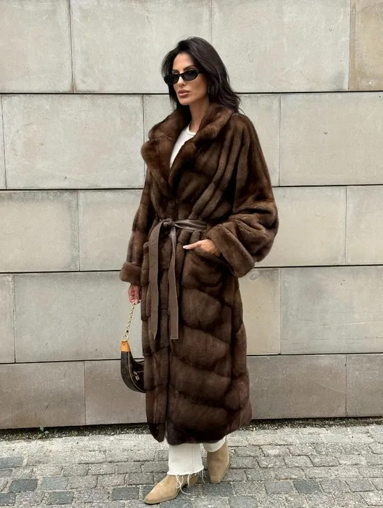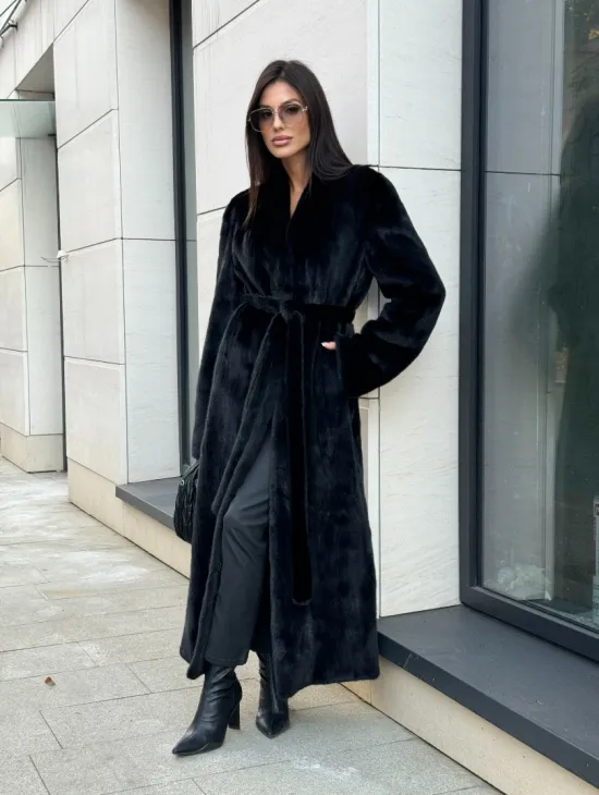 Шуба халат из аукционного меха норки, V-образный воротник с поясом