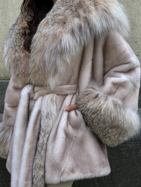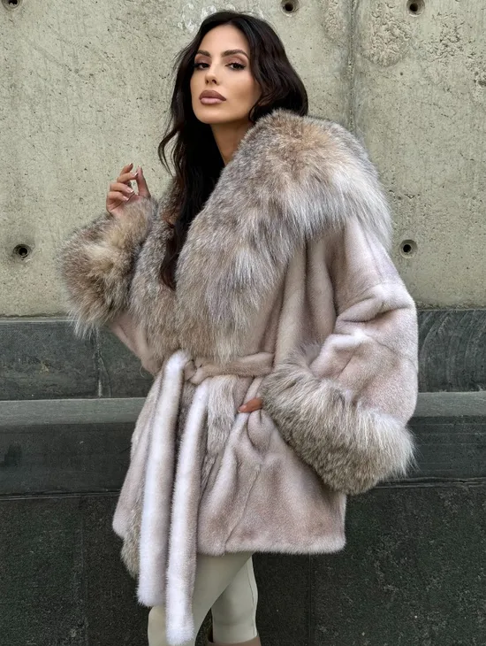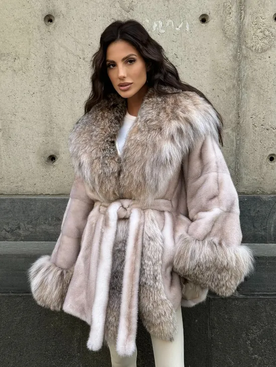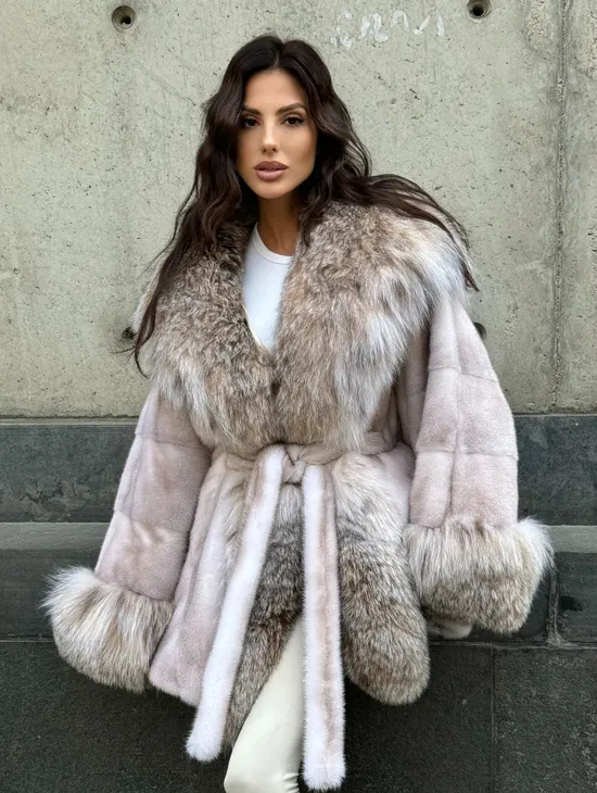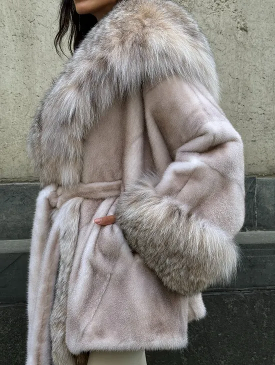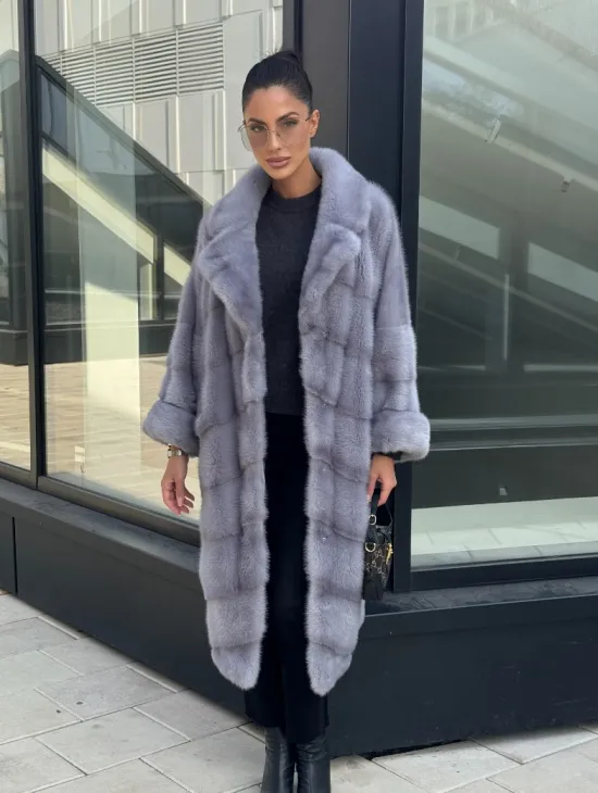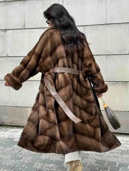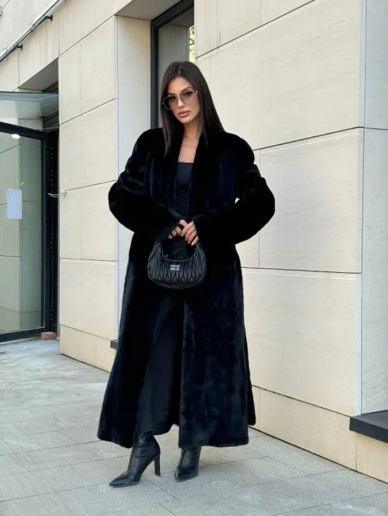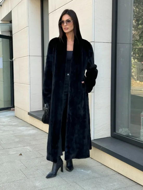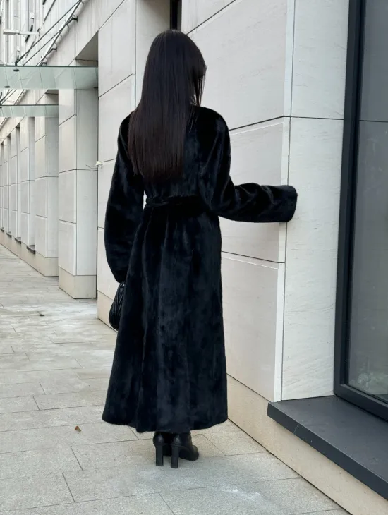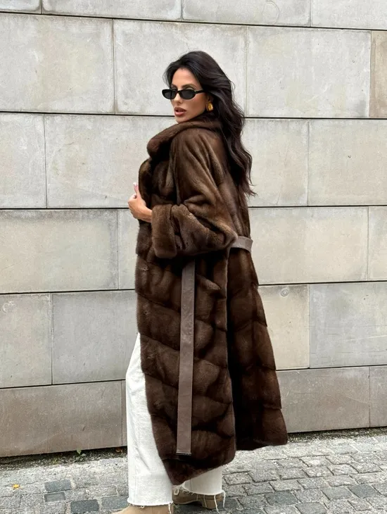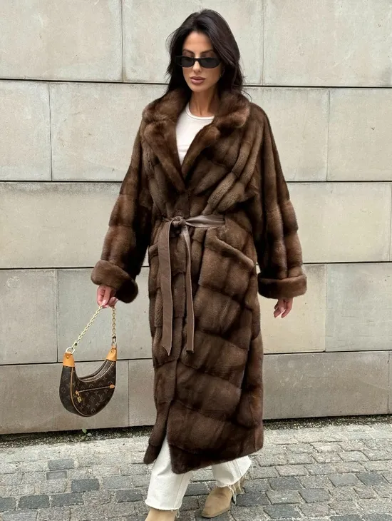 Шуба халат из аукционного меха норки, V-образный воротник с поясом