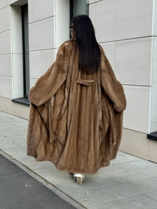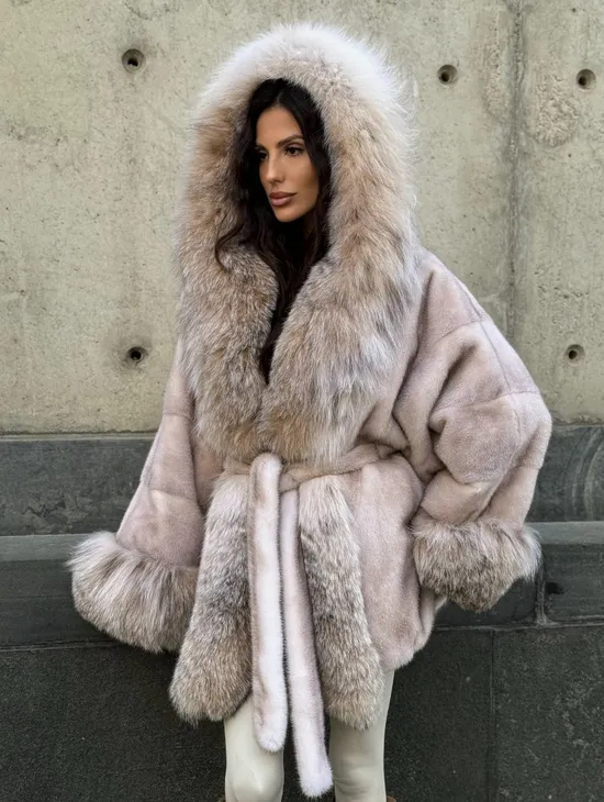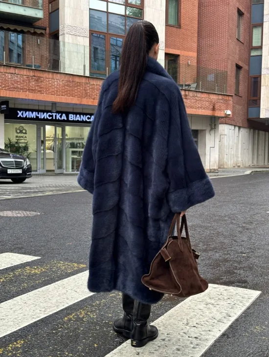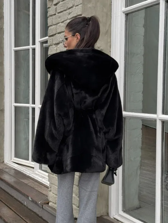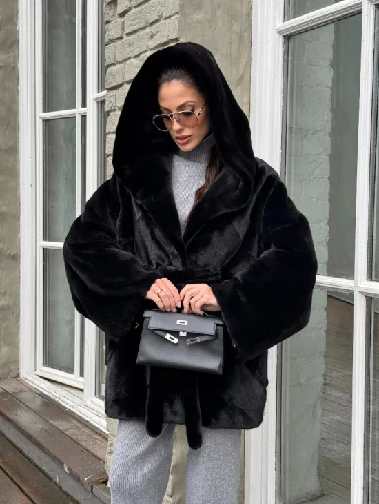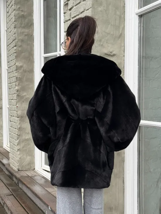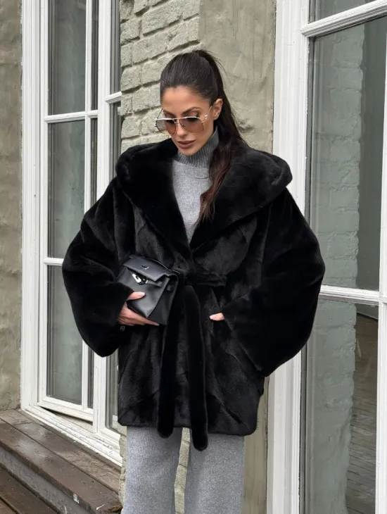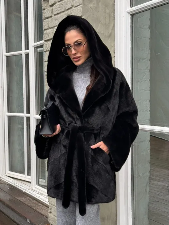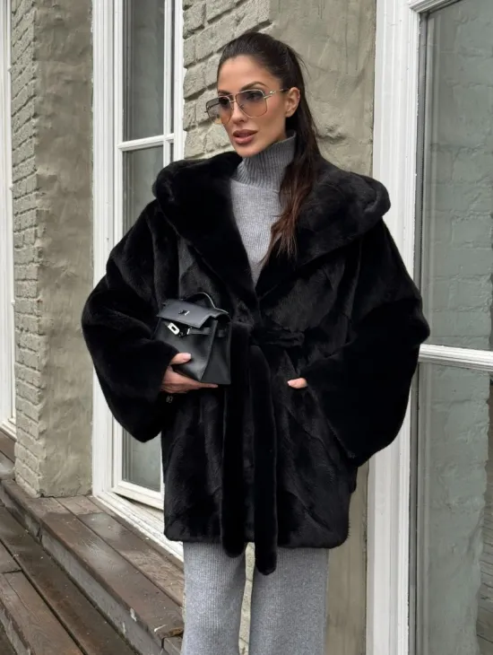 Шуба из канадской норки с капюшоном кобра, фасон летучая мышь