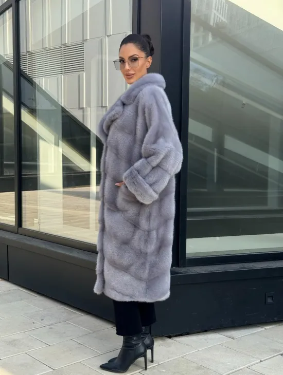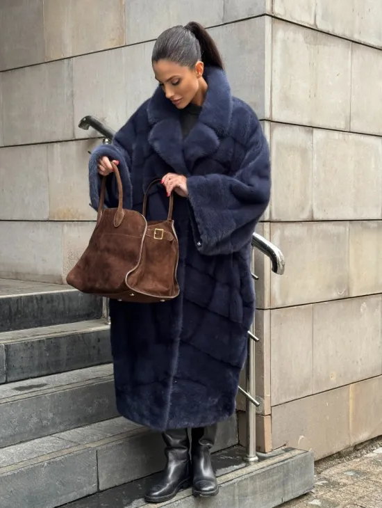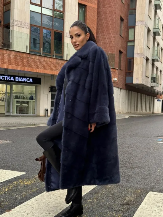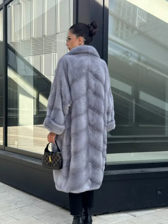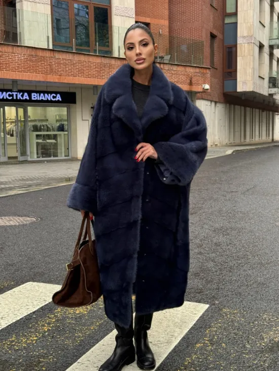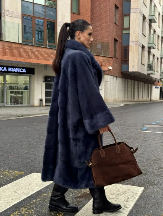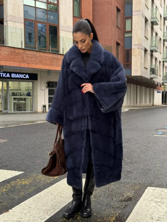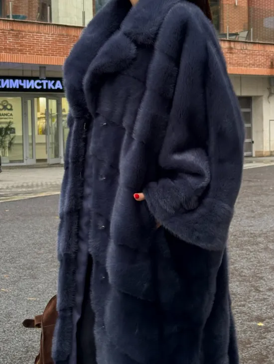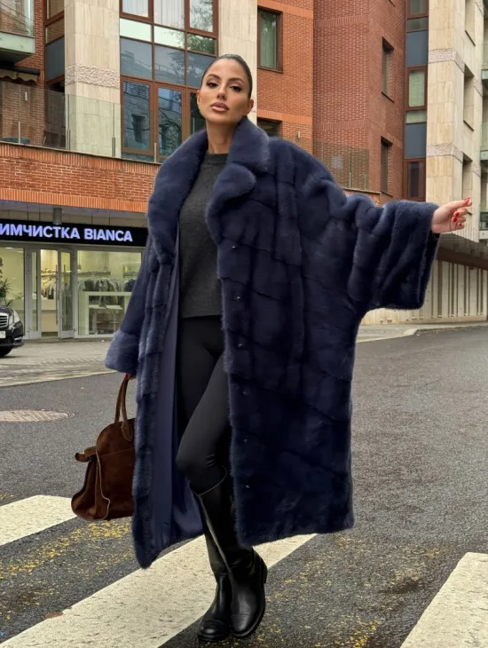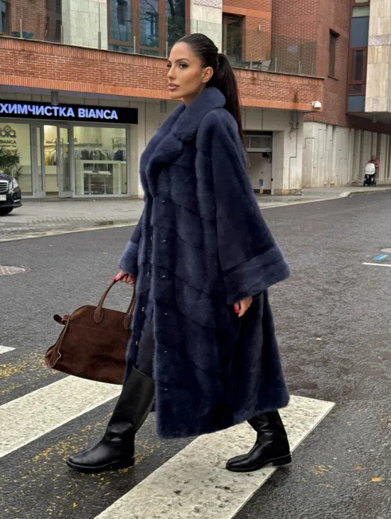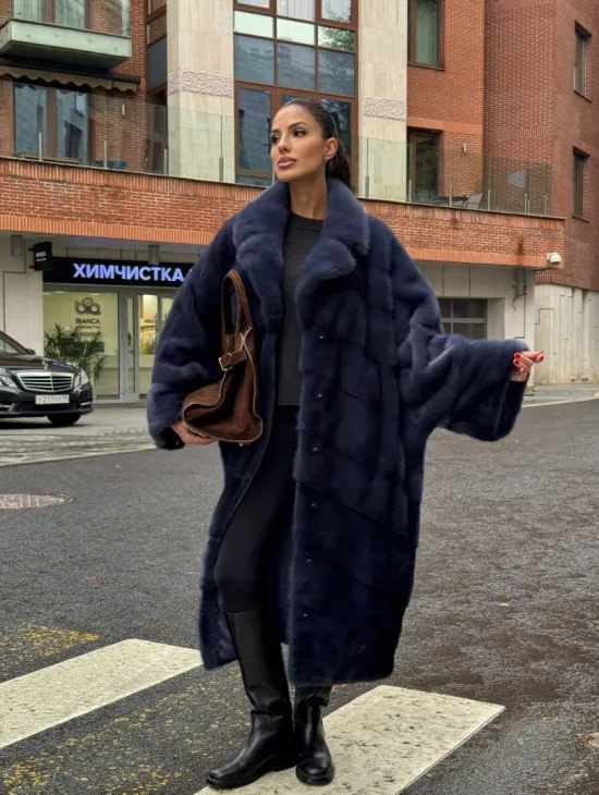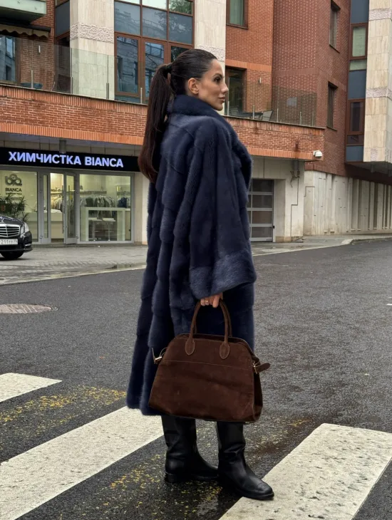 Норковая шуба-пальто в цвете джинс, стиль “Бохо“ — батальный размер