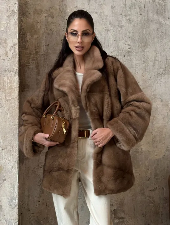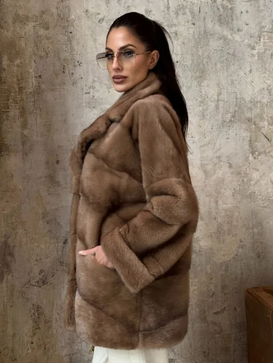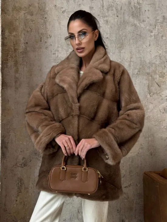 Полушубок из натуральной норки пастель с английским воротником - паркет