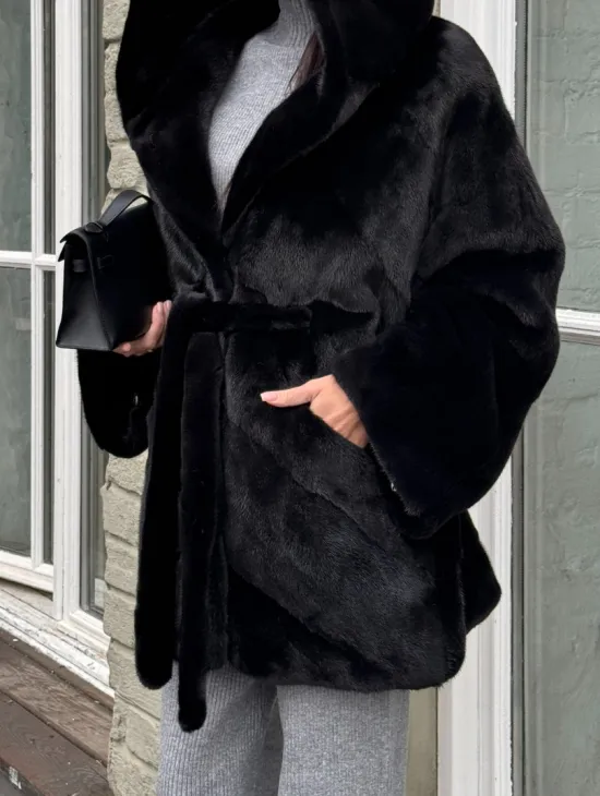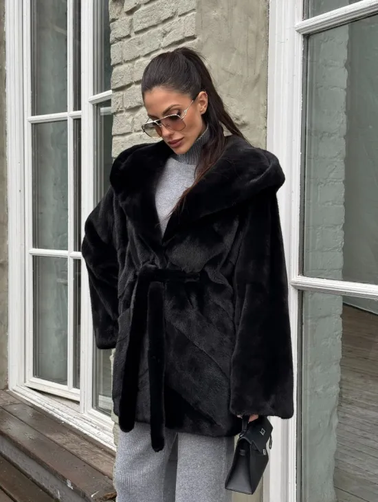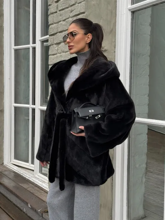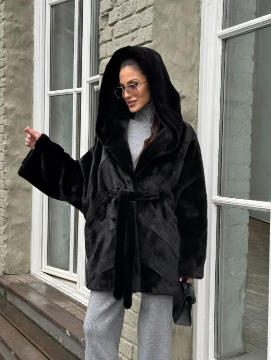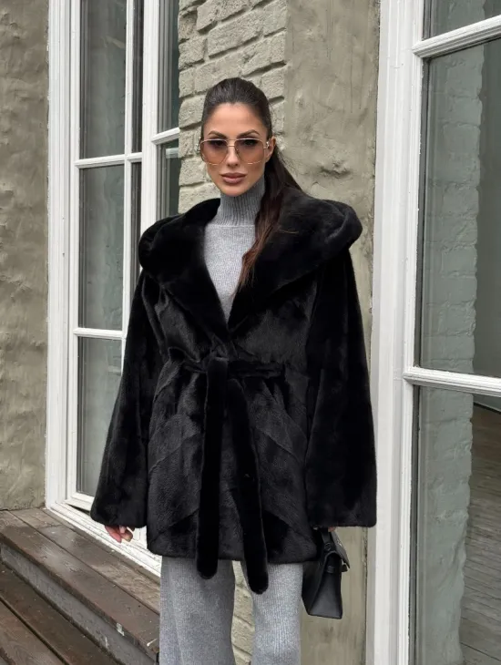 Шуба автоледи из норки Black с потайным поясом и капюшоном из меха куницы
