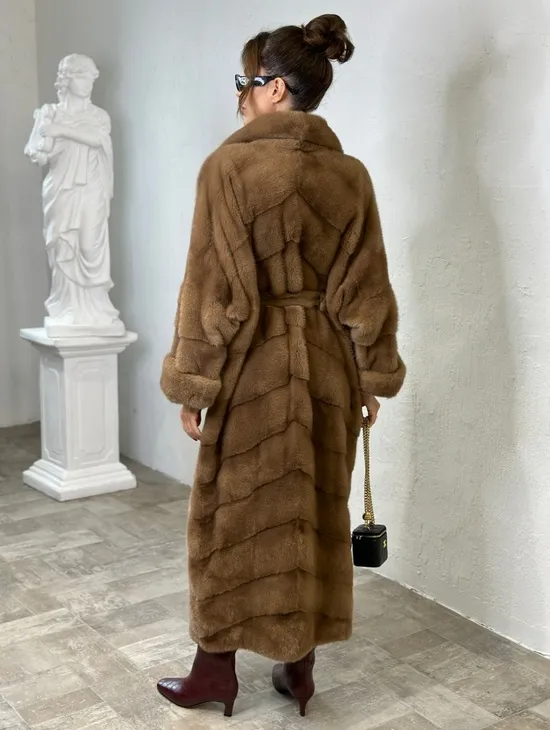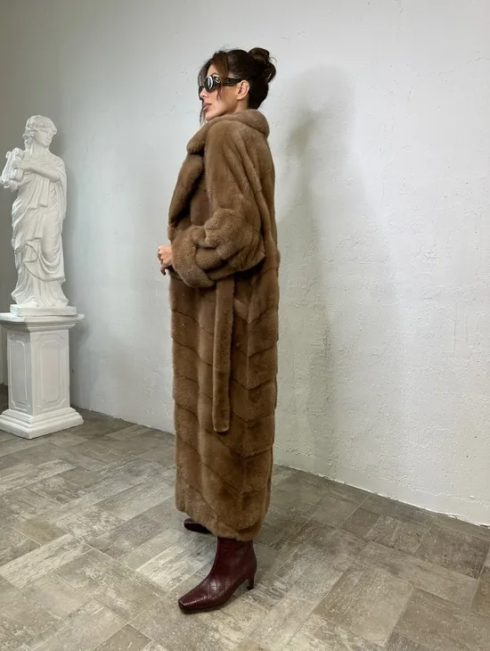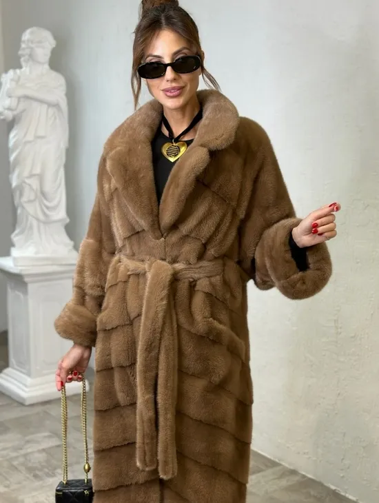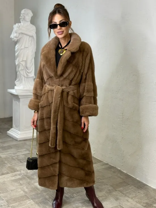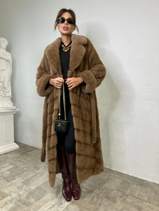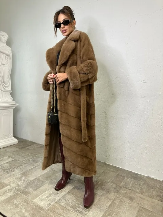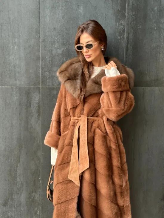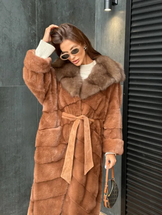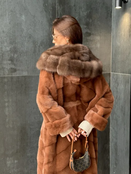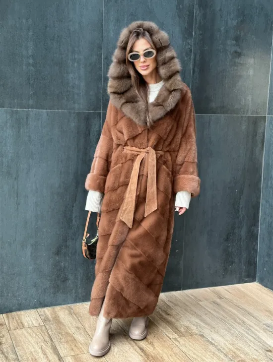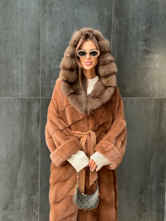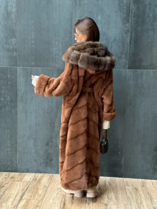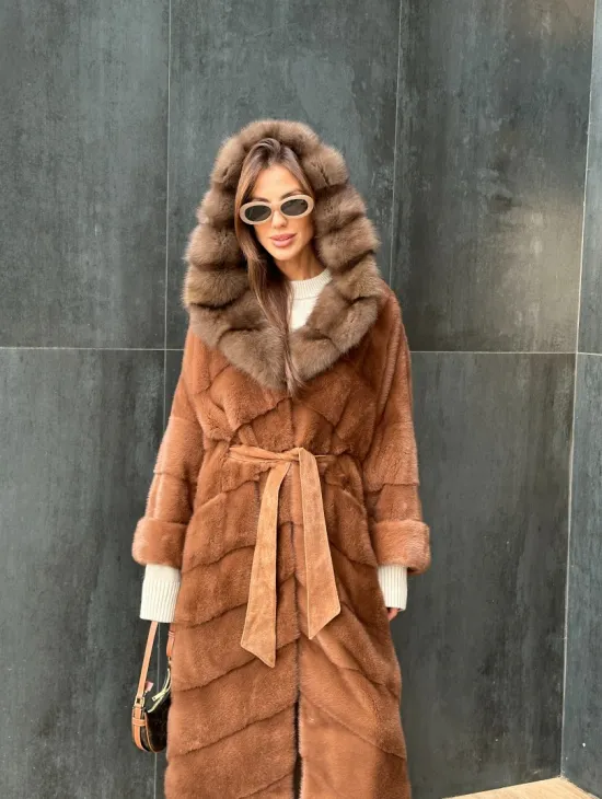 Удлиненная норковая шуба с капюшоном из куницы - цвет медный