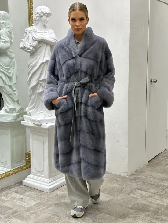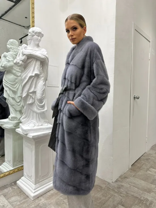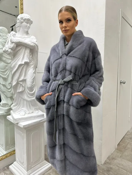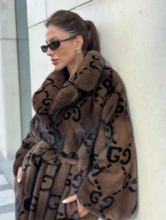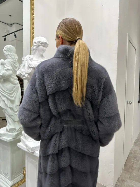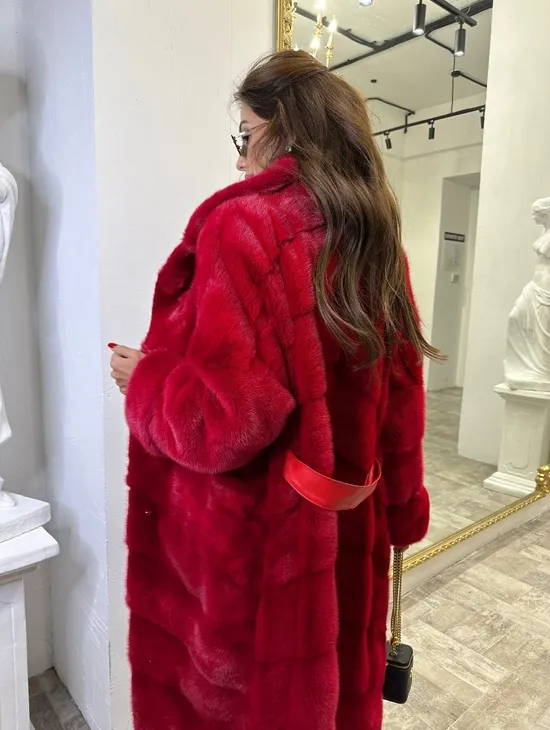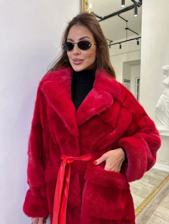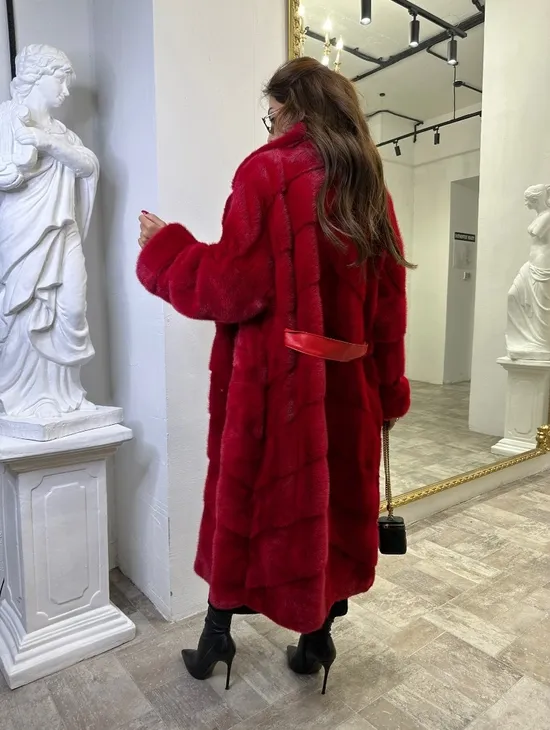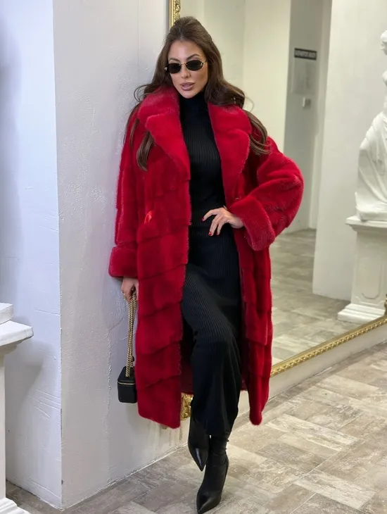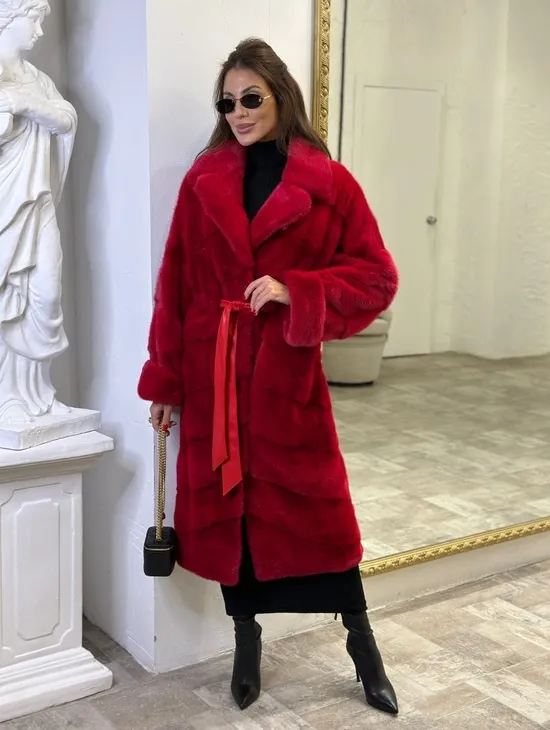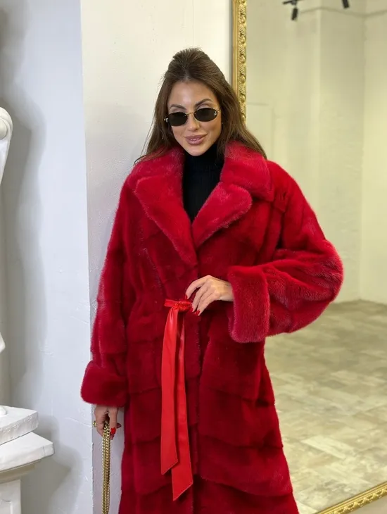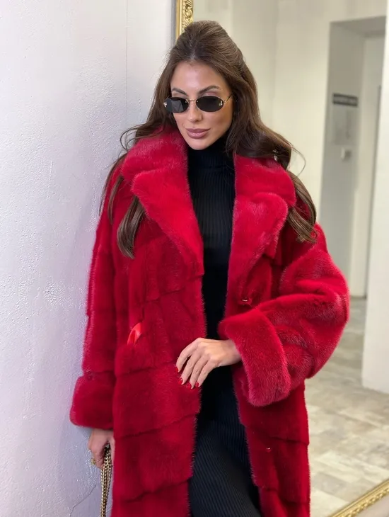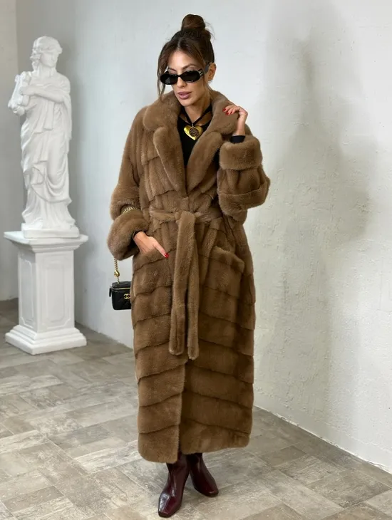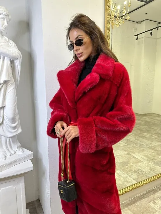 Удлиненная норковая шуба с капюшоном из куницы - цвет медный