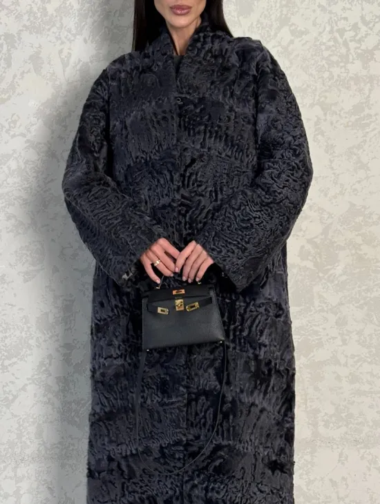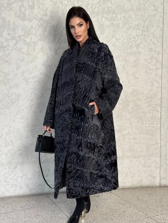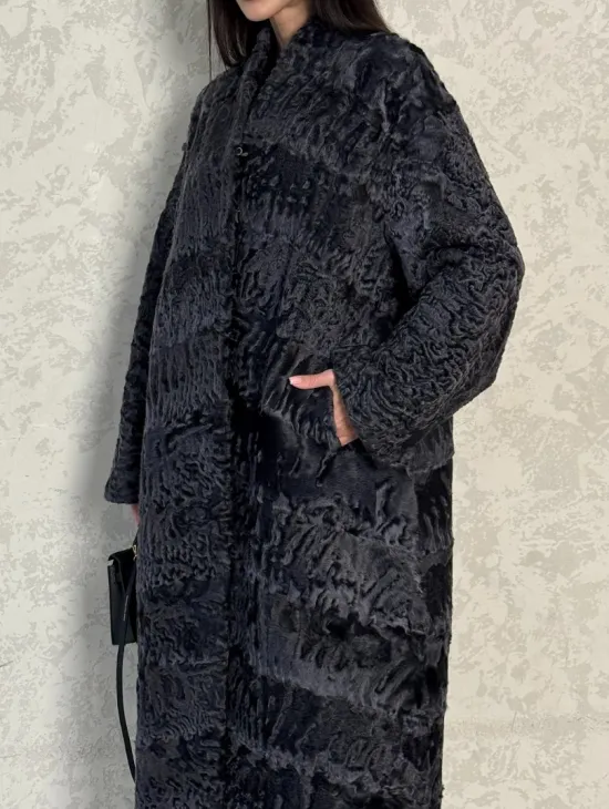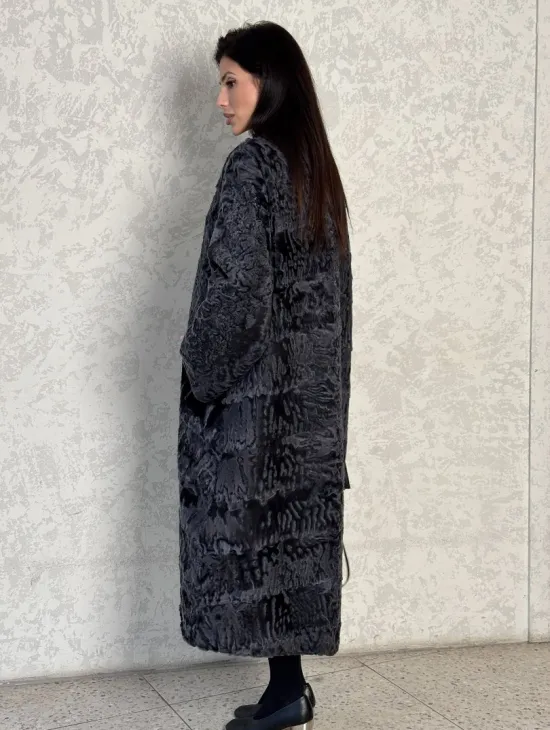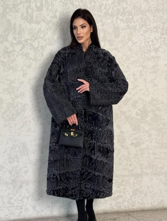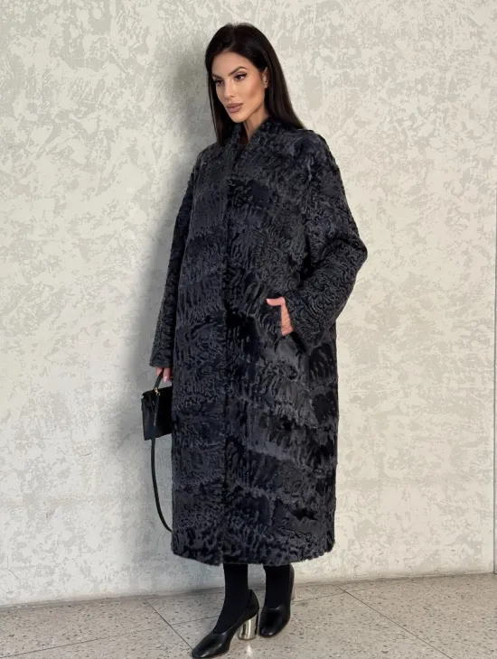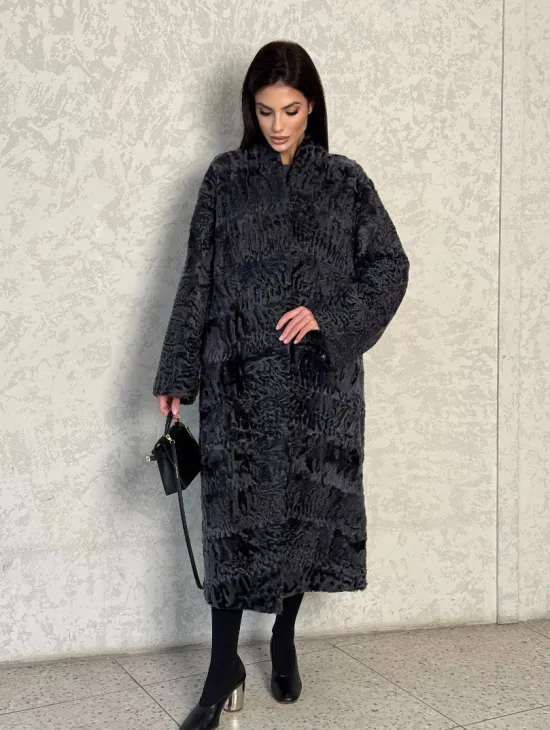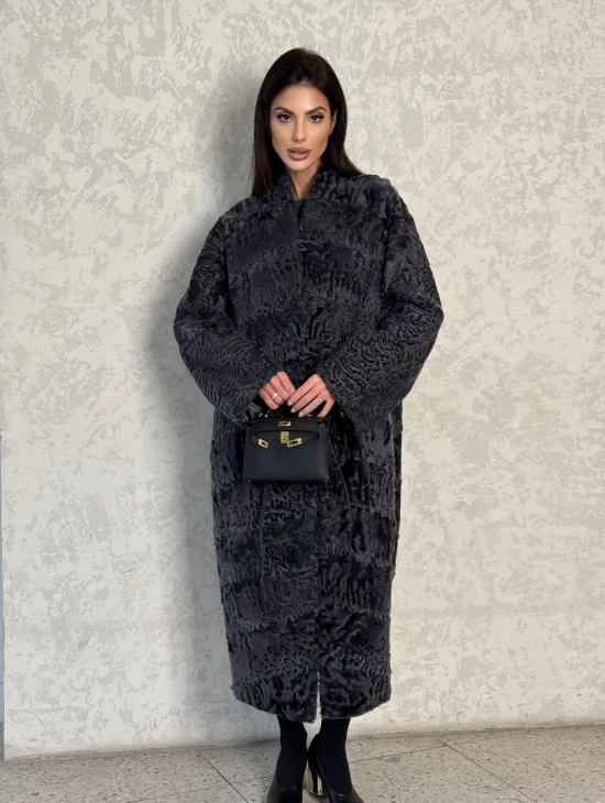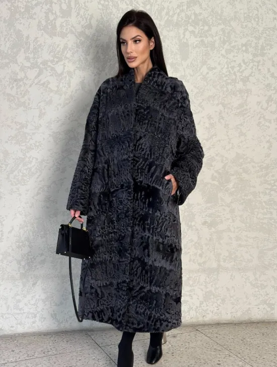 Длинная шуба из каракуля в цвете графит