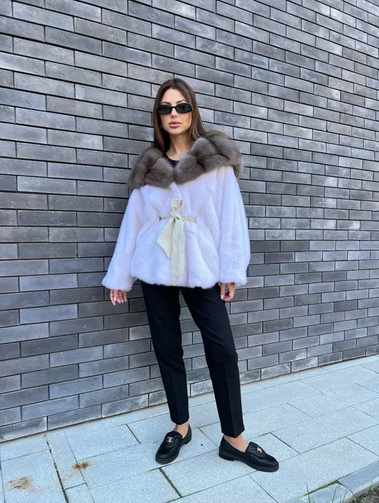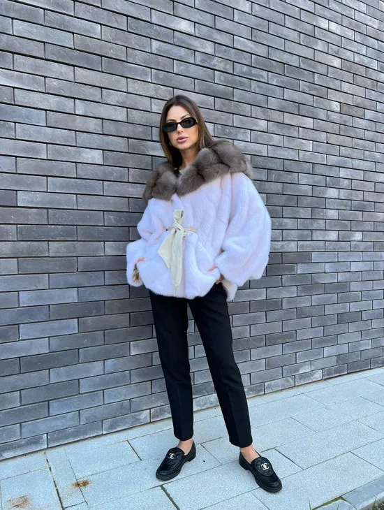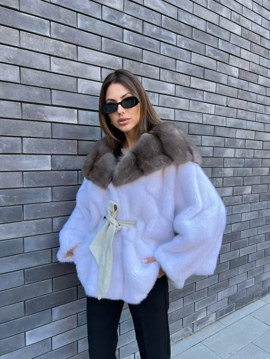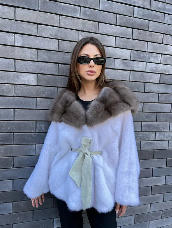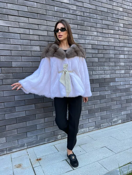 Белое норковое пончо с капюшоном из куницы