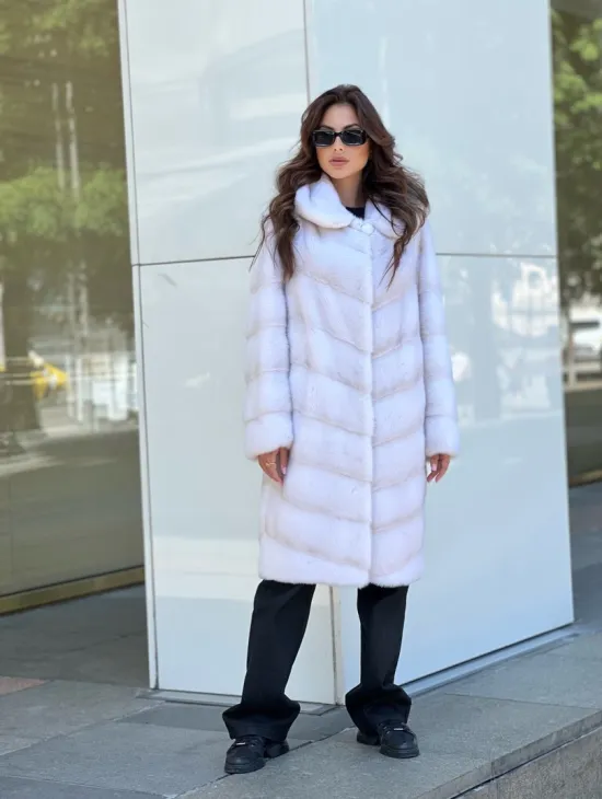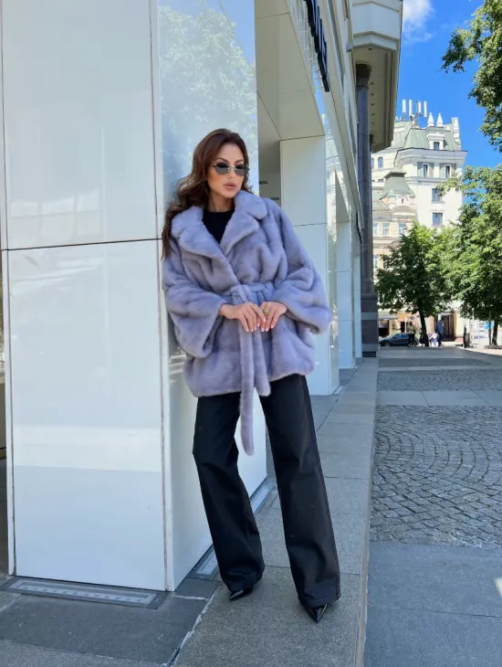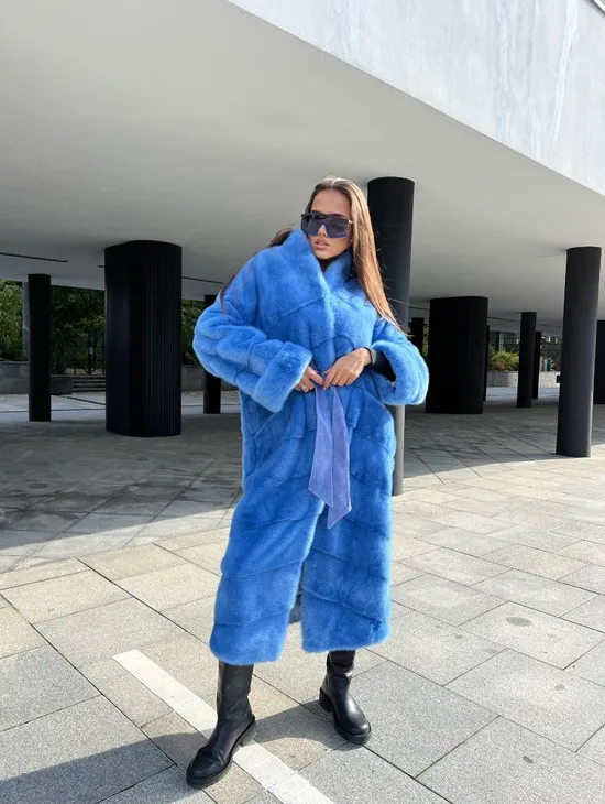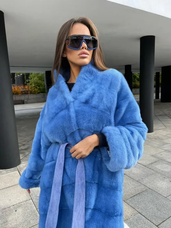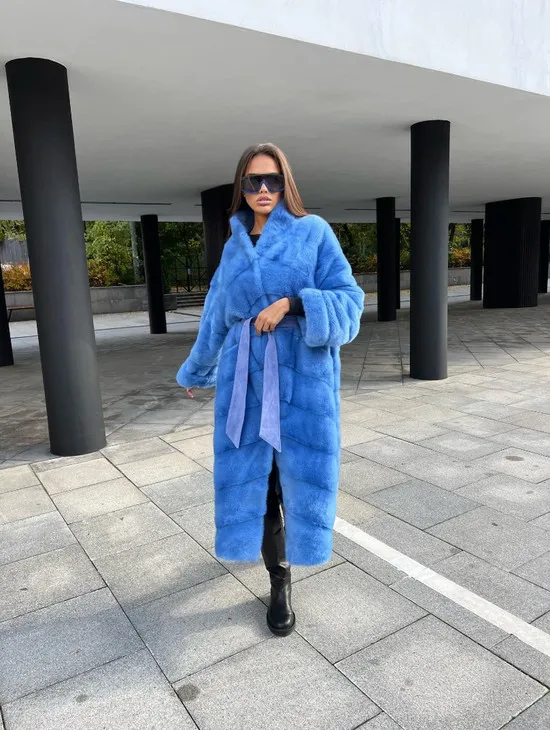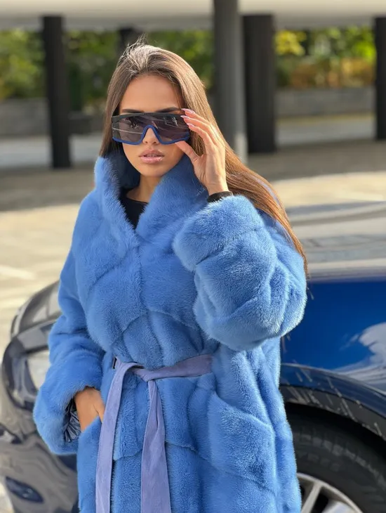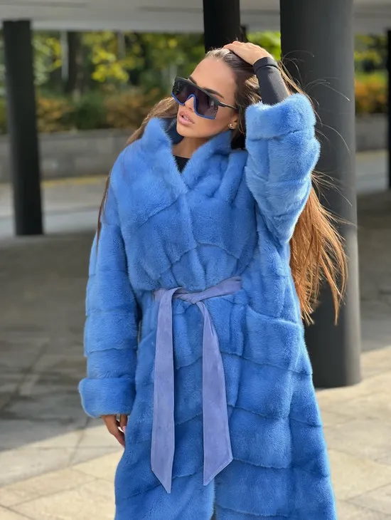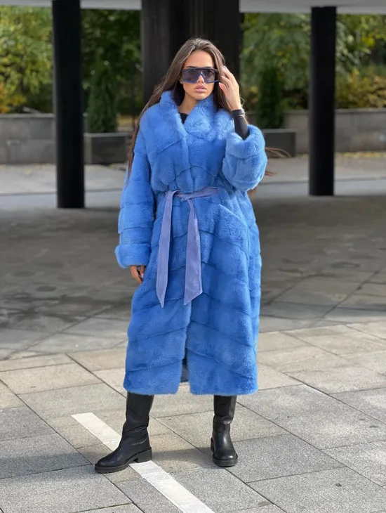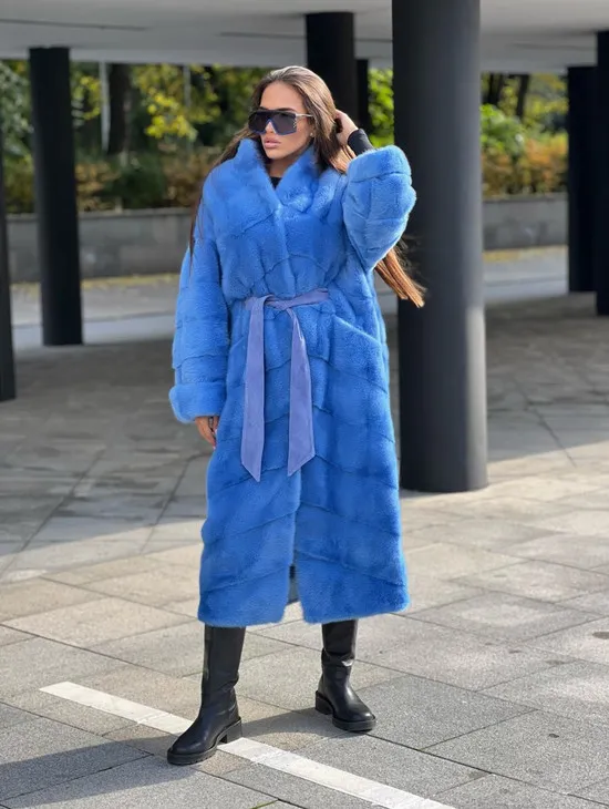 Удлиненная норковая шуба с поясом в голубом оттенке