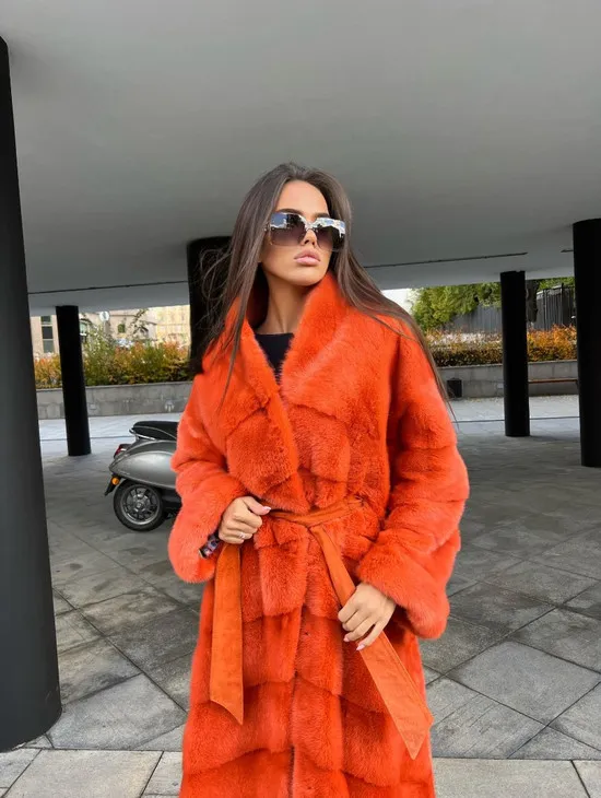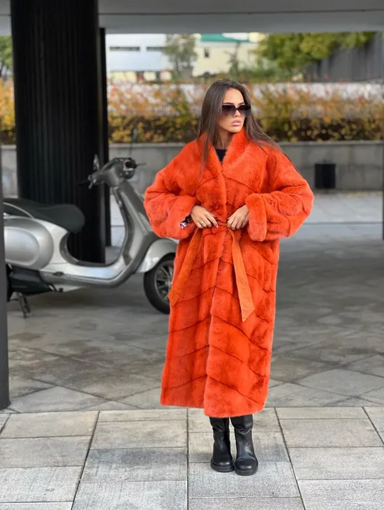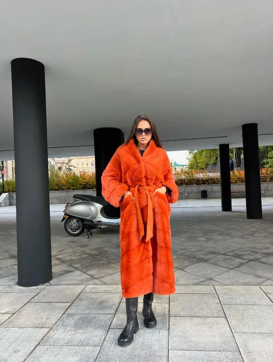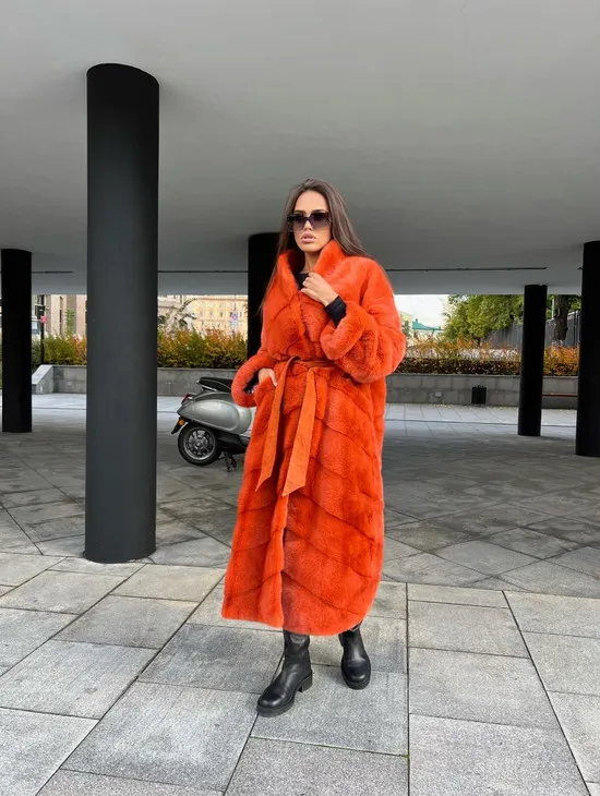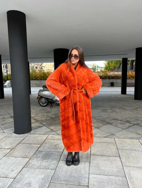 Шуба из меха скандинавской норки в оранжевом оттенке