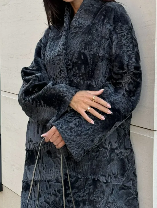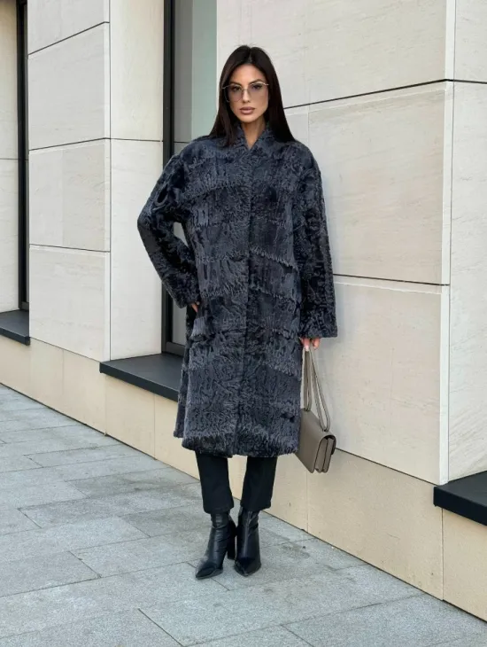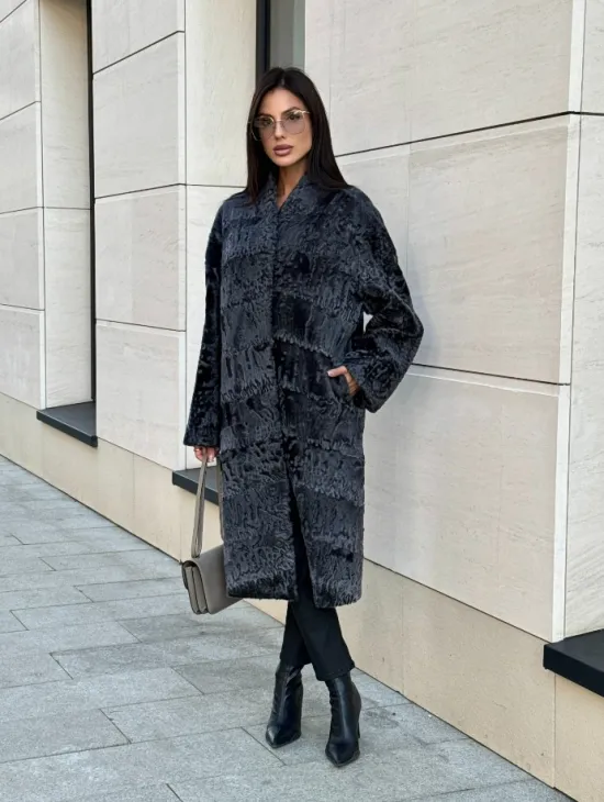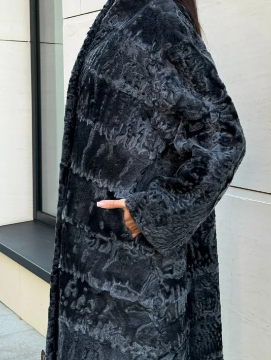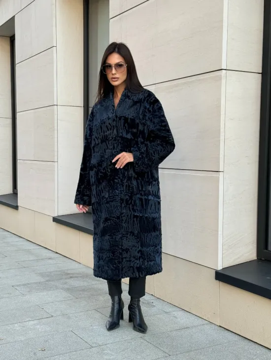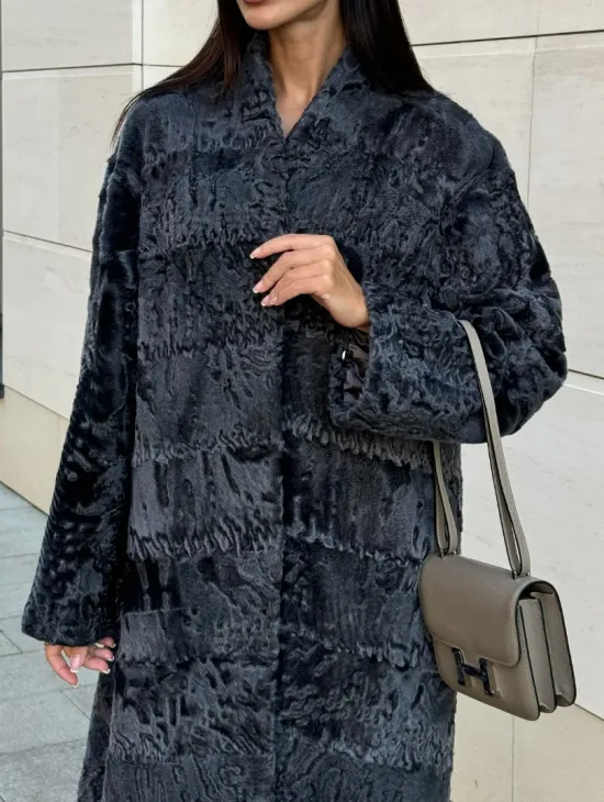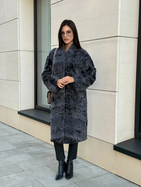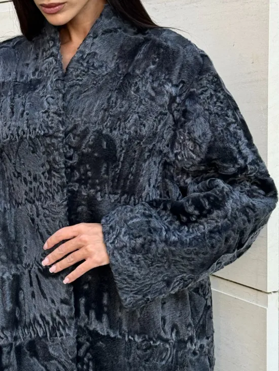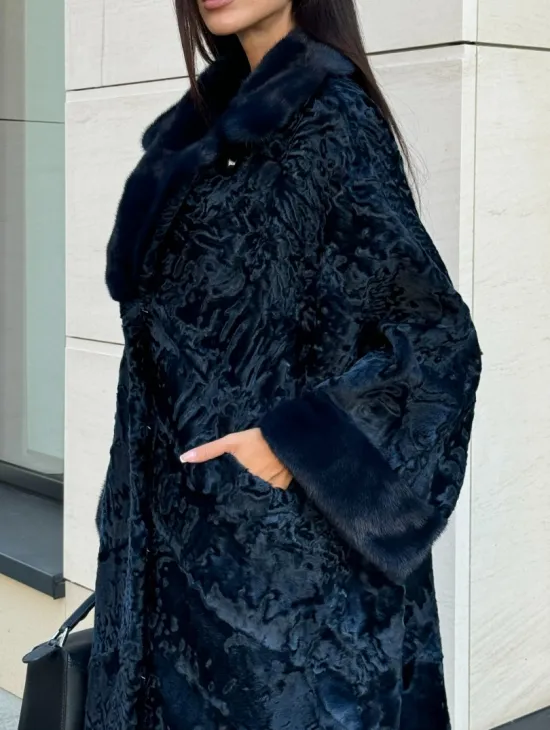 Шуба из каракуля Indigo Blue с отделкой из меха норки, фасон кокон