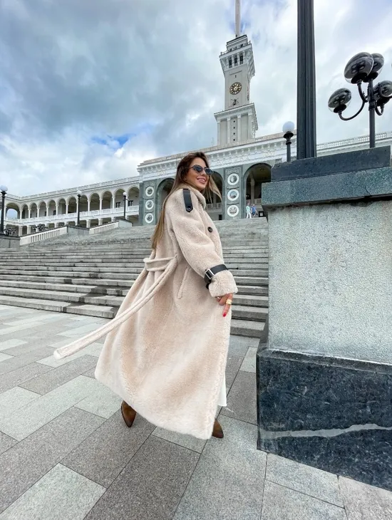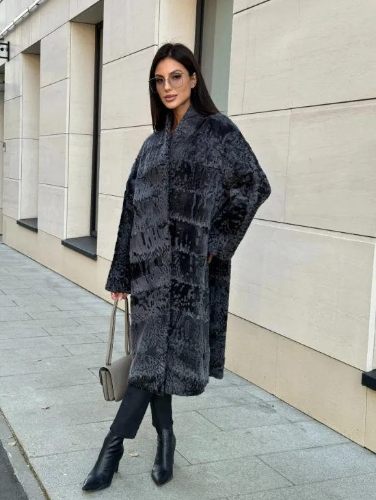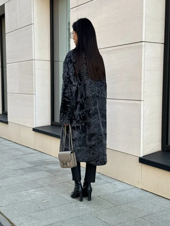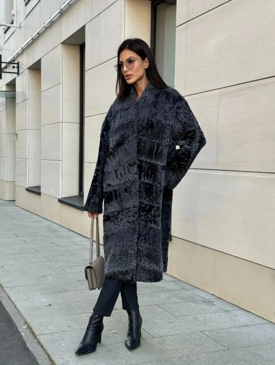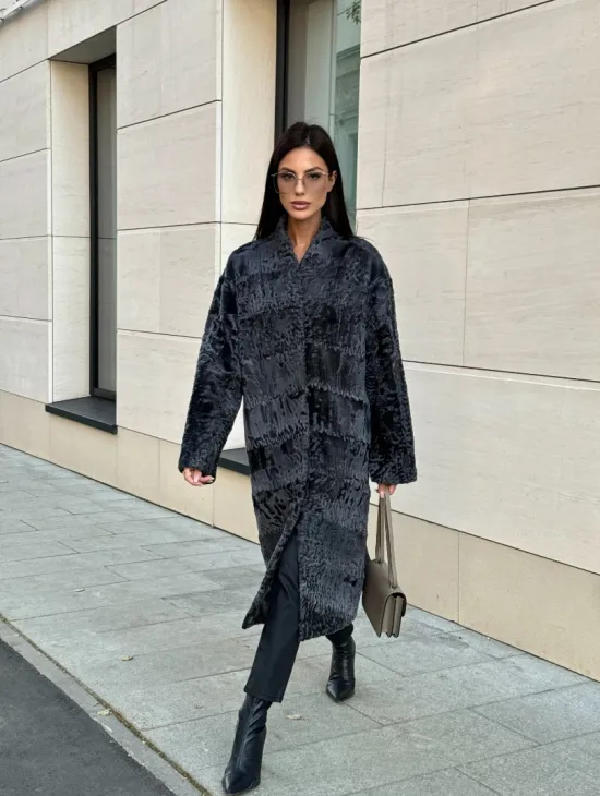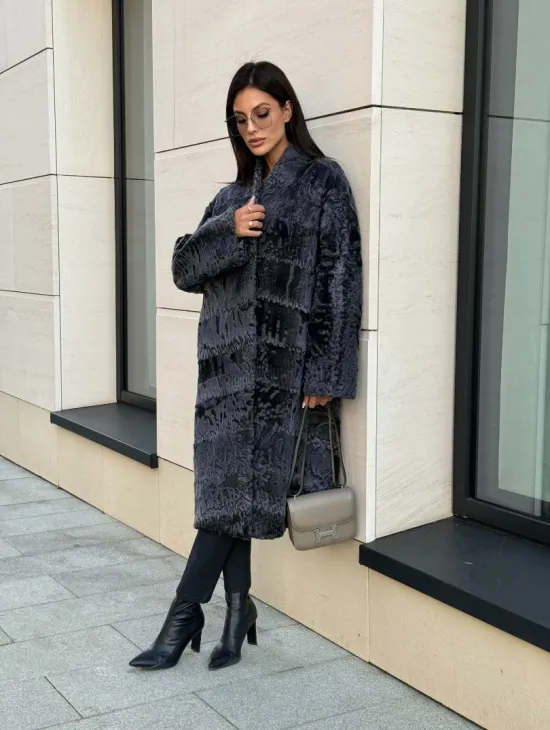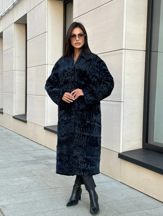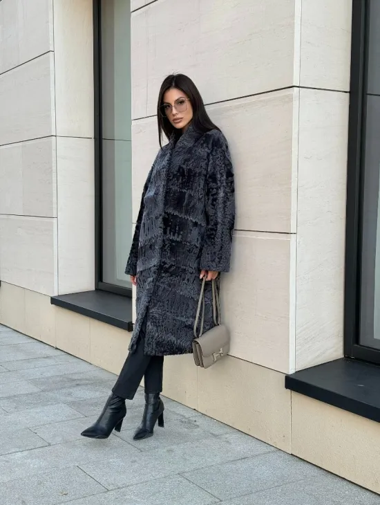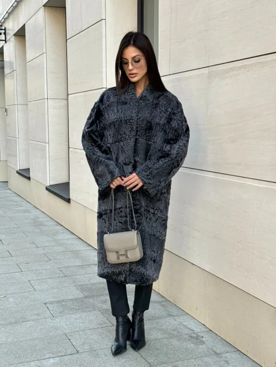 Шуба из каракуля Indigo Blue с отделкой из меха норки, фасон кокон