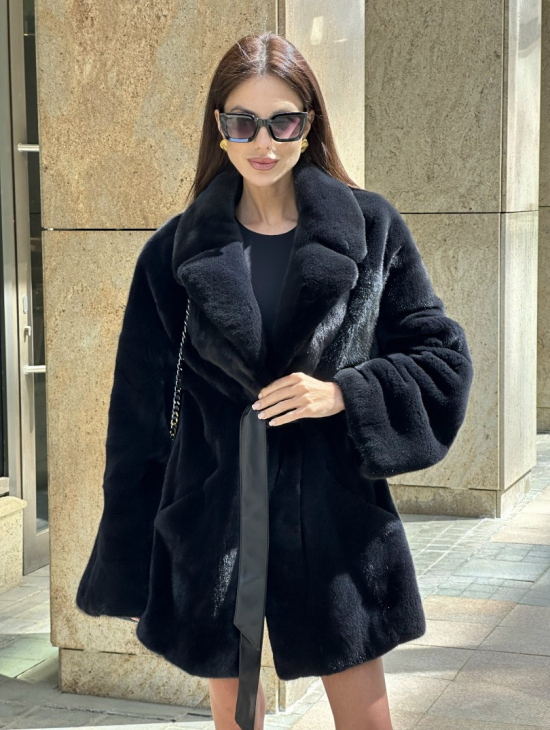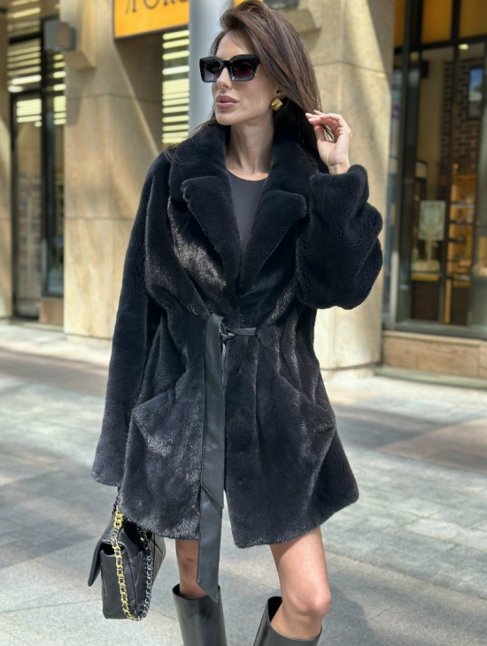 Полушубок из плюшевой норки с английским воротником - цвет инфинити