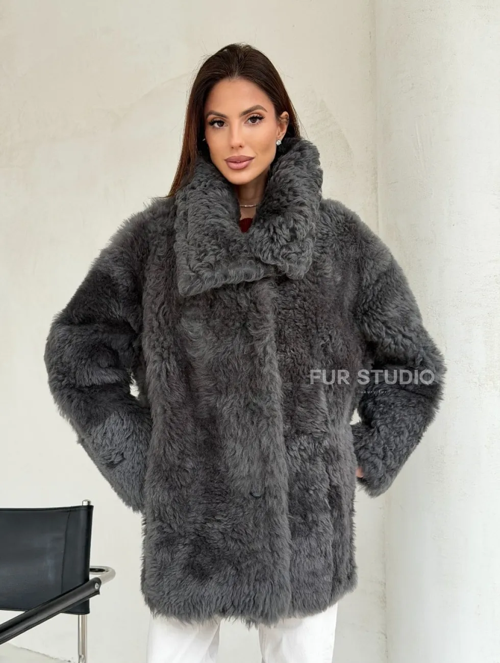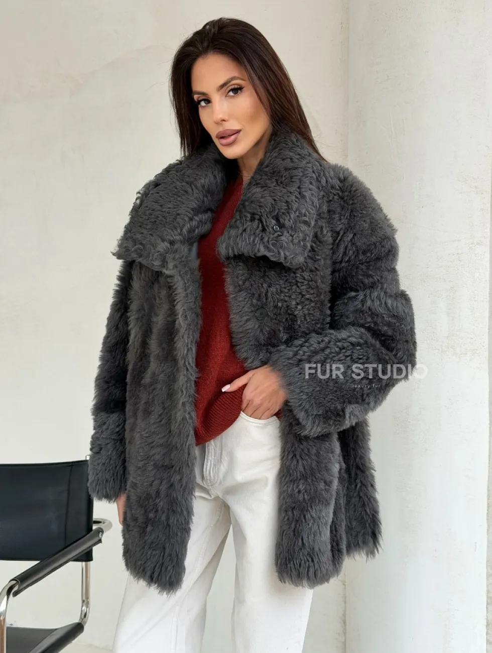 Серая дубленка из тиградо. Модель предлагается в размерах от 42 до 48. Оптимальная длина моделей 70-75 см подчеркивает линии вашей фигуры. Эта дубленка станет неотъемлемой частью гардероба для тех, кто предпочитает роскошь и утонченность натуральной кожи.