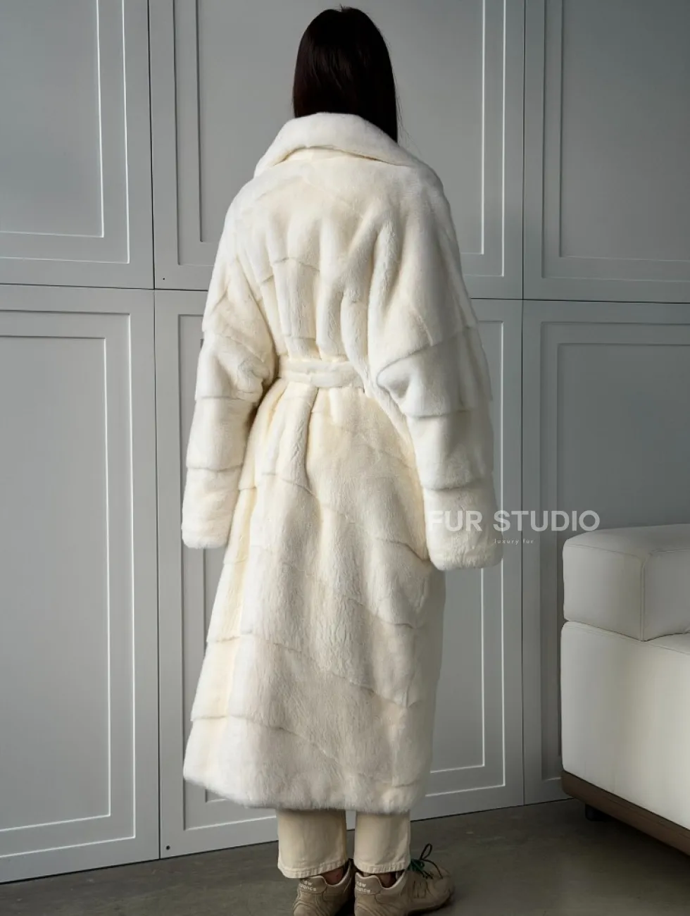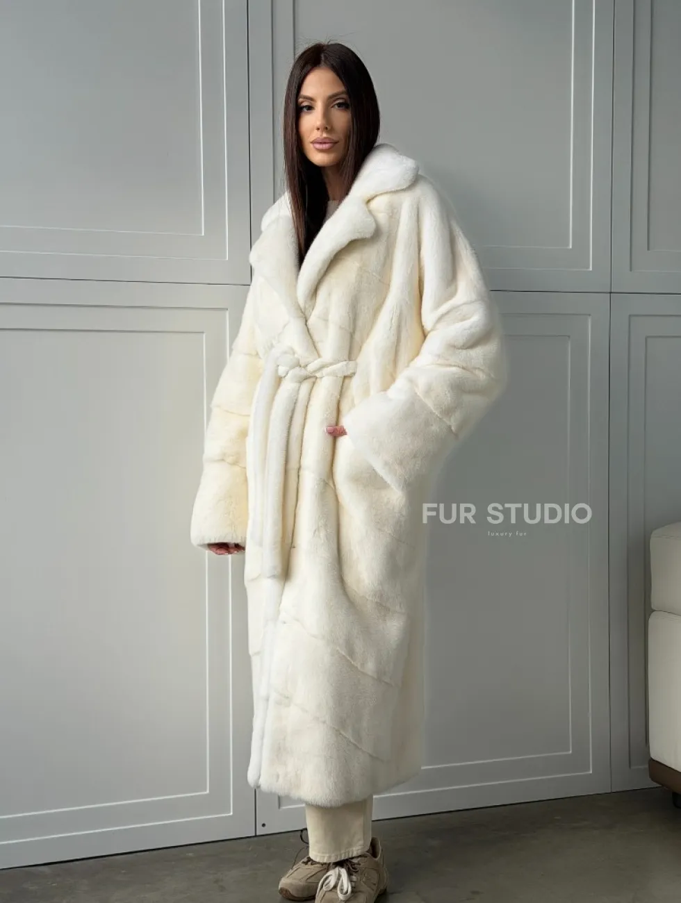 Роскошные рукава добавляют изысканности модели. Шикарные карманы позаботятся о комфорте ручек. Миниатюрная сумочка и грубая обувь сделают ваш образ гармоничным. Качество изделия будет радовать многие годы. Купить белую шубу из плюшевой норки с английским воротником могут дамы, которые обладают безукоризненным вкусом стиля.