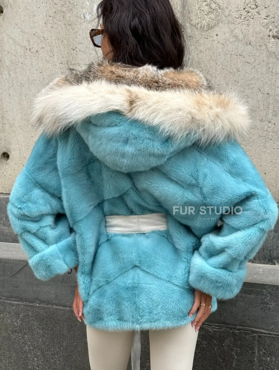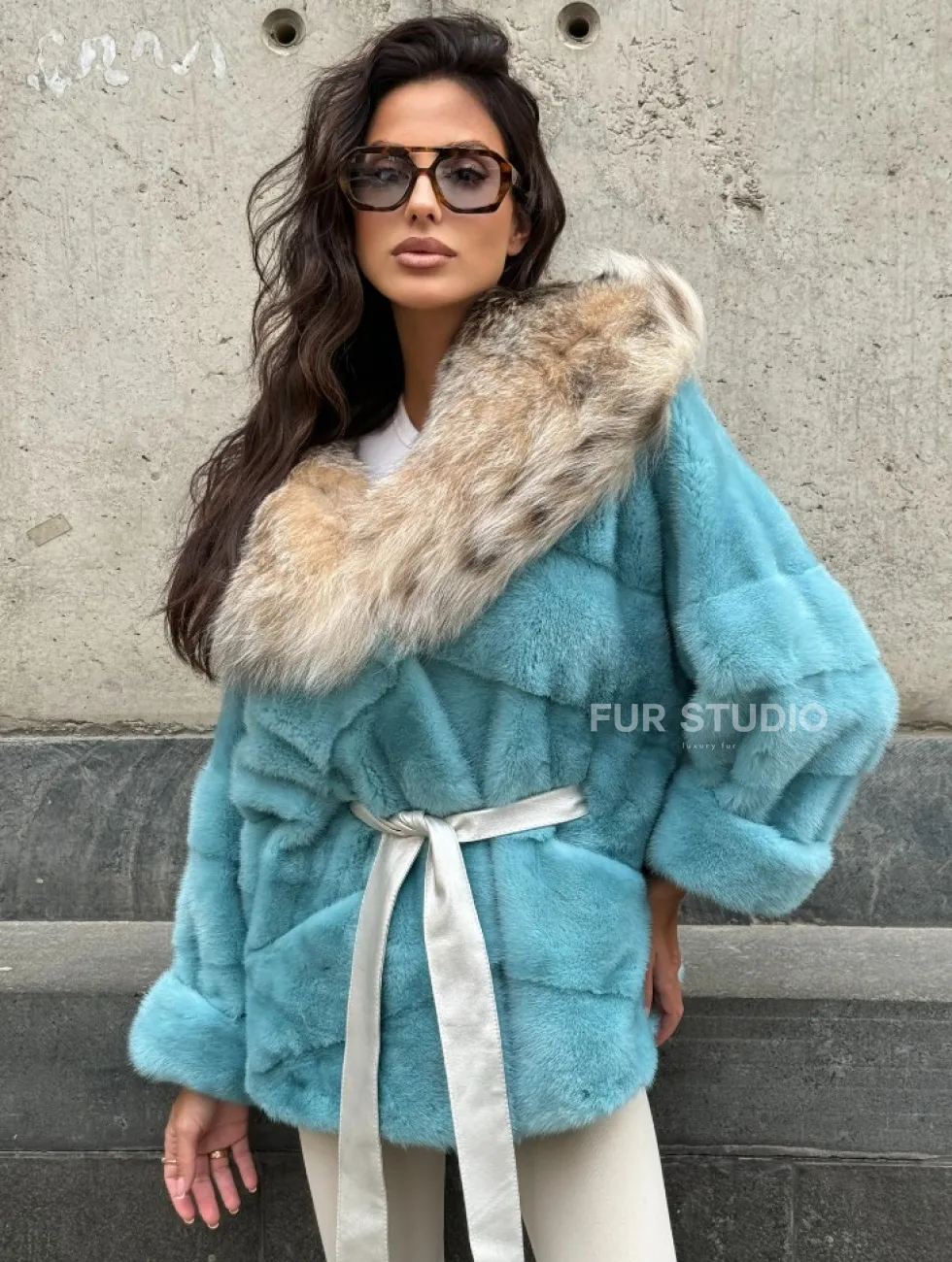 Шуба автоледи из норки с капюшоном из меха рыси - цвет Tiffany 101087
