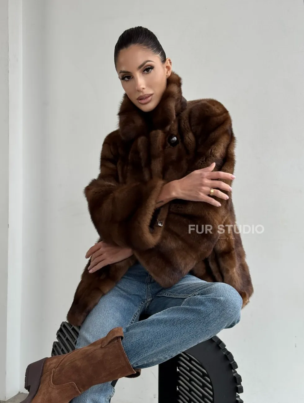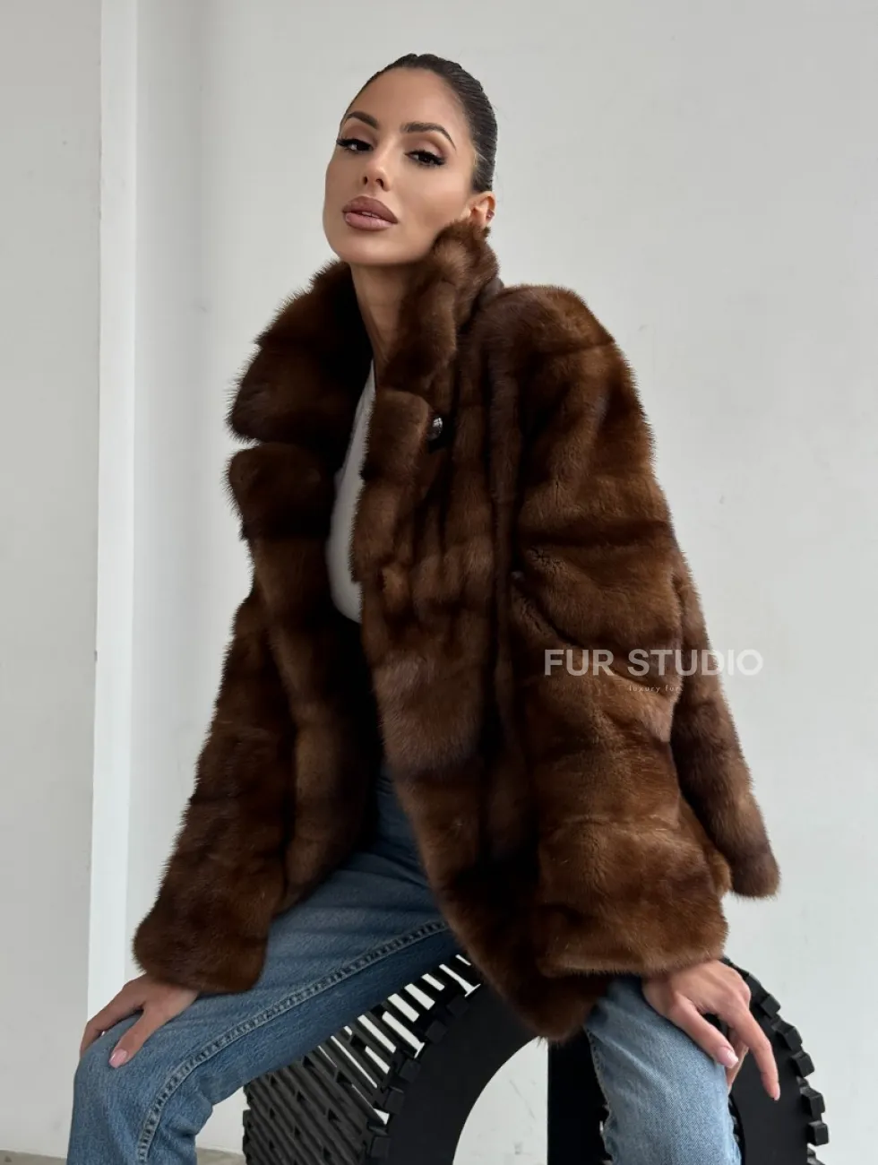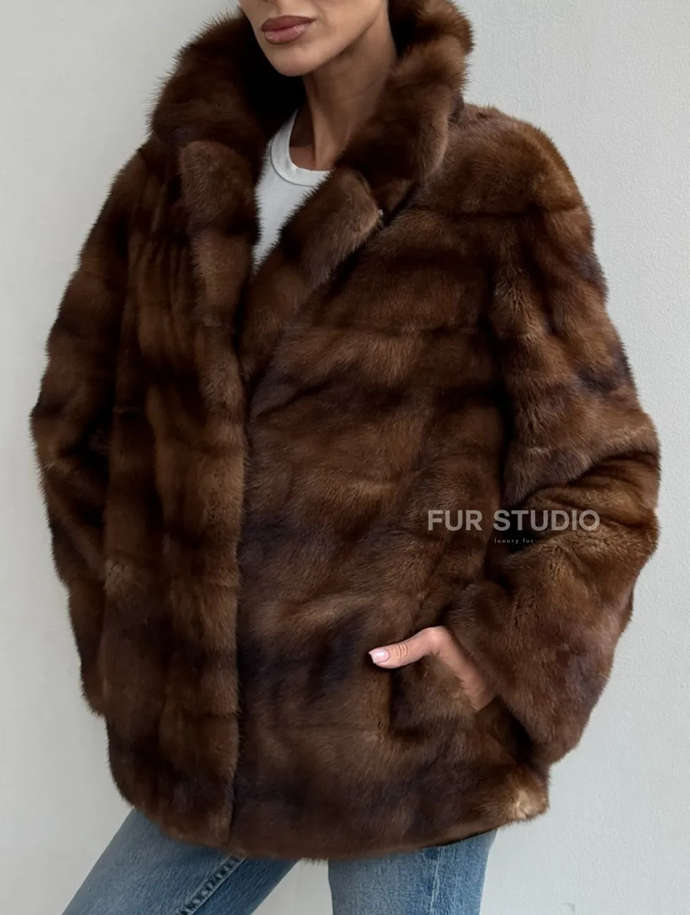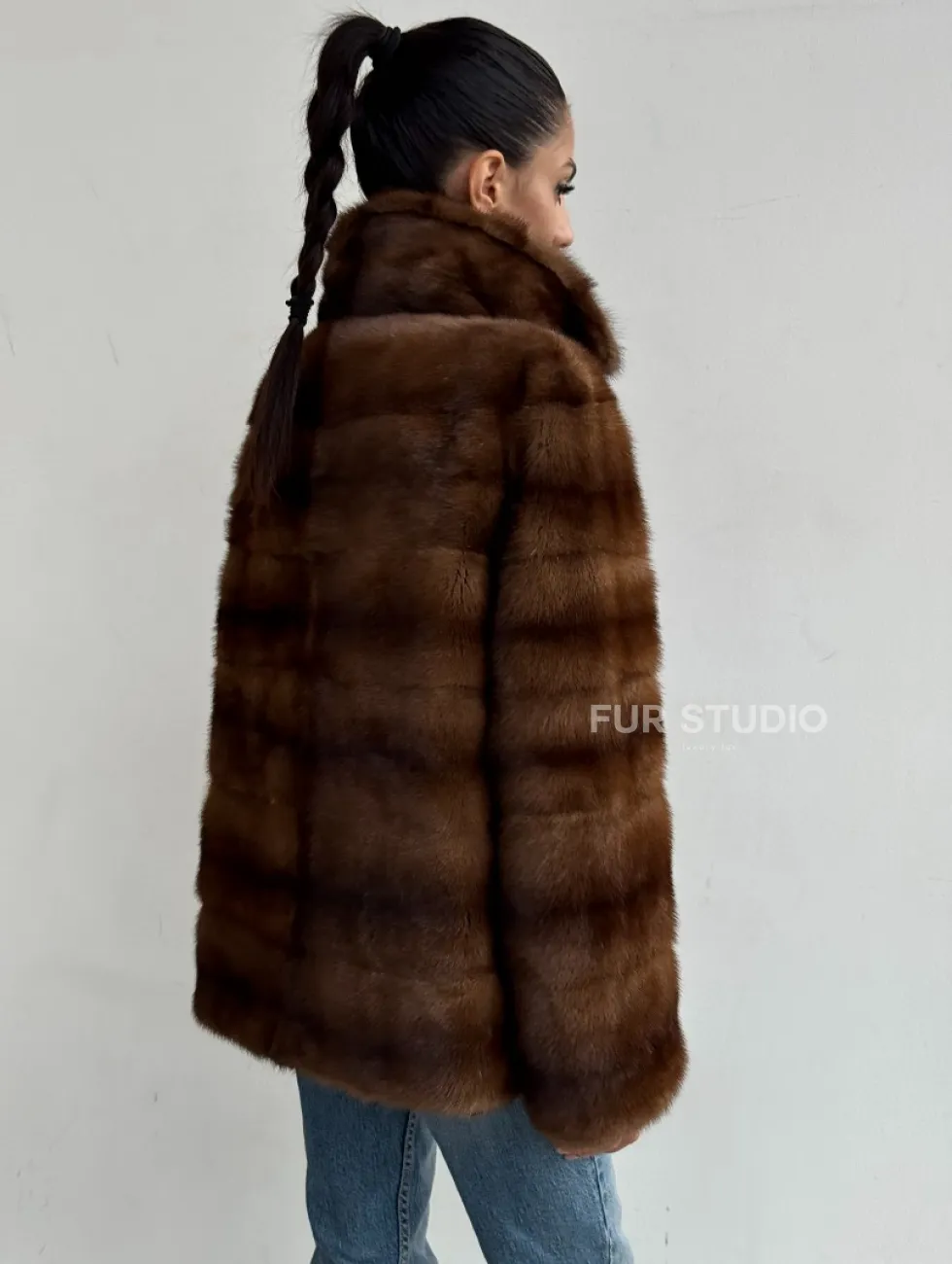 Мех данной шубы аукционная норка, цвет коричневый. Предлагается в размерах от 42 до 50. Длина модели 55-60 см, что выгодно подчеркивает фигуру девушек. Эта модель идеально подойдет для девушек и женщин, предпочитающих роскошные натуральные меха.