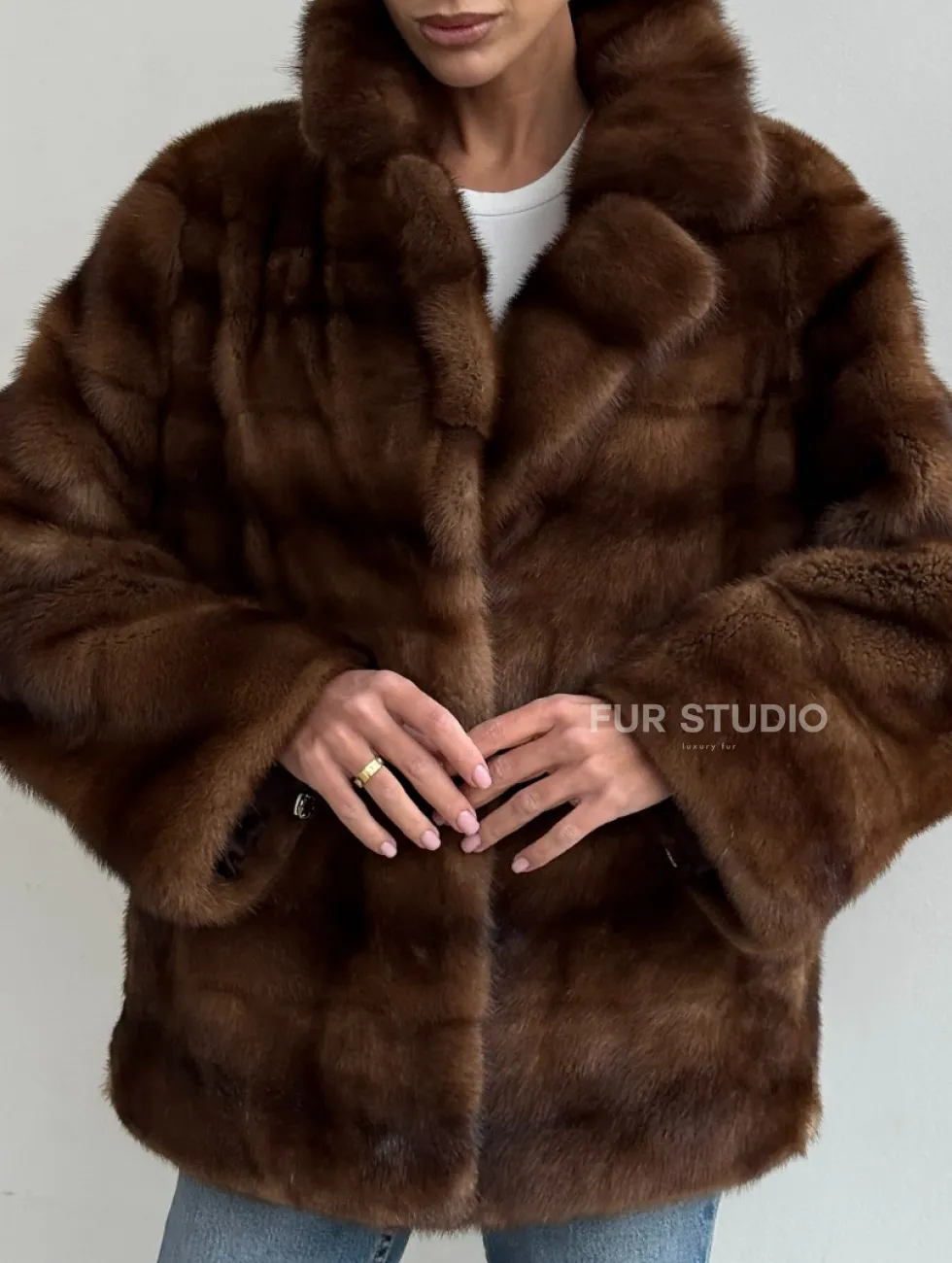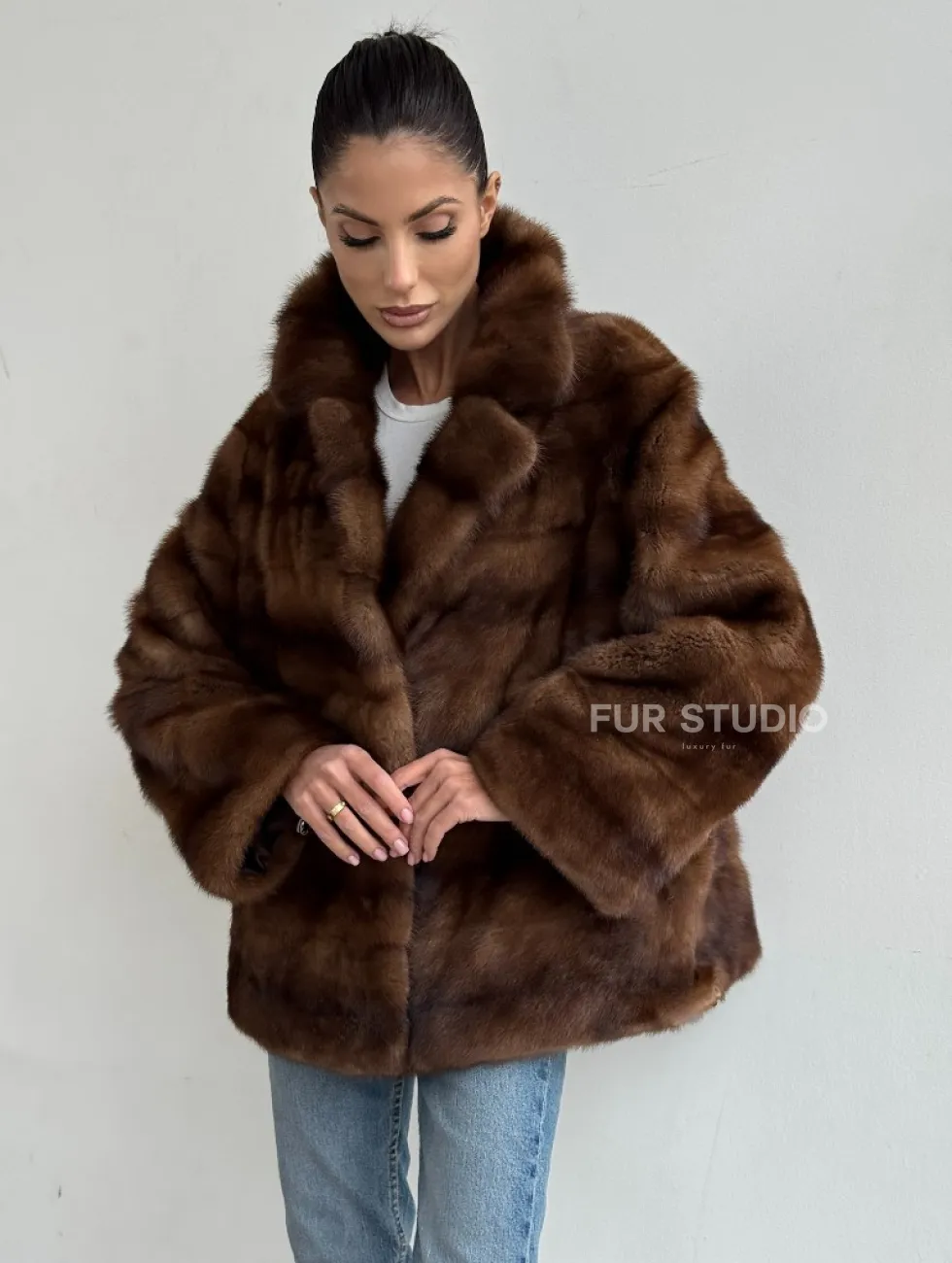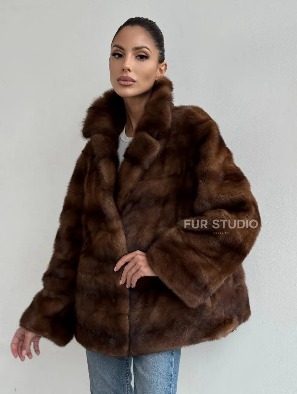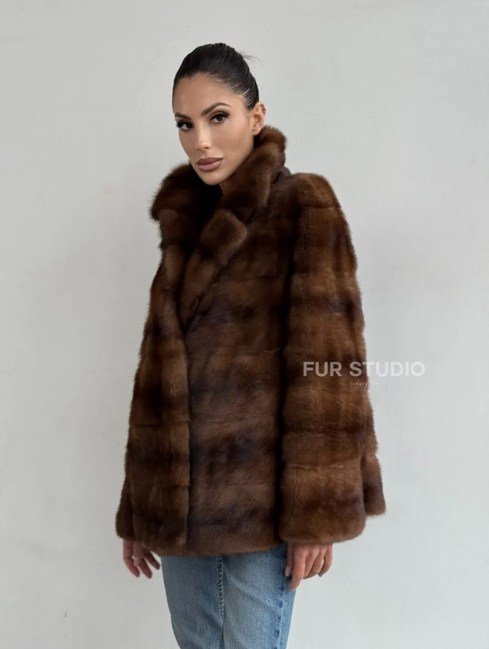 Мех данной шубы аукционная норка, цвет коричневый. Предлагается в размерах от 42 до 50. Длина модели 55-60 см, что выгодно подчеркивает фигуру девушек. Эта модель идеально подойдет для девушек и женщин, предпочитающих роскошные натуральные меха.