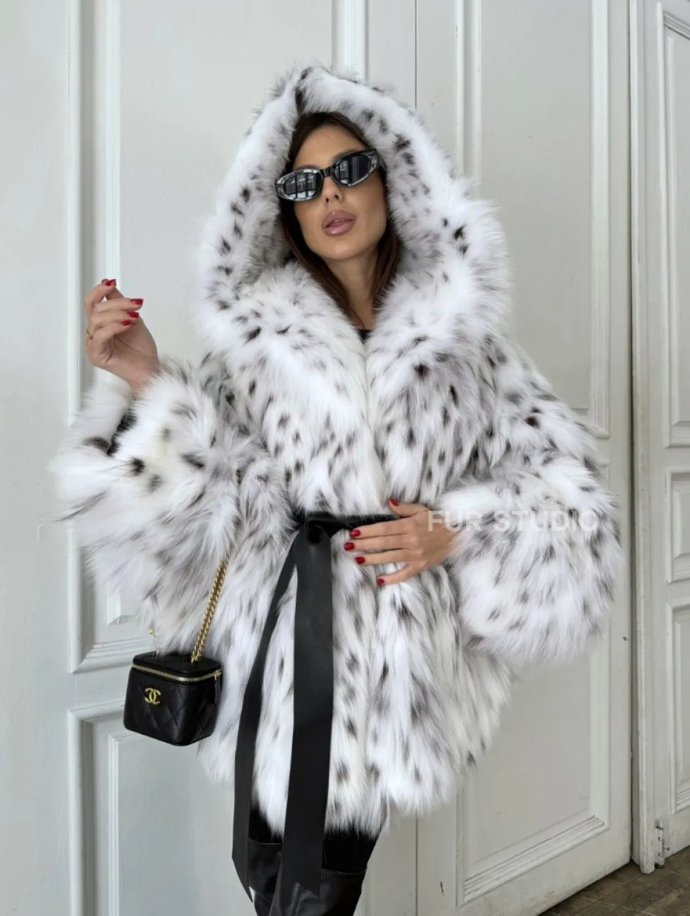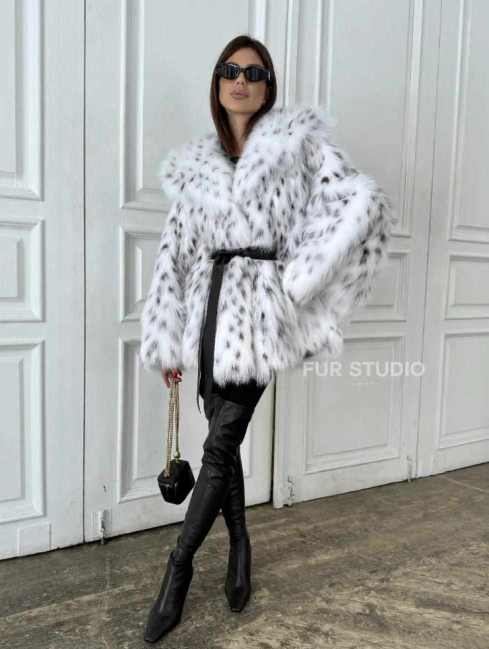 Шуба - Белая лиса с вшитыми пятнами из рыси PREMIUM качество, фасон «летучая мышь» легкая и стильная, созданная специально для уверенной в сете активной роскошной женщины. Даже в длине до середины бедра шуба из лисы подарит уют и тепло в любую погоду: в ней комфортно прогуливаться в морозные и ветреные дни, причем не только от такси до ресторана.