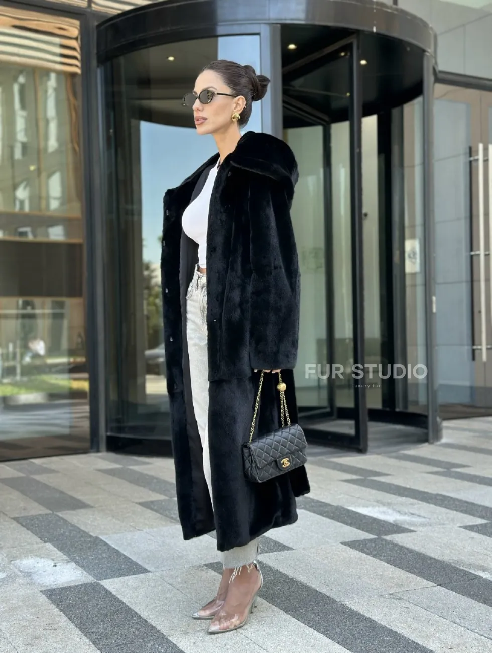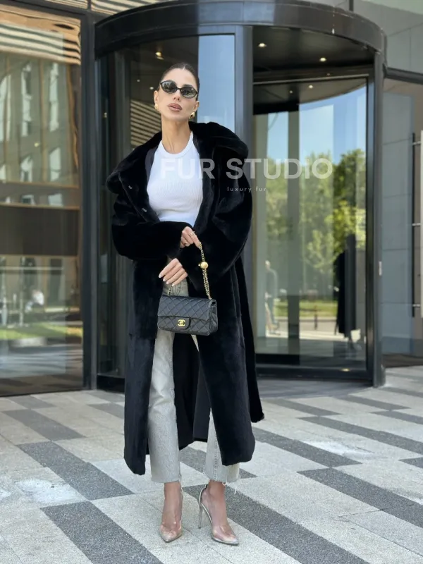 Мех данной шубы норка Blackglama , цвет черный. Предлагается в размерах от 40 до 52. Длина модели 115-120 см, что выгодно подчеркивает фигуру девушек. Эта модель идеально подойдет для девушек и женщин, предпочитающих роскошные натуральные меха.