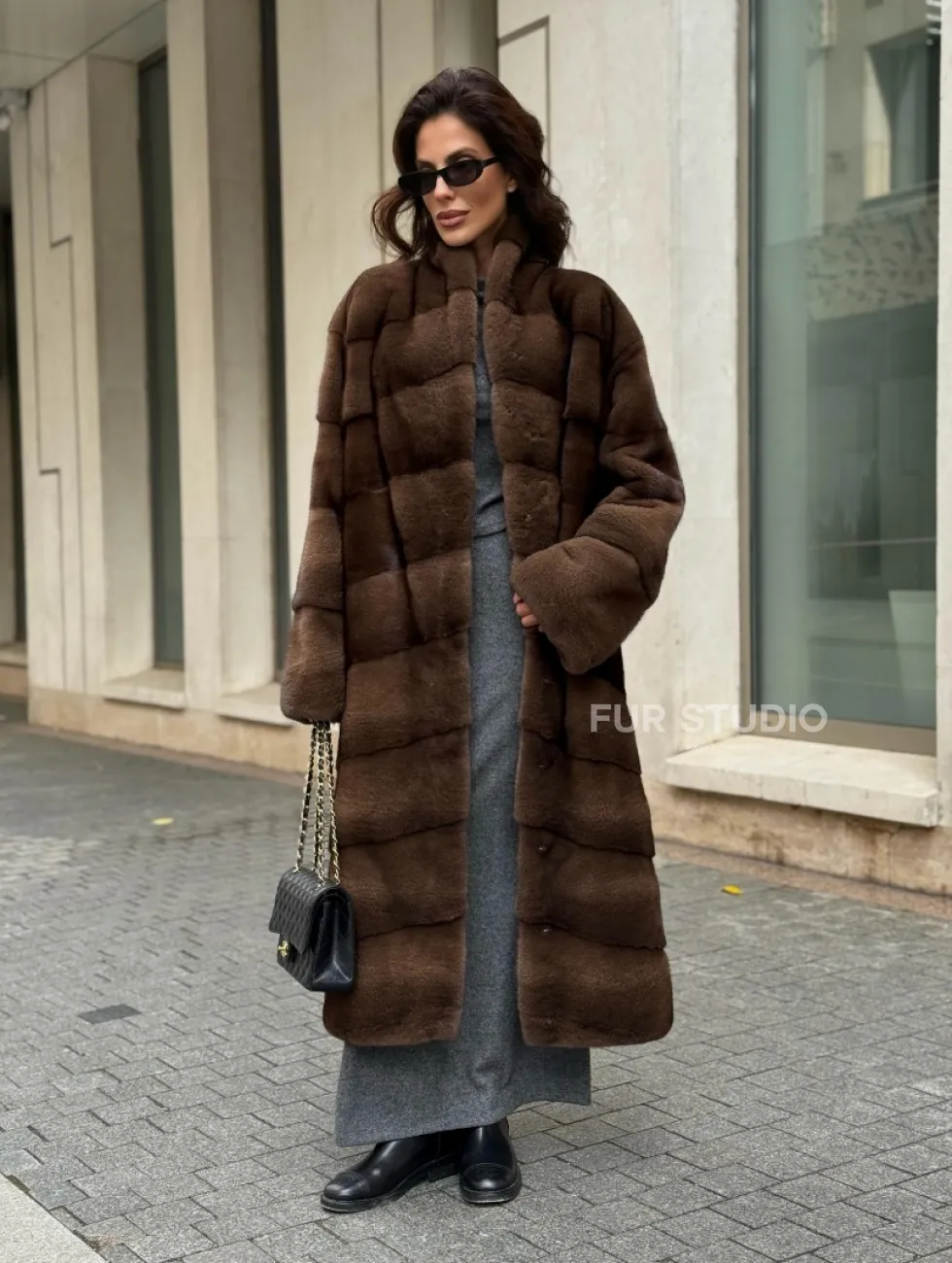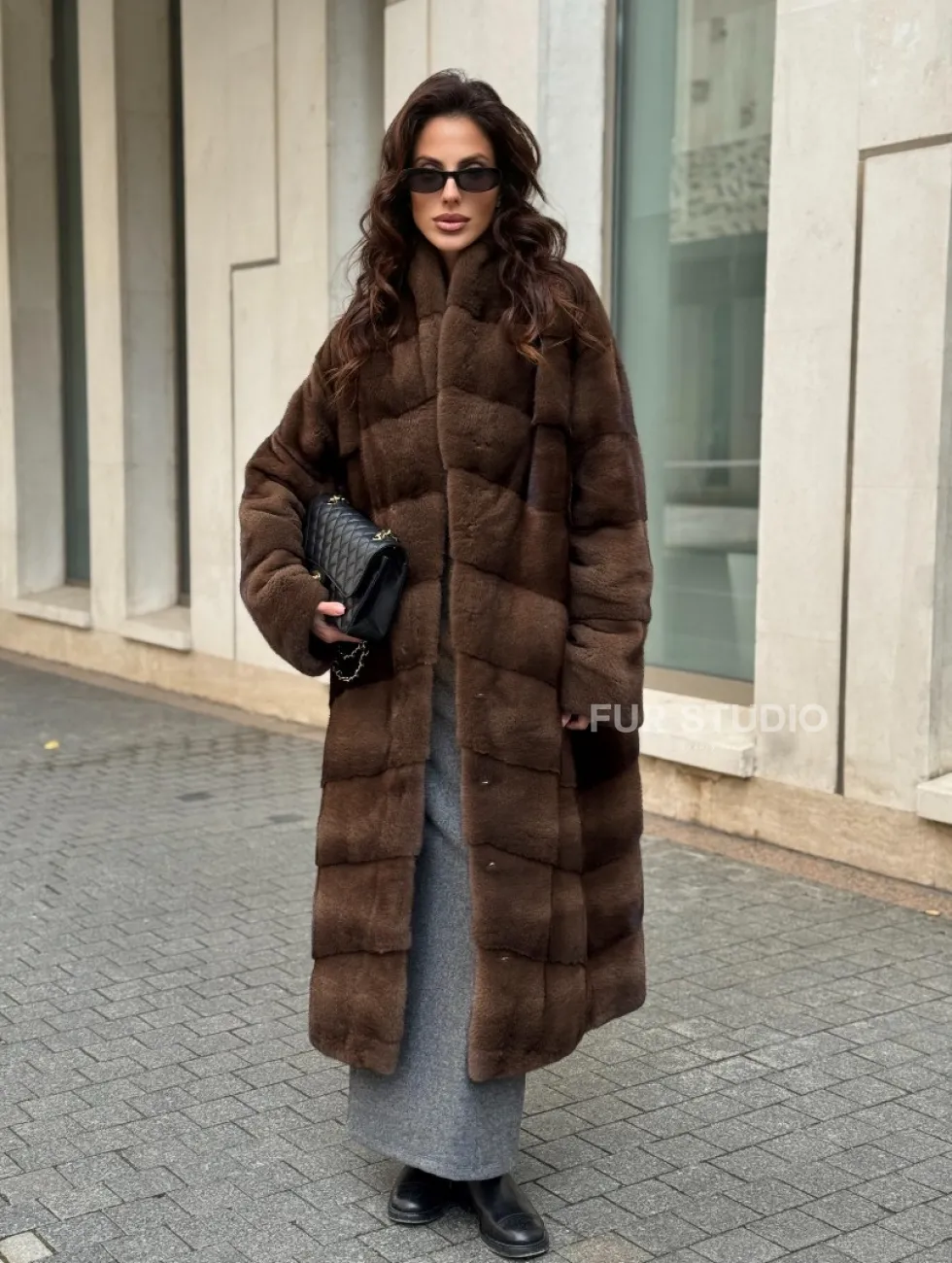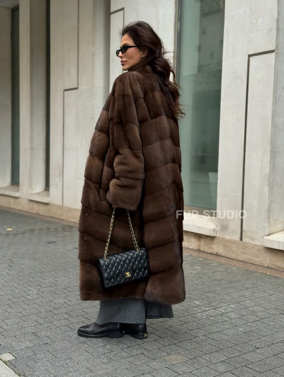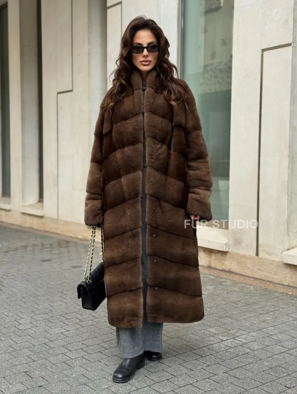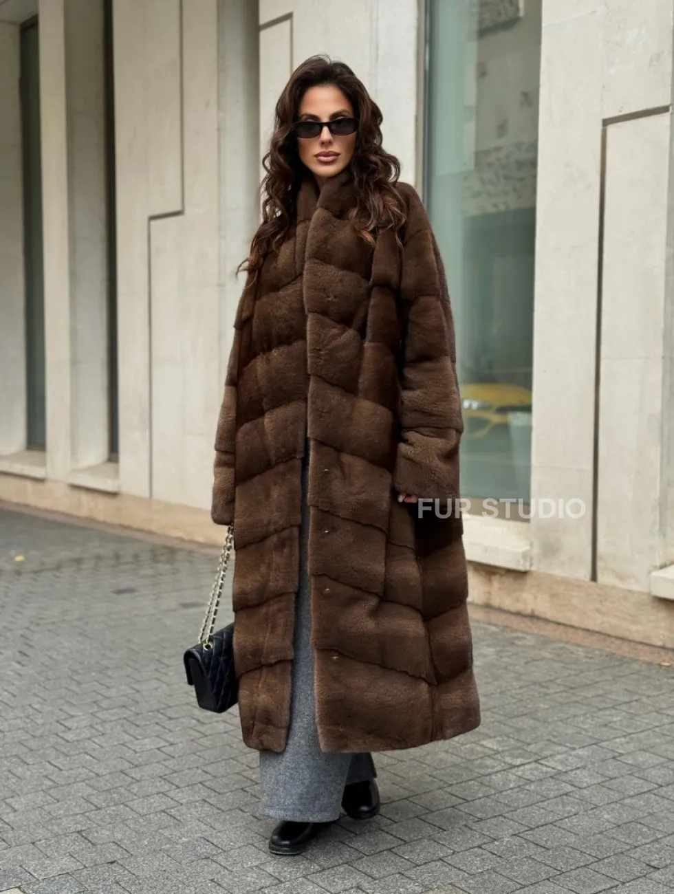 Мех данной шубы аукционная норка , цвет коричневый. Предлагается в размерах от 42 до 52. Длина модели 120-125 см, что выгодно подчеркивает фигуру девушек. Эта модель идеально подойдет для девушек и женщин, предпочитающих роскошные натуральные меха.