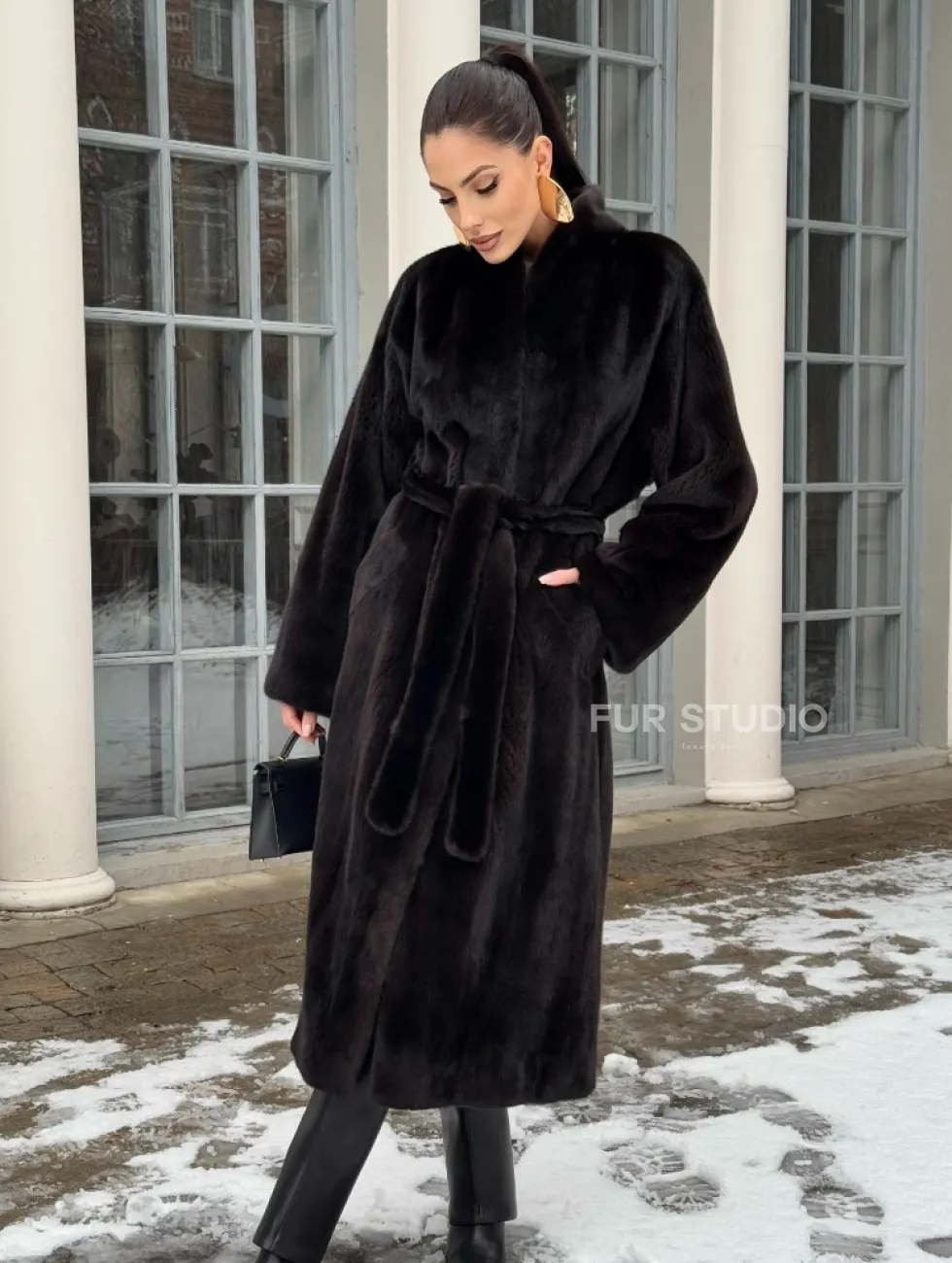 Мех данной шубы аукционная норка , цвет коричневый. Предлагается в размерах от 42 до 46 с (48 по 52 индивидуальный пошив). Длина модели 115-120 см, что выгодно подчеркивает фигуру девушек. Эта модель идеально подойдет для девушек и женщин, предпочитающих роскошные натуральные меха.