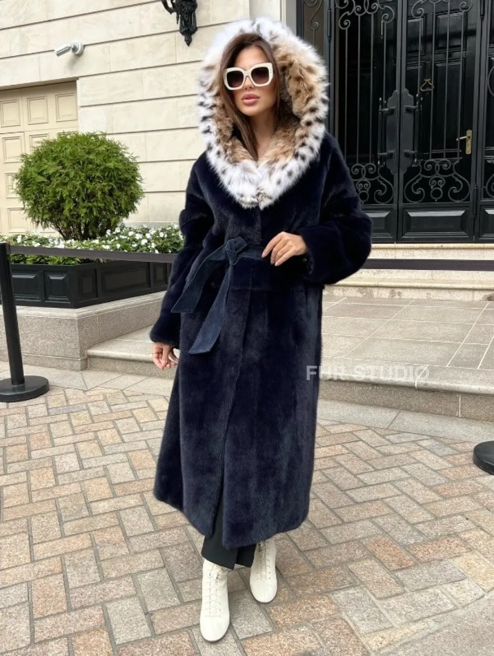 Шуба из аукционной норки с капюшоном из меха рыси создана для любительниц комфорта и уюта. Крой подчеркивает достоинства фигуры и вашу грацию. Аукционная норка – эталон высокого качества. Изделие будет радовать свою обладательницу долгие годы.