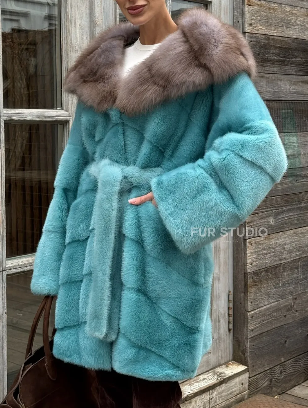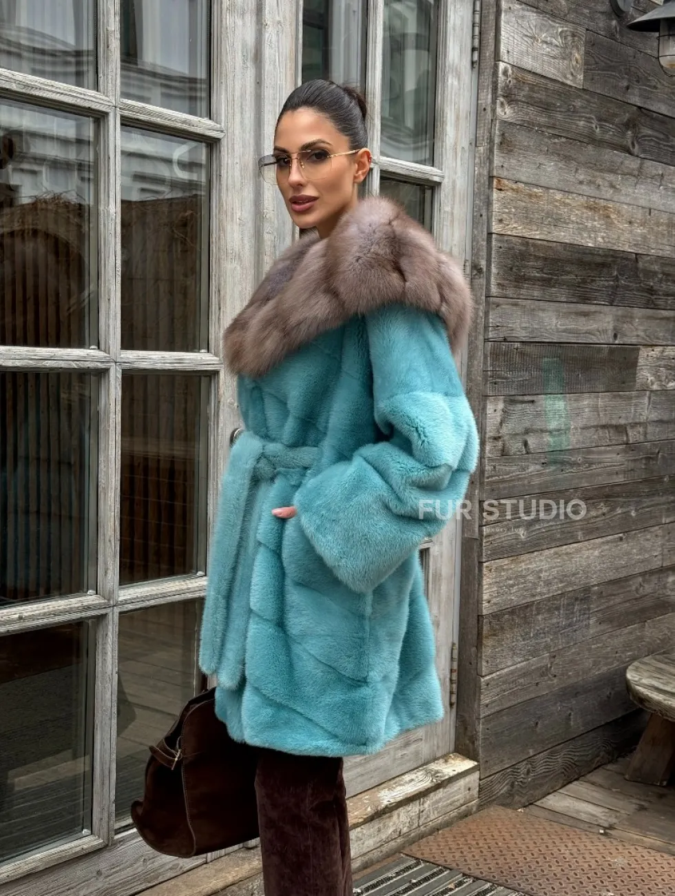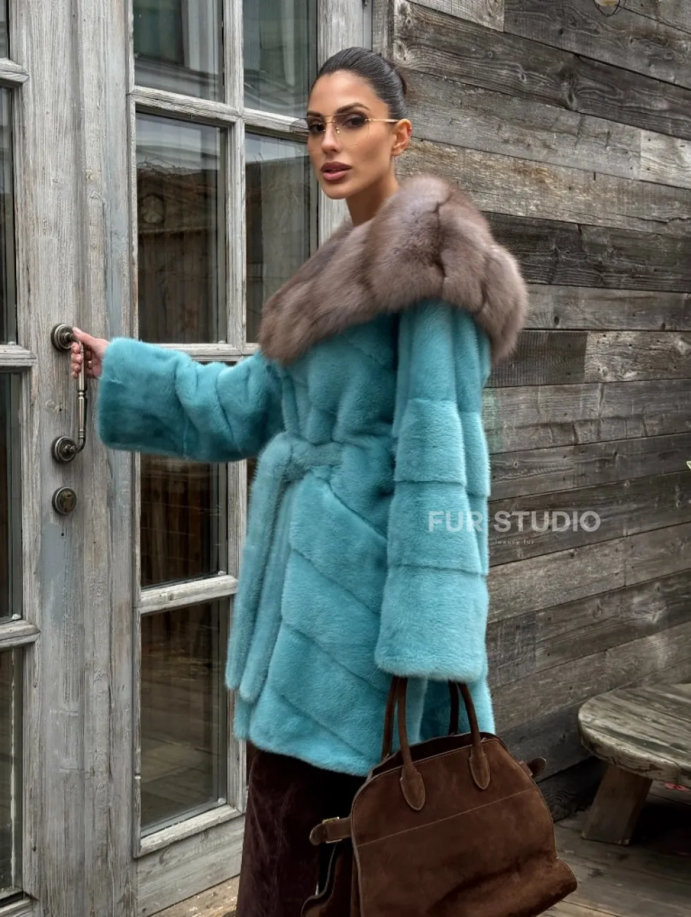 Мех данной шубы аукционная норка, цвет голубой. Предлагается в размерах от 40 до 50. Длина модели 85-90 см, что выгодно подчеркивает фигуру девушек. Эта модель идеально подойдет для девушек и женщин, предпочитающих роскошные натуральные меха.