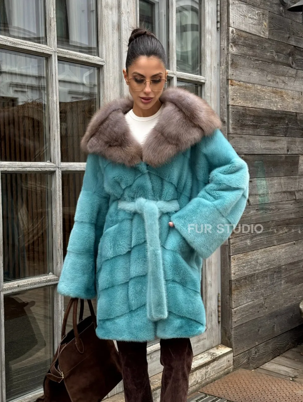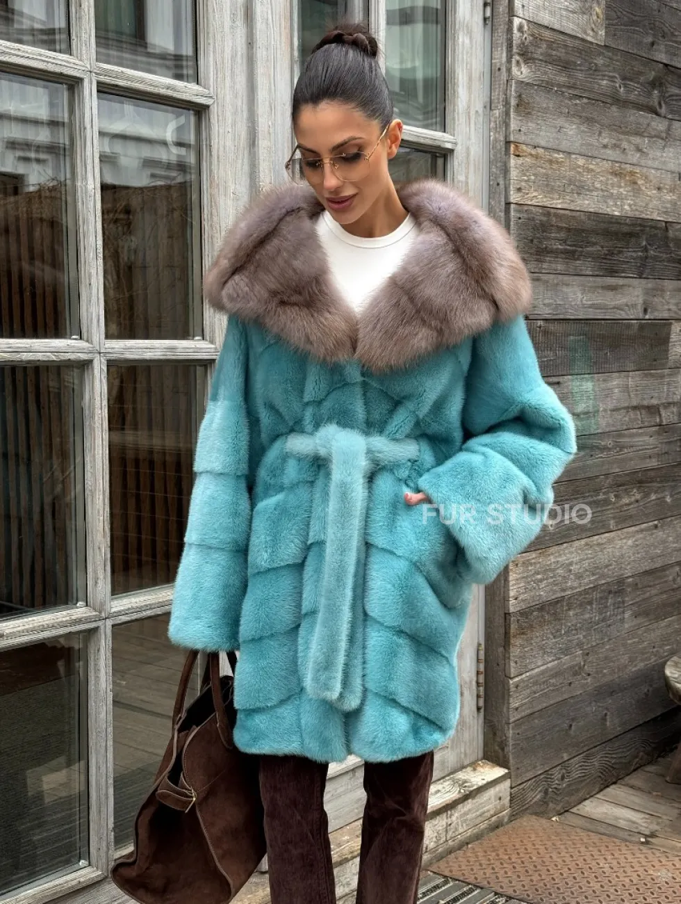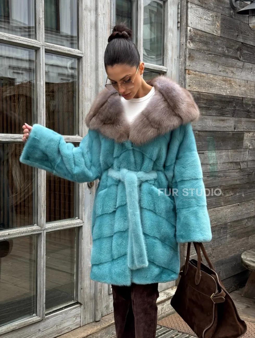 Мех данной шубы аукционная норка, цвет голубой. Предлагается в размерах от 40 до 50. Длина модели 85-90 см, что выгодно подчеркивает фигуру девушек. Эта модель идеально подойдет для девушек и женщин, предпочитающих роскошные натуральные меха.