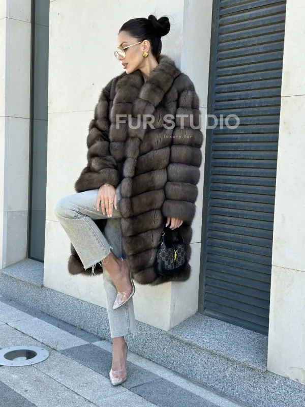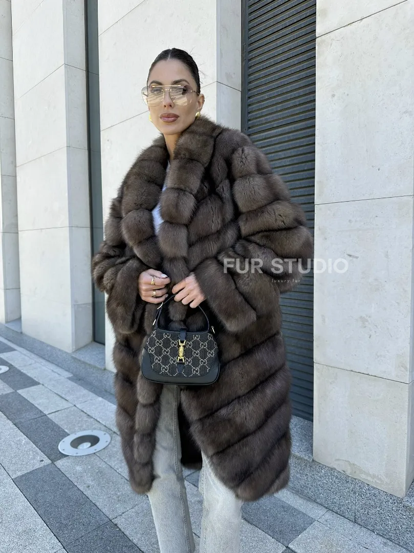 Легкая и стильная шуба из темного меха баргузинского соболя в длине миди — выбор деловых и активных женщин. Эта модель отлично подходит тем, кто ездит за рулем, но также и для любительниц прогуливаться пешком в любую погоду.