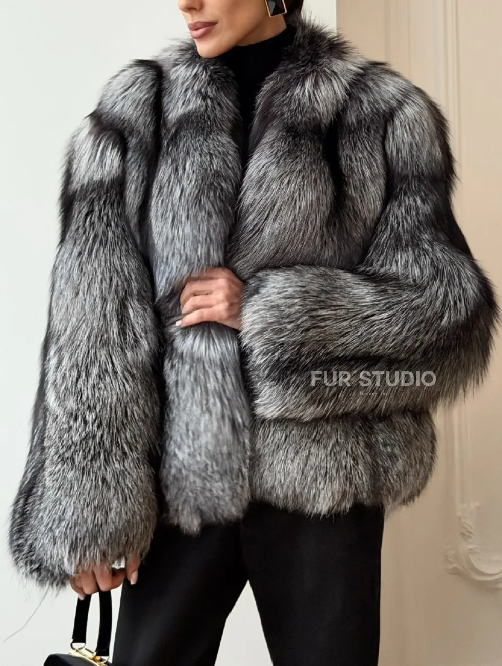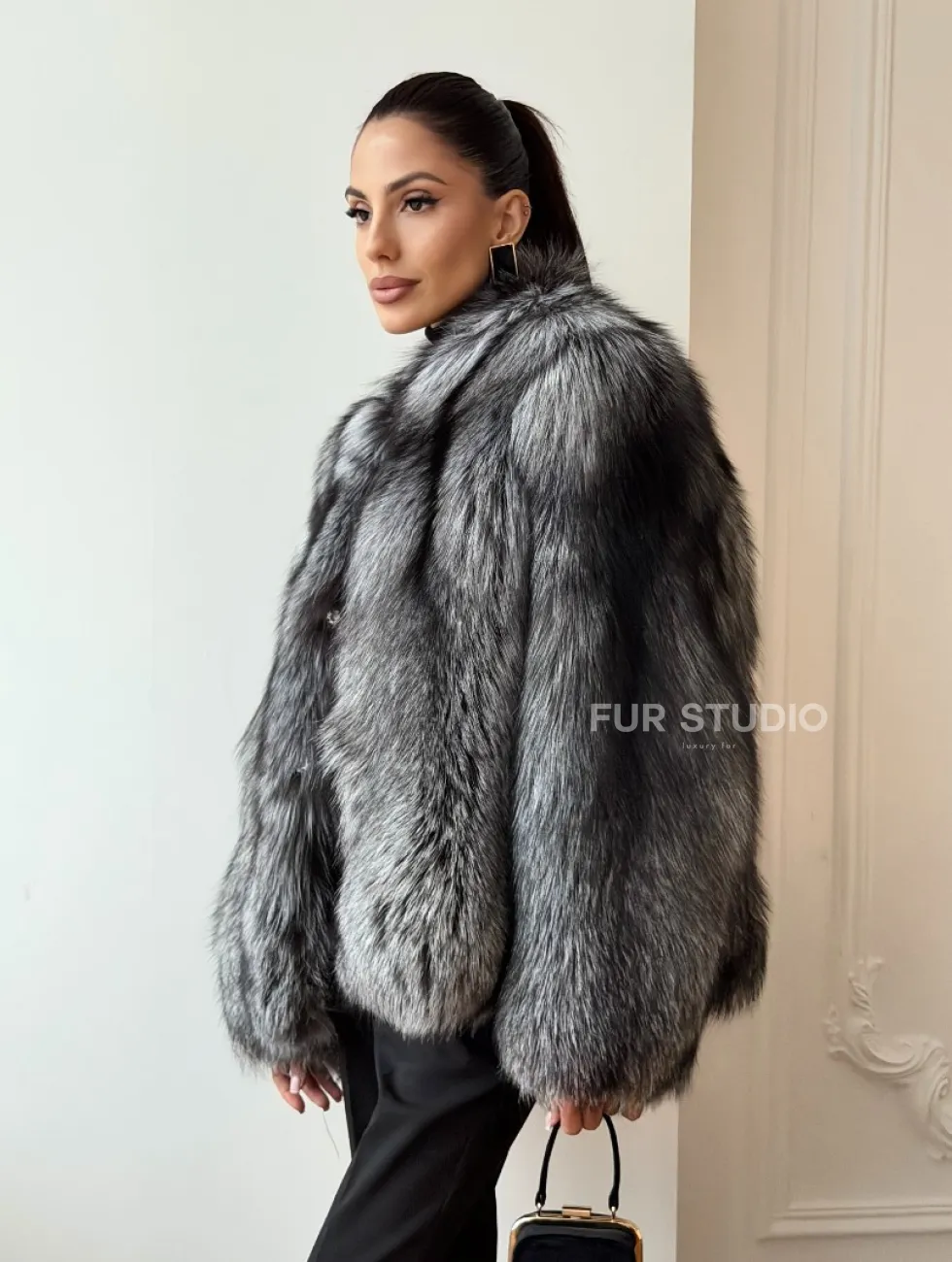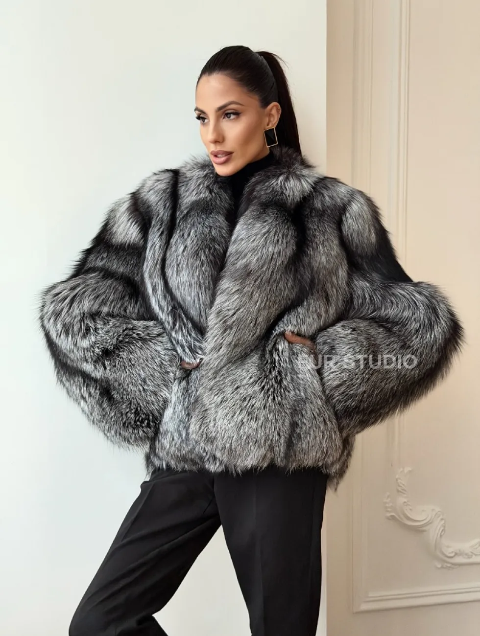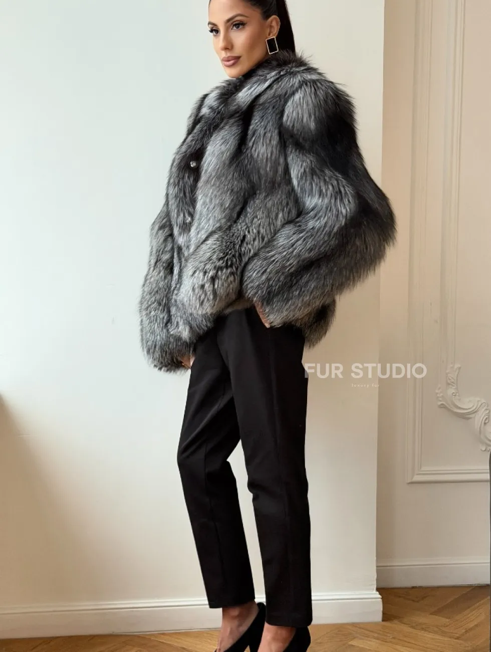 Мех данной шубы лиса, цвет серый. Предлагается в размерах от 42 до 50. Длина модели 60-65 см, что выгодно подчеркивает фигуру девушек. Эта модель идеально подойдет для девушек и женщин, предпочитающих роскошные натуральные меха.
