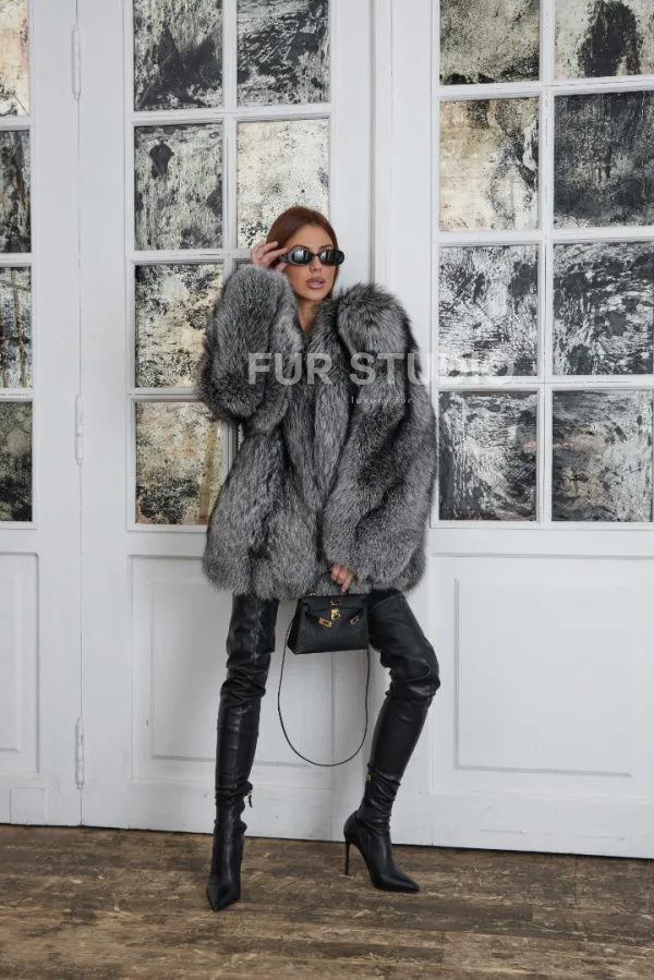 Мех данной шубы лиса, цвет серый. Предлагается в размерах от 42 до 46. Длина модели 70-75 см, что выгодно подчеркивает фигуру девушек. Эта модель идеально подойдет для девушек и женщин, предпочитающих роскошные натуральные меха.