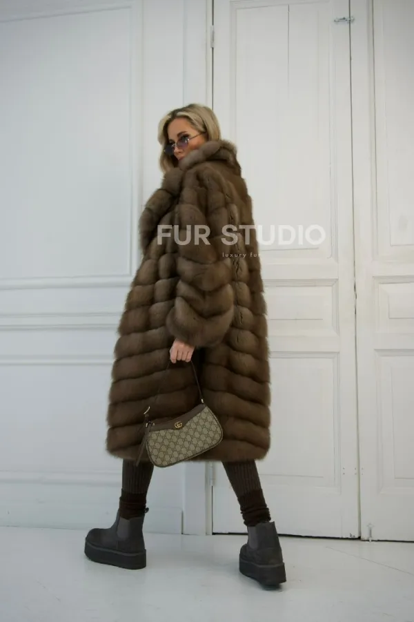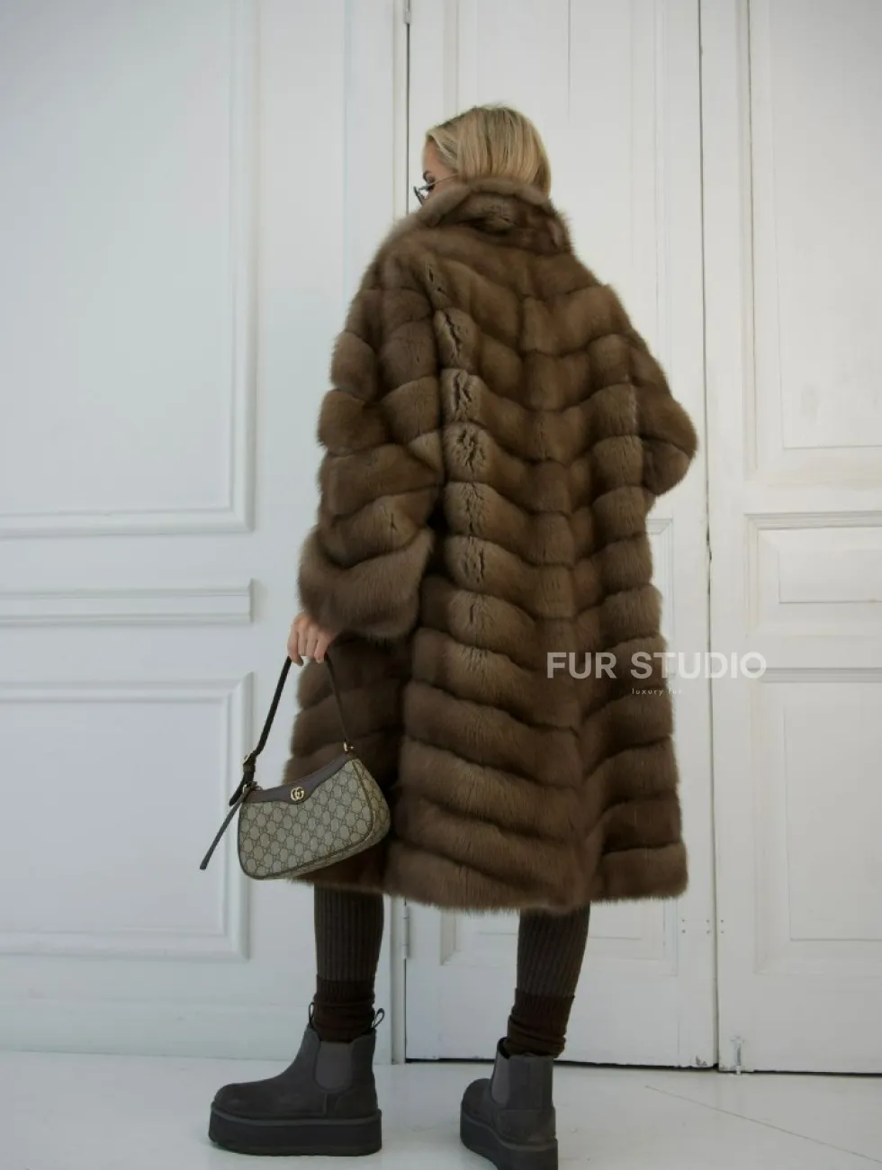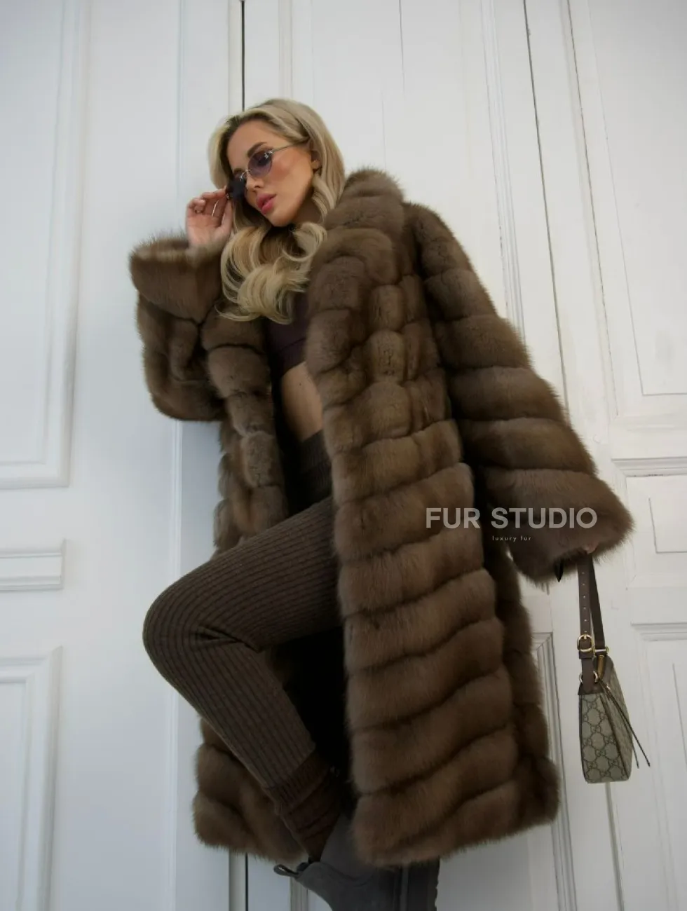 Мех данной шубы лесная куница, цвет натуральный. Предлагается в размерах от 42 до 48. Длина модели 95-100 см, что выгодно подчеркивает фигуру девушек. Эта модель идеально подойдет для девушек и женщин, предпочитающих роскошные натуральные меха.