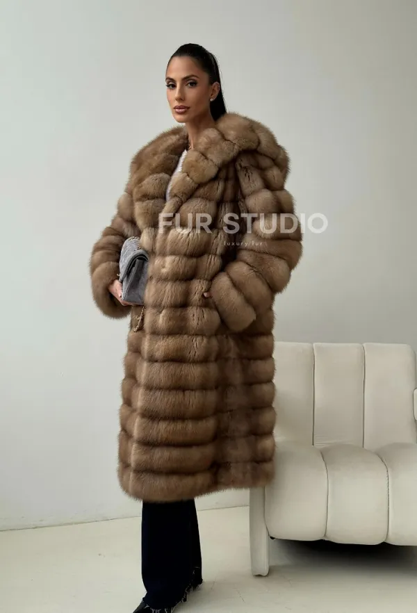Мех данной шубы лесная куница, цвет натуральный. Предлагается в размерах от 42 до 46. Длина модели 105-110 см, что выгодно подчеркивает фигуру девушек. Эта модель идеально подойдет для девушек и женщин, предпочитающих роскошные натуральные меха.