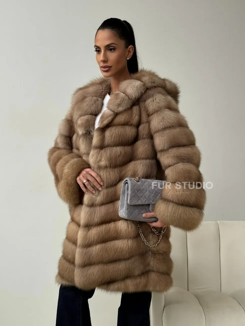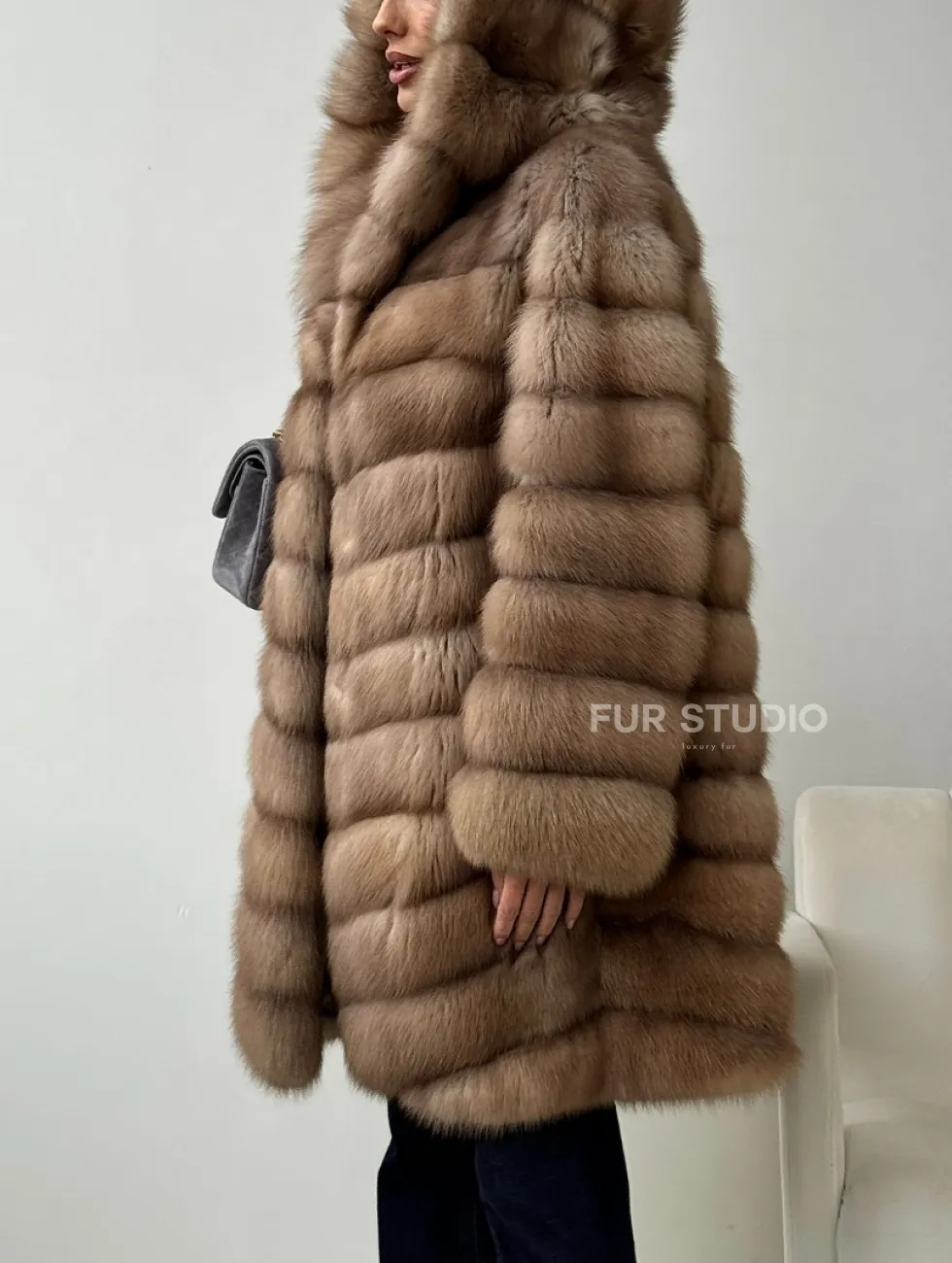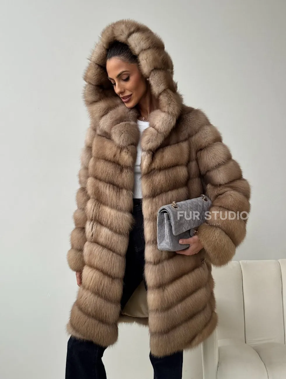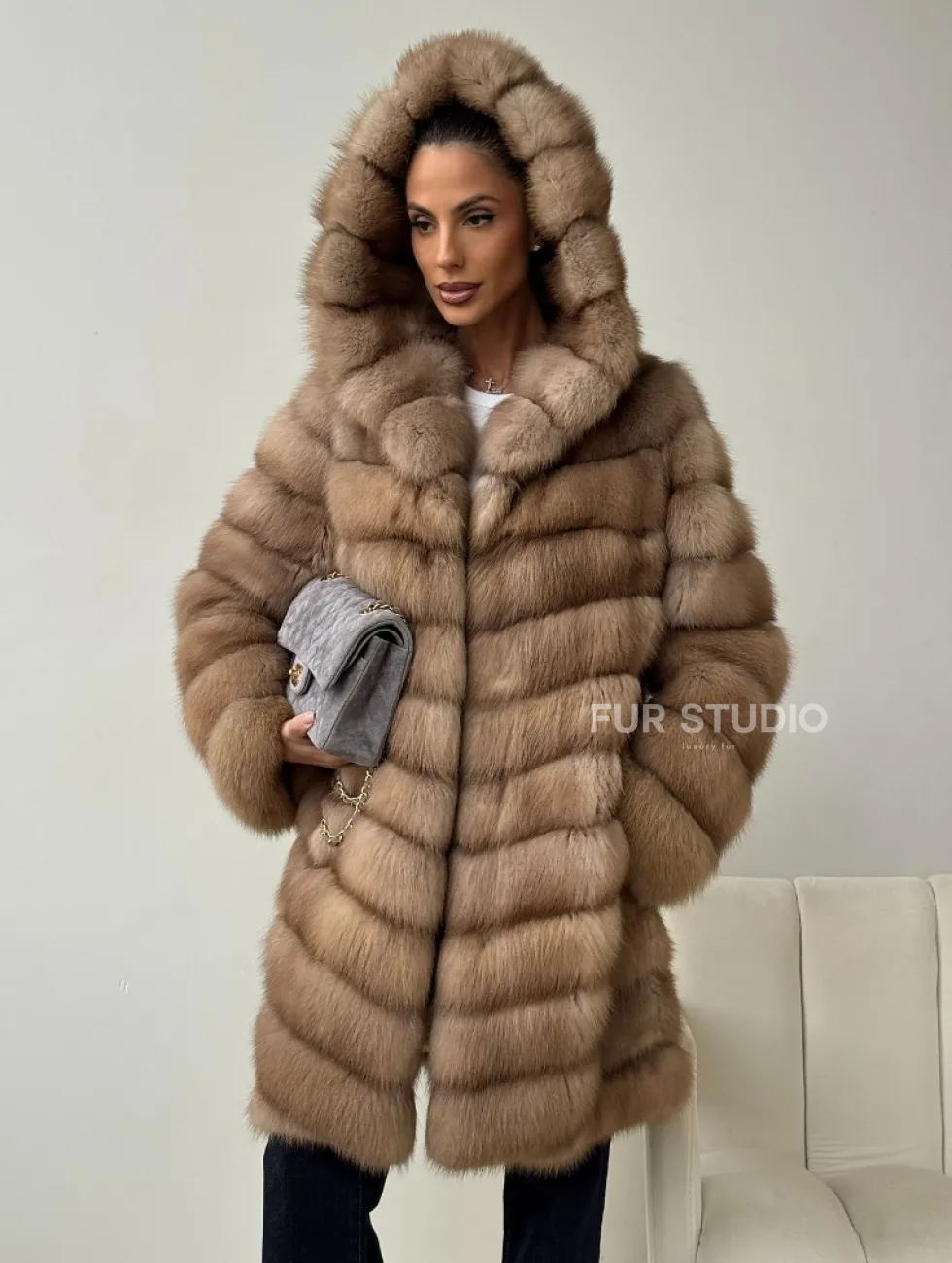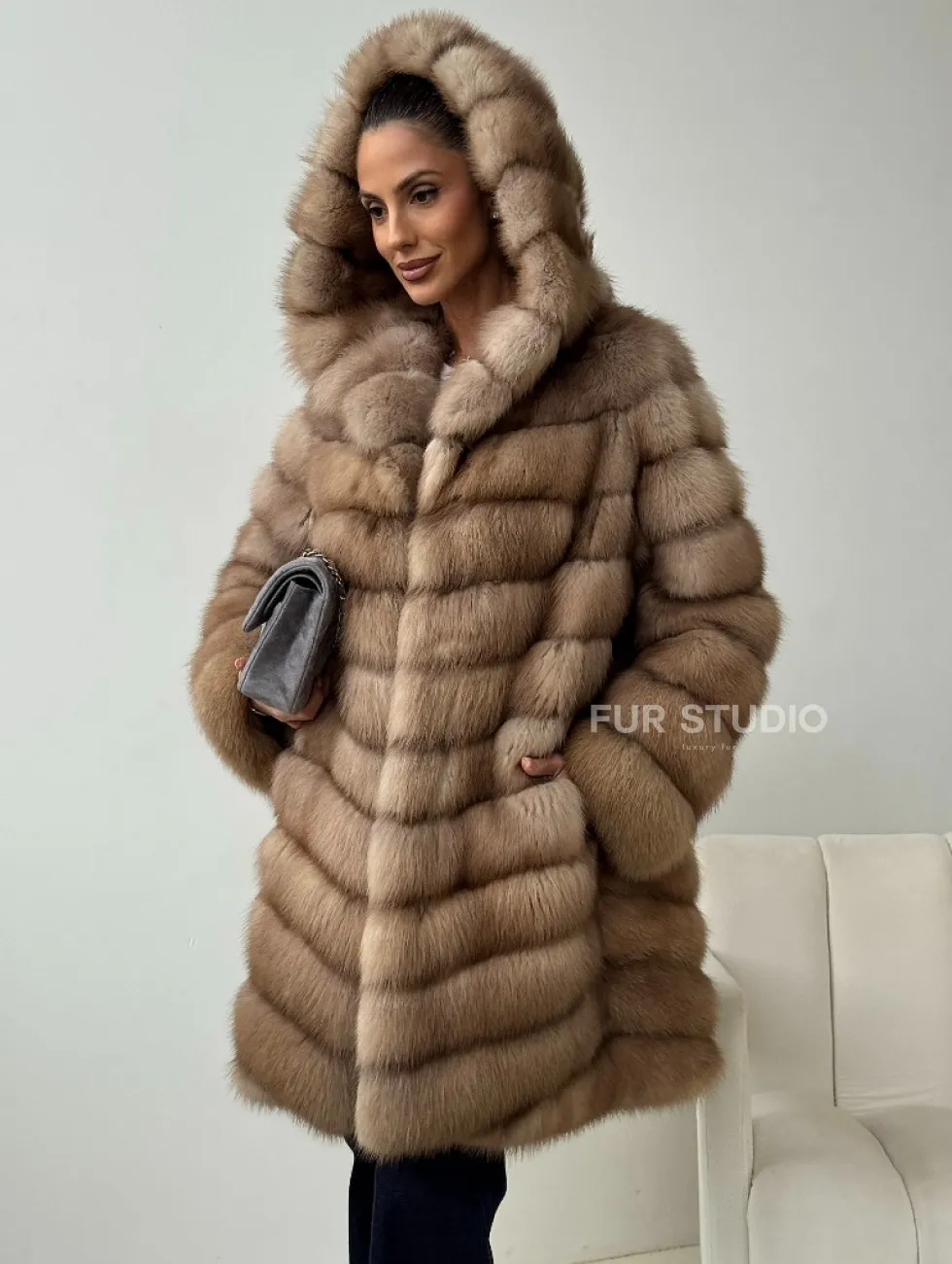 Шуба из куницы с капюшоном в цвете тор-тор доступна для покупки в нашем шоуруме Furs Studio в Чите. У нас так же есть доставка во все города России. Добавьте немного роскоши в свой гардероб с этой шубой, которая будет служить вам многие годы.