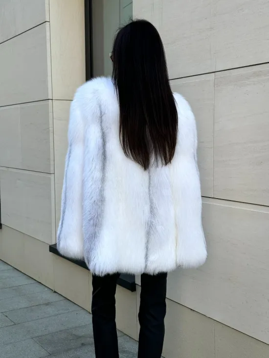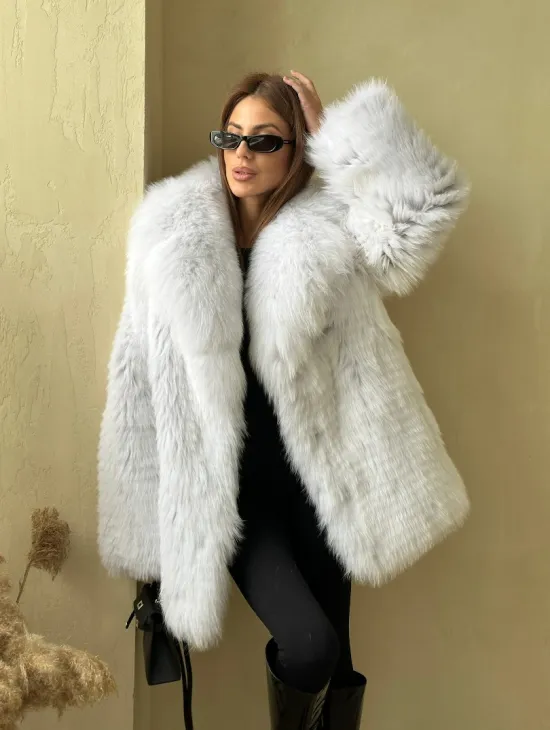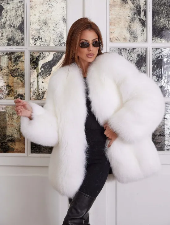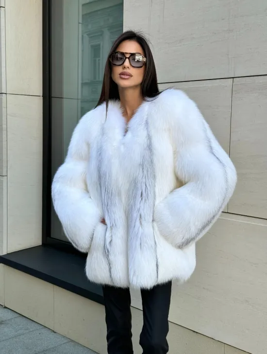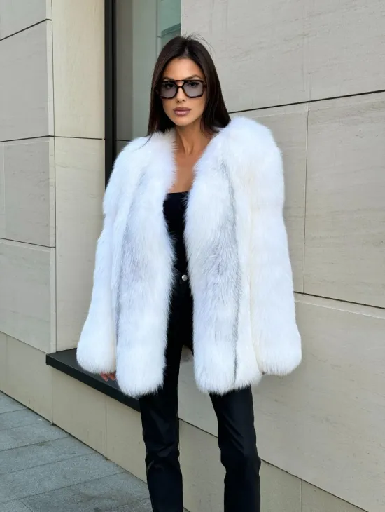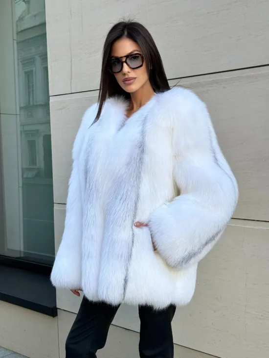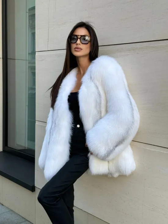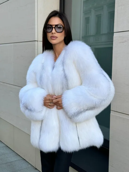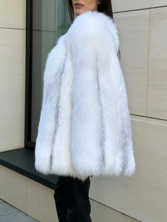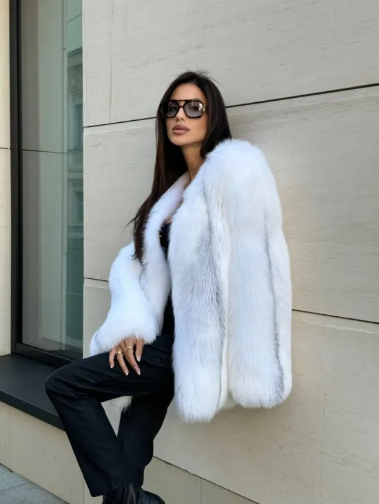 Мех данной шубы лиса, цвет белый. Предлагается в размерах от 40 до 50. Длина модели 70-75 см, что выгодно подчеркивает фигуру девушек. Эта модель идеально подойдет для девушек и женщин, предпочитающих роскошные натуральные меха.